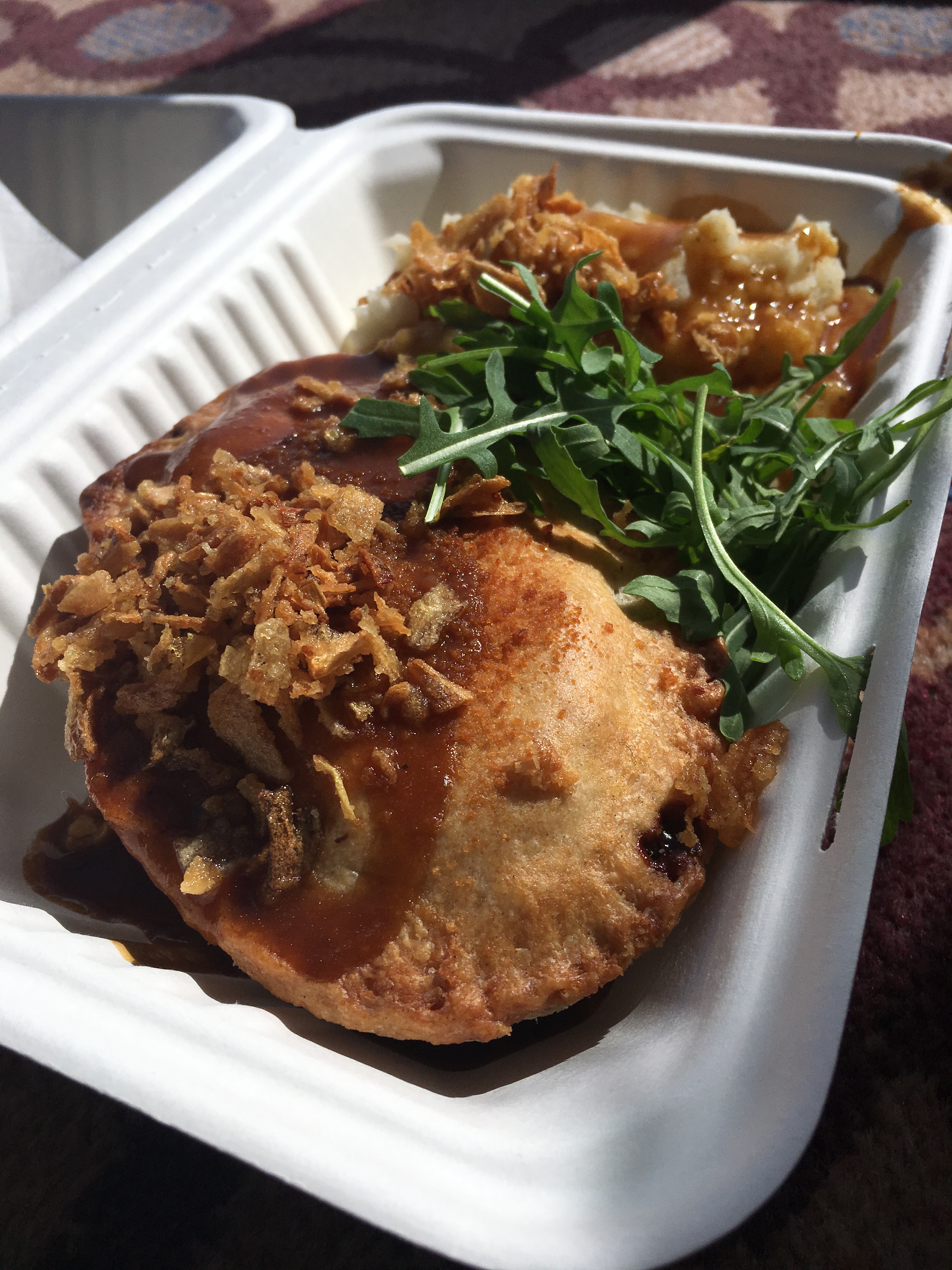 After deliberating over pizzas, burgers, flatbreads, fish and chips, and mac ‘n’ cheese, I finally landed on a seitan pie and mash from Young Vegans, served up with crispy onions and a rocket salad. This was my first time trying seitan and I absolutely loved this meal. It was meaty, filling comfort food at its best, and super reasonable at only £6. They’re regulars at Tottenham Green Market, and I might pay them another visit if I’m ever in the area! I also picked up a slice of battenberg (very sorry I don’t remember the name of the vendor who was selling this but I would love to be reminded so please do comment if you know!), and a mint chocolate brownie from Eat Dark Matters, as well as a curry pie from Mr Nice Pies to heat up for my boyfriend’s dinner when he got home from his day working; I’m nice like that ;). All in all it was a delicious day of over-eating and spending time in good company, which is pretty much a perfect Saturday in my book!