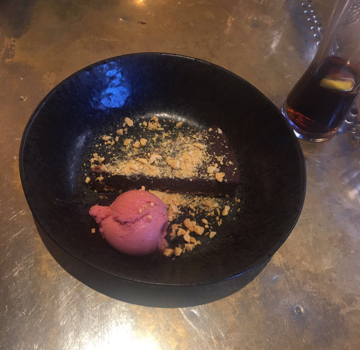 Lucy had also been desperate to try their new vegan dessert since they announced it recently, a sticky chocolate and praline torte. Shortly after she’d ordered, a waiter came over to say unfortunately they’d just run out of the chocolate and coconut ripple ice cream it was supposed to be served with, so offered strawberry sorbet instead, which was fine. I had half expected him to tell us that the torte had sold out, because I’ve seen that happening quite often to people on vegan Facebook groups when they’ve visited; obviously the demand for this vegan menu is even higher than Zizzi anticipated, which is great. The portion size was generous and the torte was very rich, so Lucy had a little help from Jamie to finish it off. I think she was happy she finally got to try it and it didn’t disappoint!