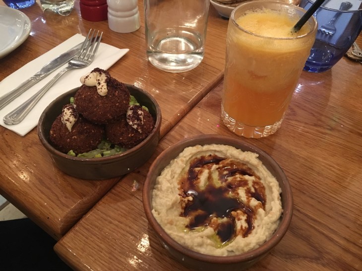 Jamie and I shared two starters, both of which were heavenly. Jamie went for falafel as he’s not super adventurous, and I chose the mutubal, which was described as burnt aubergine with tahini. I ignorantly expected it to be chunks of grilled aubergine with some tahini dip on the side, but when it came it was actually just a dip blended to a similar consistency to houmous. Both starters were a very reasonable size. We were completely won over by the smoky dip, Jamie tried a little bit at first but ended up definitely eating his fair share, it was so tasty. The falafels were some of the best I’ve had too. There were so many other vegan options that I’d love to try next time! You could easily go here for a tapas type meal selecting just from the starters.