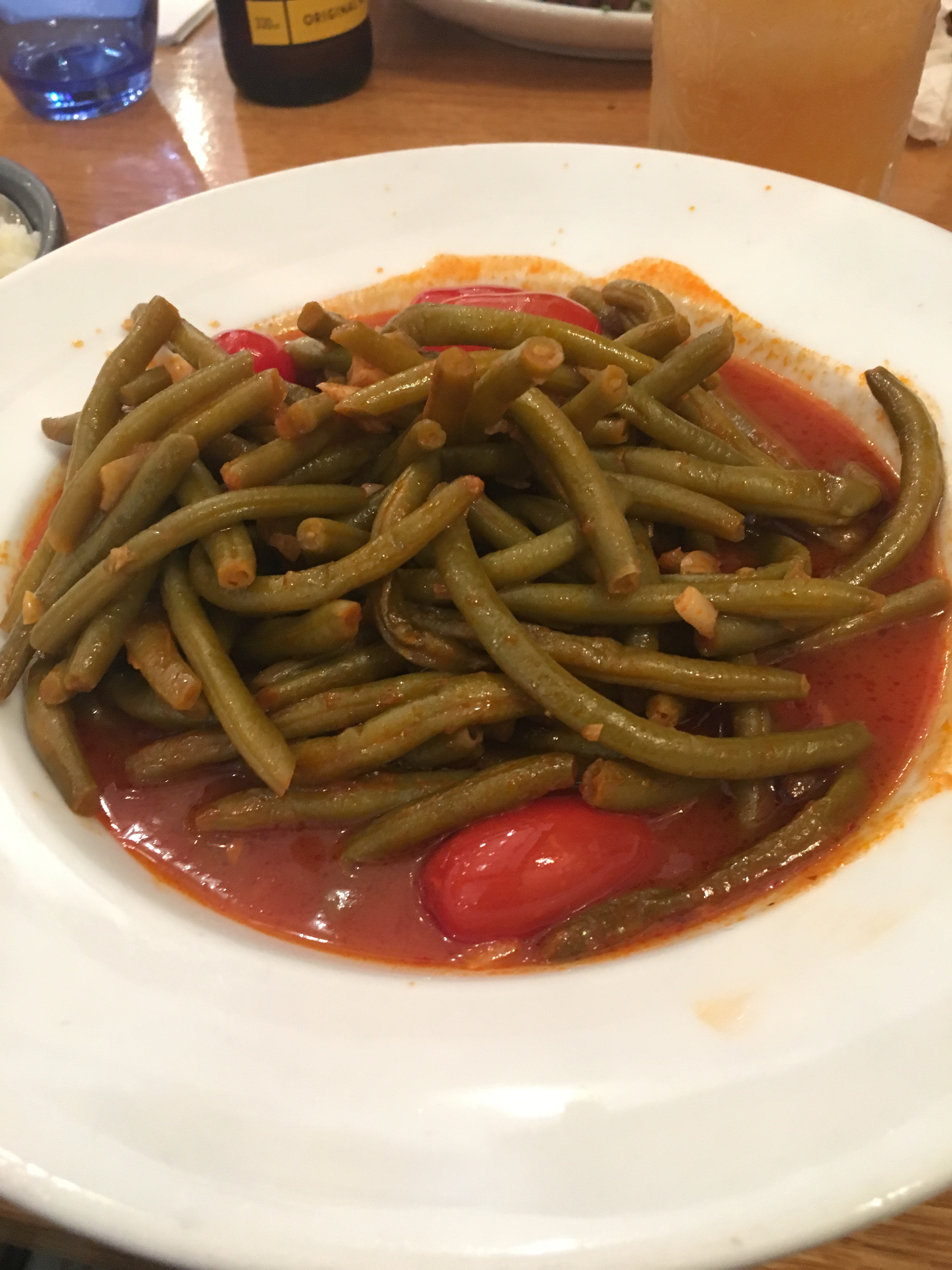 All five of the vegetarian main courses on the menu are vegan. There was also a veggie kebab mixed grill on the other main courses section, which without the halloumi would be totally fine as well. Someone else in our party ordered this, it looked amazing, and she said it tasted great too. I took a really long time to decide what I wanted to order for my main course, but ended up going for the fasoulia: french beans with a tomato sauce and a side of rice, which the waitress recommended over the bulgar wheat for this particular dish. It arrived as a big bowl full of tomato sauce with a huge mound of green beans and pomodorino tomatoes, with a separate bowl, also decent sized, for the rice. I ended up leaving about a third of it because there was just too much food! It’s a simple dish, but done really well. The sauce was amazingly rich, sweet and garlicky, and everything was cooked nicely. This is the sort of meal I’d never really think to cook at home but I’d happily eat like this every night! I’m really keen to go back and try some of the other dishes as they sound similarly delicious. We weren’t offered a dessert menu, so I think they really focus on the savoury dishes here, which was fine by me – I probably would’ve made myself feel ill if I’d tried to eat any more.
