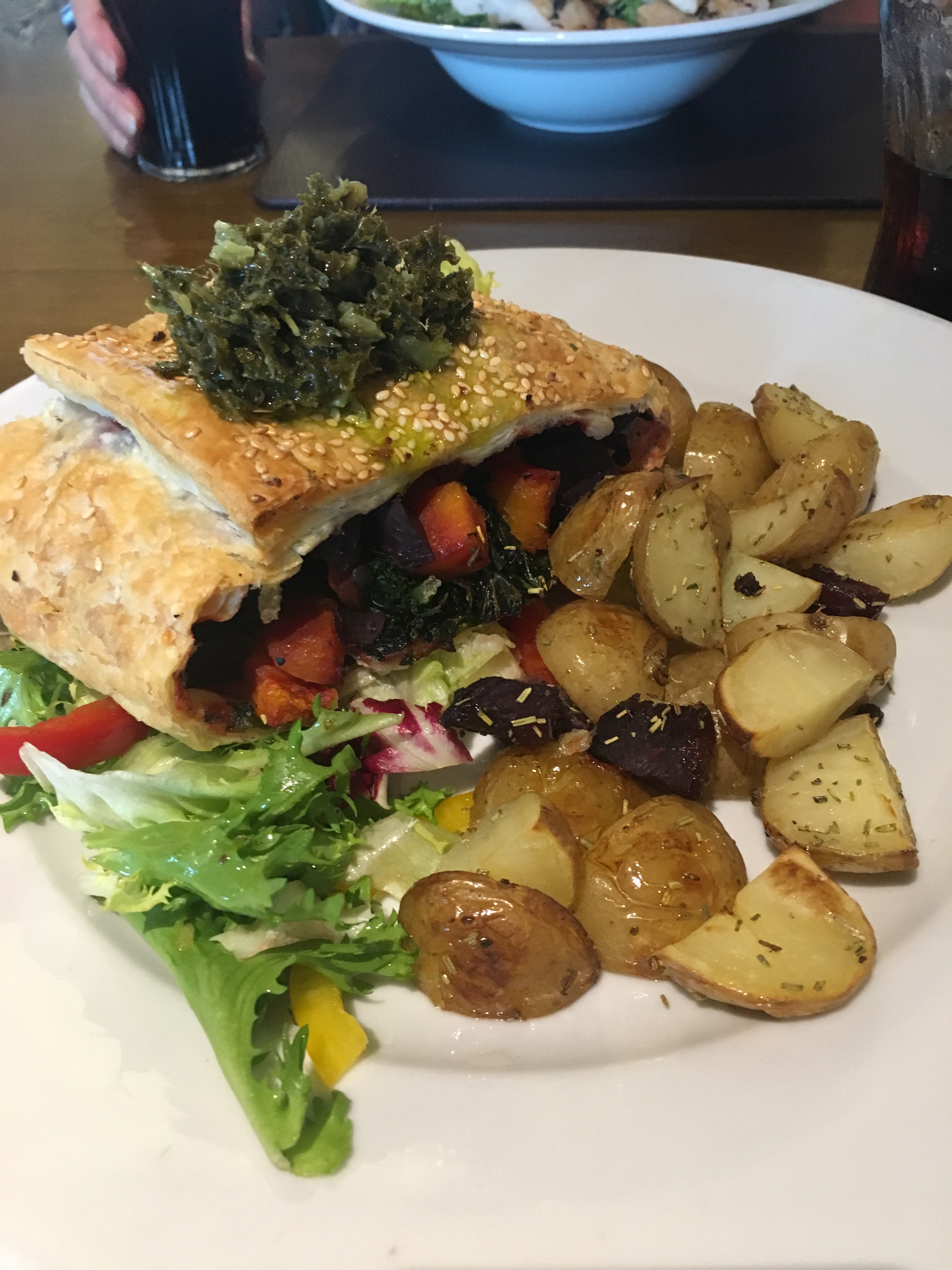 My sister ordered the BBQ tofu burger, so in the interests of seeing as much of their vegan food as possible, I went for the beetroot and squash wellington, served with new potatoes and salad. It was an incredibly hot day outside and this was a really nice meal to eat in that kind of weather. The pastry was crisp and the well-cooked beetroot and squash inside was plentiful. The potatoes were nicely seasoned. This was a really comforting, enjoyable meal, and the perfect portion size. I stole one of Lucy’s sweet potato fries, and let me tell you, this is how they should be cooked. They were delicious. Her burger looked fantastic as well, I wasn’t sure if it was going to be a patty made of a small amount of tofu mixed with other things, but it was a couple of decent BBQ marinaded pieces of actual tofu, piled with toppings, in a ciabatta bun. I think she enjoyed it!