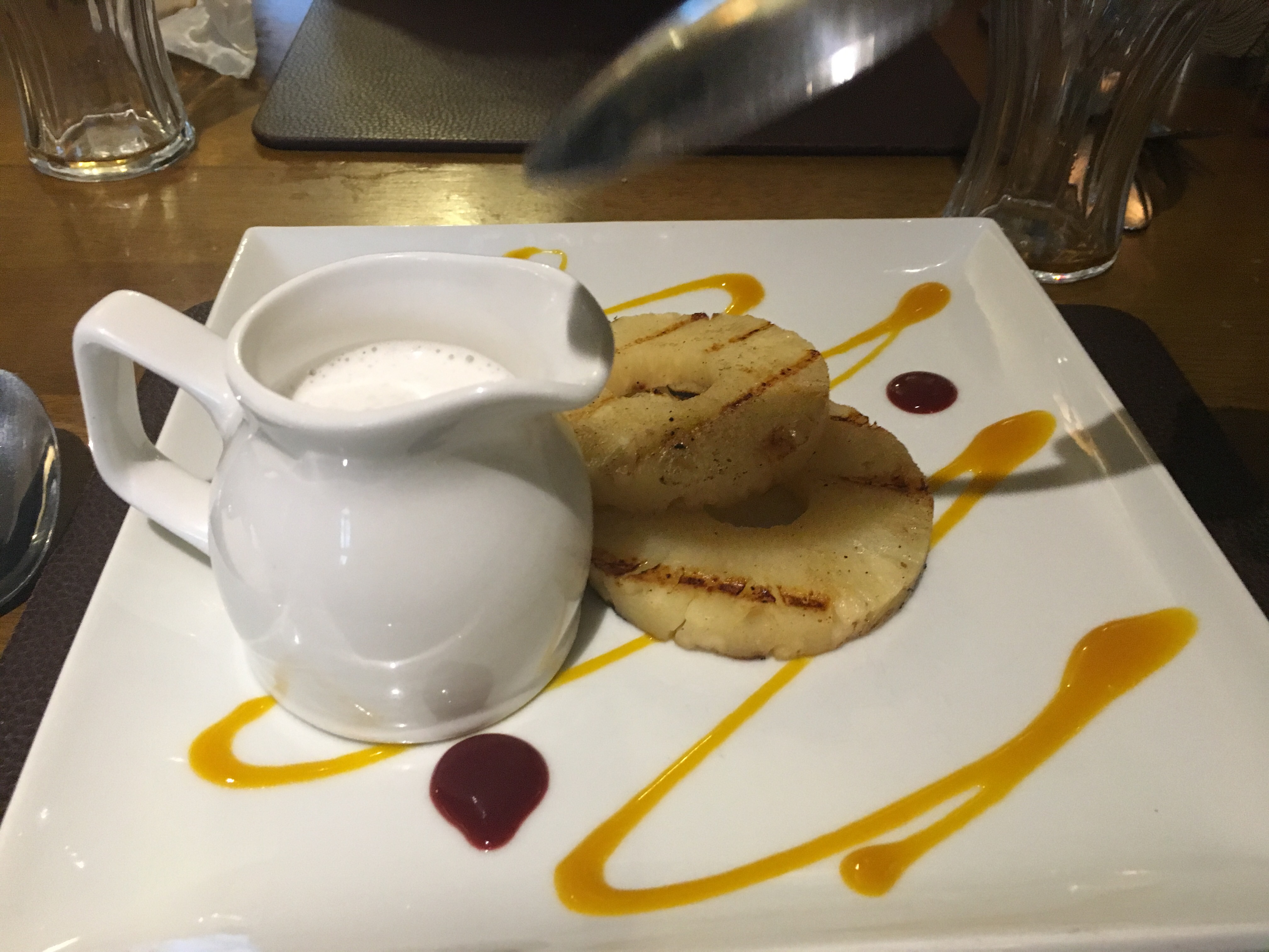 For dessert, I had such a hard time choosing what to go for, because all the dishes sounded fantastic. Had it not been so hot, I would probably have gone for the toffee and pear sponge, but because I was feeling fairly full and also very summery, I went for the grilled pineapple and coconut cream. This was the only part of the meal that was a bit underwhelming. I had imagined some nice fresh pineapple but I’m pretty sure these rings came straight out of a tin. I also thought the coconut cream would be solid rather than pouring cream for some reason. The jug of cream was huge compared to the two small pineapple rings, and I ended up leaving the jug half full, which I felt pretty guilty about (hate food waste). Still, the cinnamon marinade, fruit, and mild coconut flavour went will together, and I did enjoy the dish, it just was all a bit sweet and not as refreshing as I expected. I tried a bite of Lucy’s brownie, which was chewy on the outside and soft in the middle, and came served with cherry compote and ice cream. I definitely had dessert envy and was much more impressed with this dish.