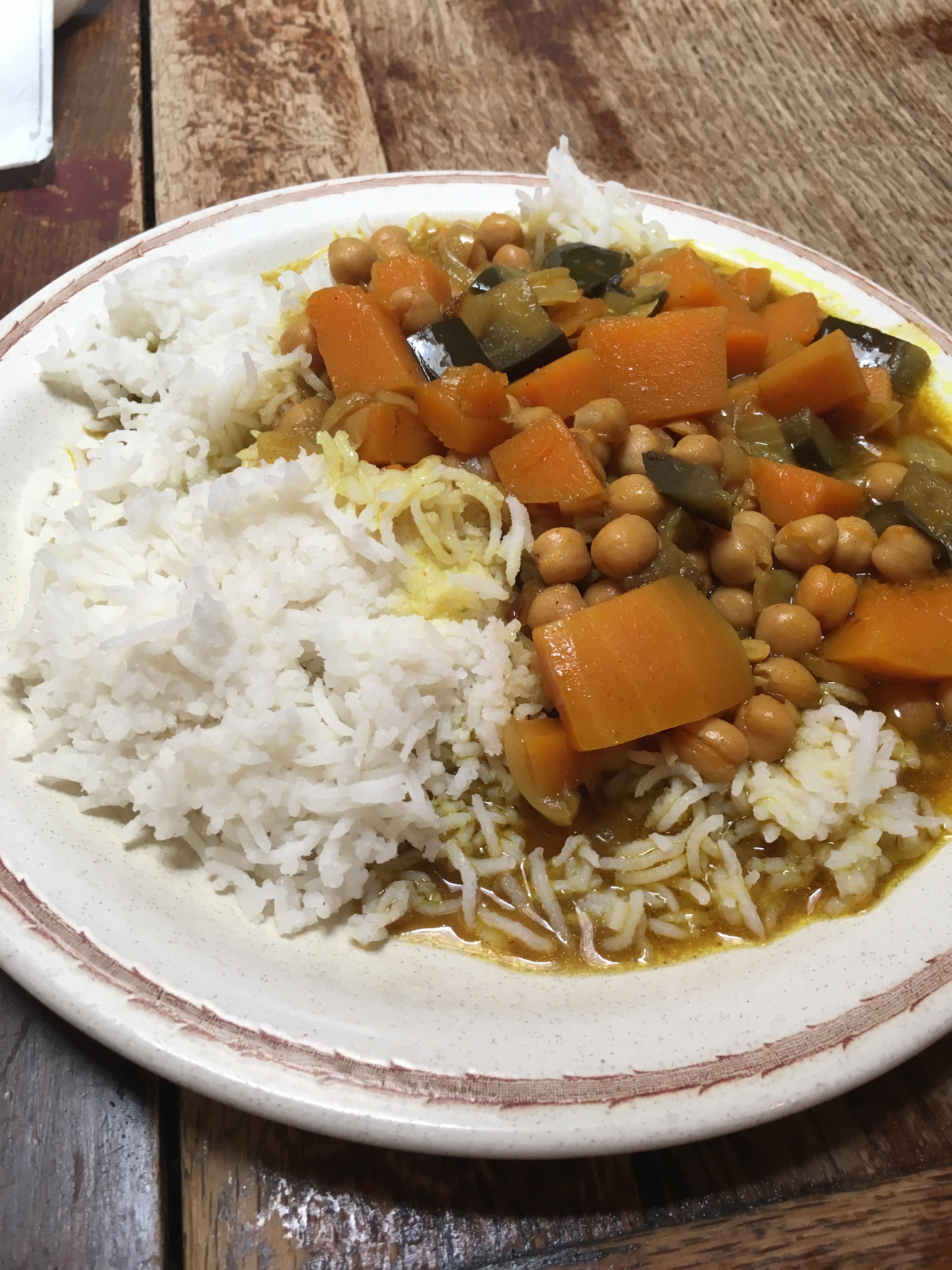 img_6681Today’s vegan dish was a chickpea korma (which I mistakenly and confusedly first read on the blackboard menu as chicken – doh). You could also go for a full plate of salad, of which four of the six dishes they had on offer were vegan. Both Jamie and I went for the curry as we were feeling pretty peckish, and upon seeing the lady in front of us in the queue being dished up a large steaming plate of goodness, we decided to follow suit. At only £6.50, the plate was very generously sized, big enough that you could easily get away with this being your main meal of the day. Alongside the chickpeas in the curry were pieces of aubergine, onion and butternut squash. The curry was mild and the sauce was a bit thinner than I would make at home, but it was very flavourful, and I almost burnt my mouth as I was so keen to tuck in because of how great it smelled. Jamie (a meat-eater) is not known to be super adventurous with his food when it comes to veggies, but he said he really enjoyed it too.