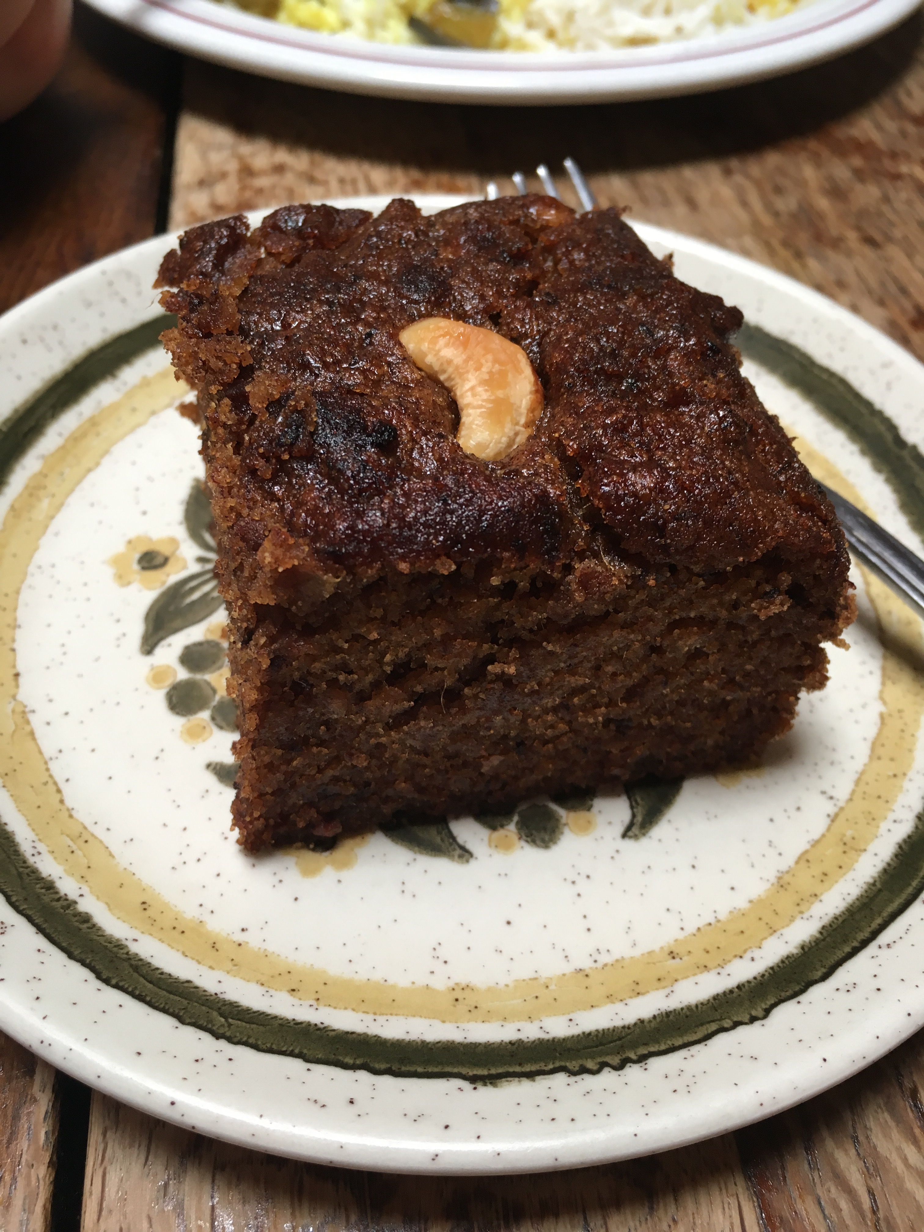 img_6684There were also two vegan cakes on offer on the menu: a spiced fruit cake, and a date and banana cake. I decided to get a slice of the latter, which was heated up and kindly brought over to our table shortly after we’d started eating our mains. This cake smelled like it was full of aromatic spices, and they were the overwhelming flavour rather than the banana (surprising, considering how strong banana usually is). If you don’t like dates this would obviously be one to avoid, as it really was full of them, so the texture was pretty grainy. Still, it was a tasty, comforting pudding to round off the meal with.