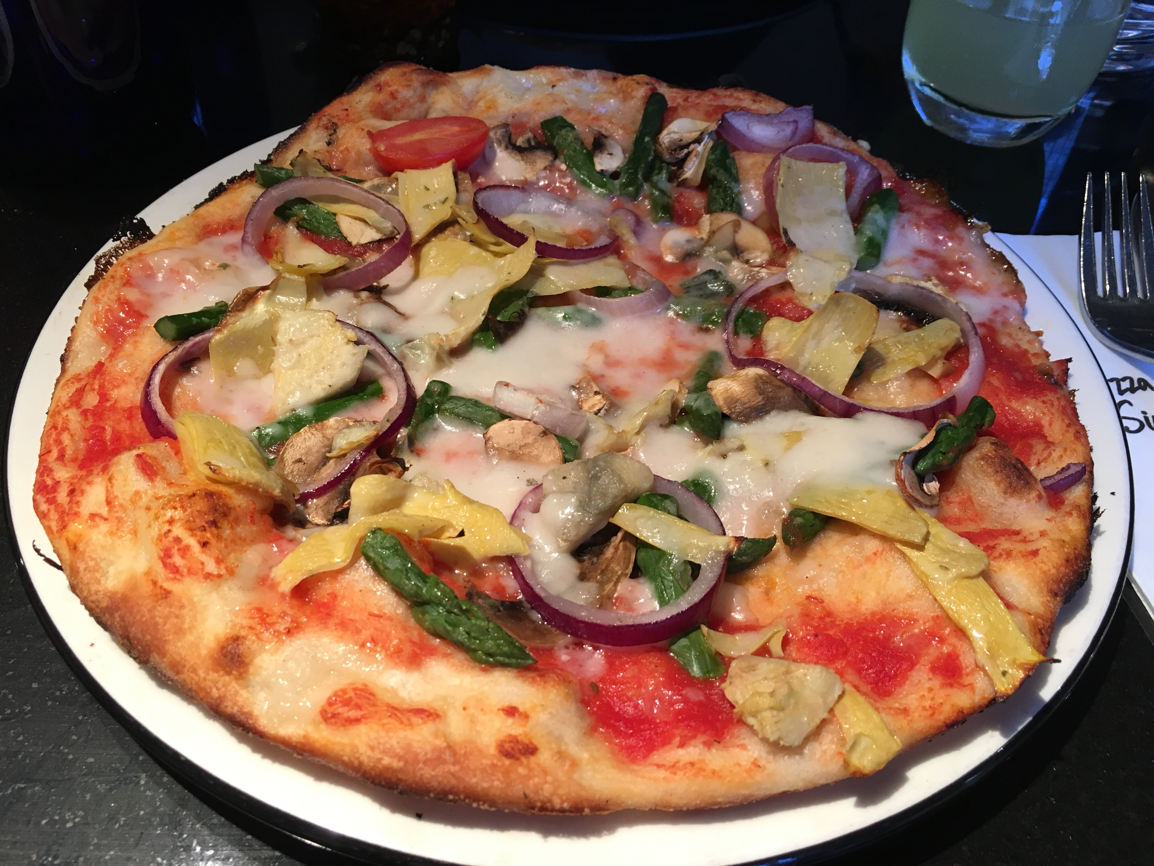 For my main course, I ordered the new Vegan Giardiniera pizza, swapping out the olives for mushrooms. What is it with restaurants being just desperate to put olives in the vegan options, aren’t they quite a love-hate food? Despite the slow service at the start, the kitchen seemed to have got back on track and our main courses came out really quickly. I was happy to see that compared to other vegan pizzas I’ve had at restaurants, this one came with an abundance of vegan cheese AND toppings (it usually ends up being one or the other). Pizza Express use Mozzarisella, favoured by many restaurants offering a vegan pizza, and definitely favoured by me! Having now tested a fair few, I think Pizza Express are the winners of the chain restaurant vegan pizza so far.