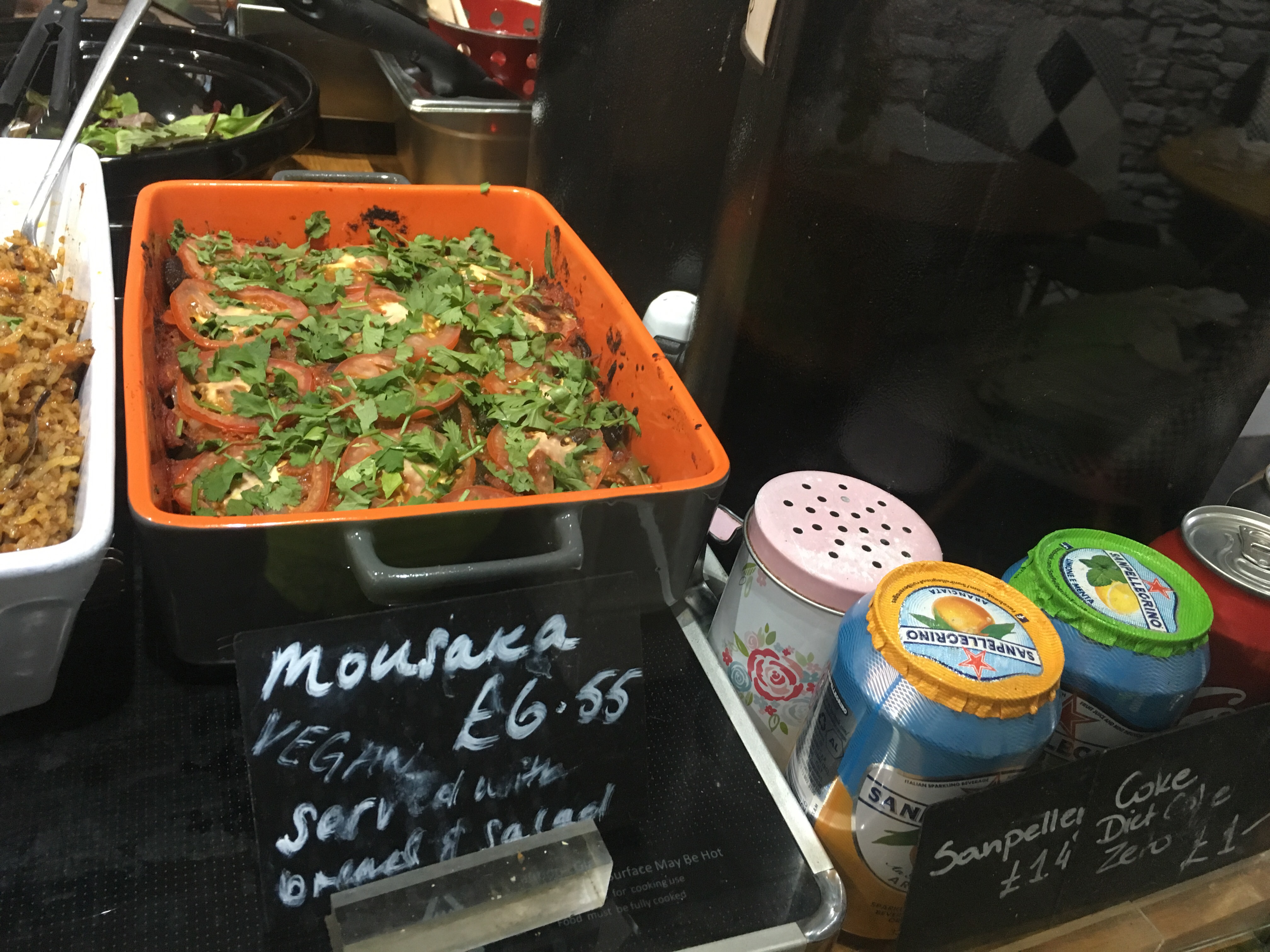 When I first entered the cafe, no one really acknowledged that I was there. After a little while of pointedly peering at what they had on offer, a lady behind the counter finally showed me some attention and I was able to ask what their new vegan salads consisted of. She pointed at a bowl of iceberg lettuce with a couple of slices of tomato, cucumber, and olives in, and said that that was it. Besides the fact that I don’t like olives, it was a pretty small bowl and I knew it wouldn’t remotely fill me up. Luckily they’d labelled one of their dishes on the hot counter as vegan (albeit the sign was in front of the wrong thing) so I asked to have that to takeaway instead. All of the other dishes on their menu have different prices for eat in and takeaway, but for some reason these couple of dishes are the same regardless, and I couldn’t help but feel that I wasn’t getting the best deal when I saw the size of the plastic tray compared to the plates for eating in. I accepted a side of rice, which the man who appeared from the kitchen to serve me said was also vegan (although for some reason they haven’t labelled it up like the other dishes). I didn’t realise that this was being offered to me in place of the bread and salad that the mousaka is advertised as coming with, so I asked about that, and he explained it was either/or, but that it was no problem to give me a side salad as well on this occasion. He put about three leaves of lettuce in a takeaway cup and drowned it in dressing – I do appreciate the sentiment and don’t mean to sound ungrateful, but I felt it wasn’t worth the effort to be honest.