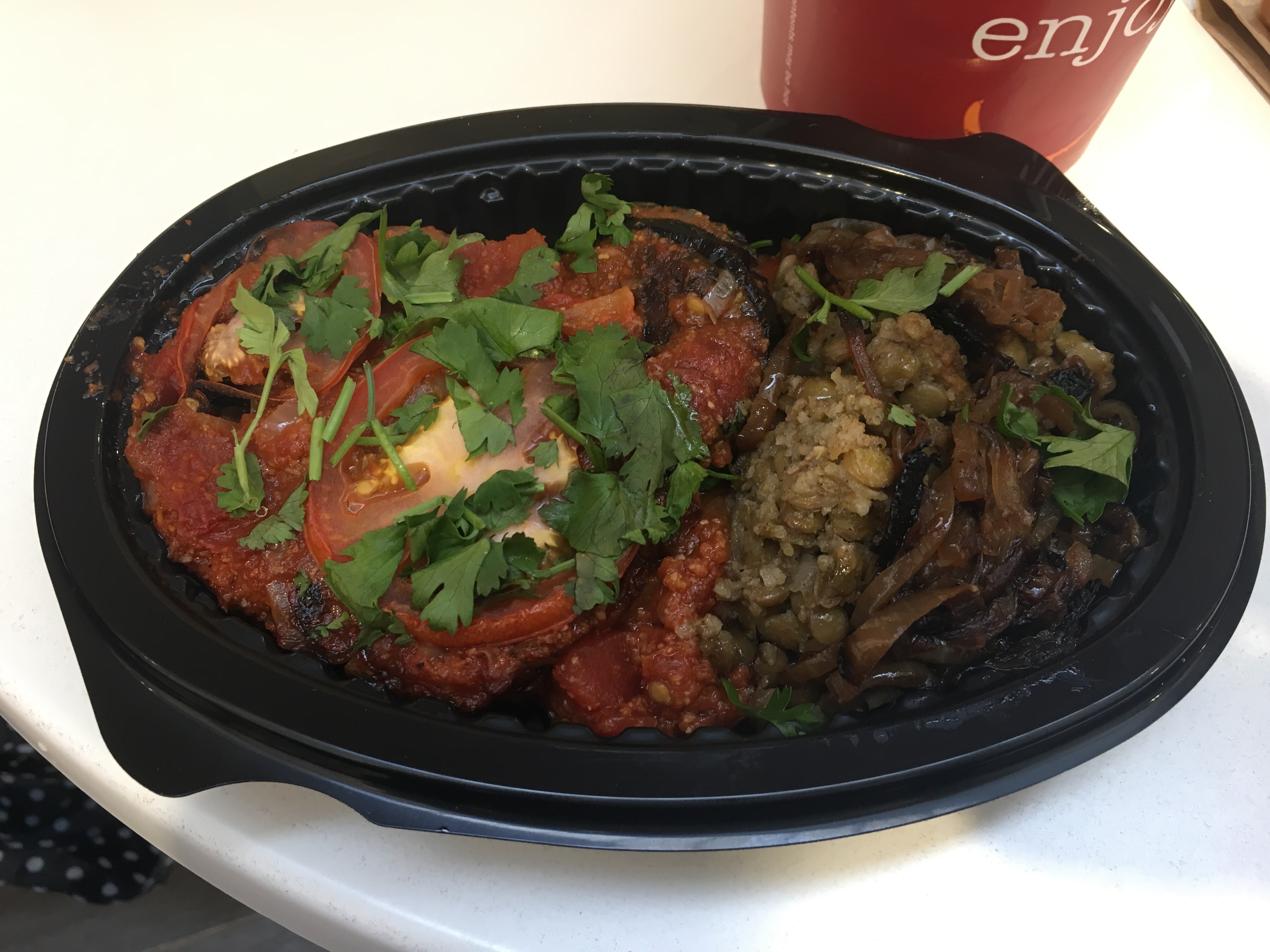 Despite the above, I do have to say that the food that I did eat was really nice. Each element of the mousaka was well-cooked, with the more bitter flavour of the soft green pepper working really well with the sweet tomato sauce, and the aubergines melted in your mouth. The seasoning was spot on, and it was the same for the rice and lentil mixture. The texture of that kind of reminded me of stuffing and it made a nice addition to the softer mousaka. I just felt a bit disappointed at the portion size, because for £7, when we know the ingredients cost pennies compared to with meat dishes, it was quite a small tray of food and I still found myself snacking in the afternoon. So tasty food, but nothing you can’t really do at home fairly easily for less.