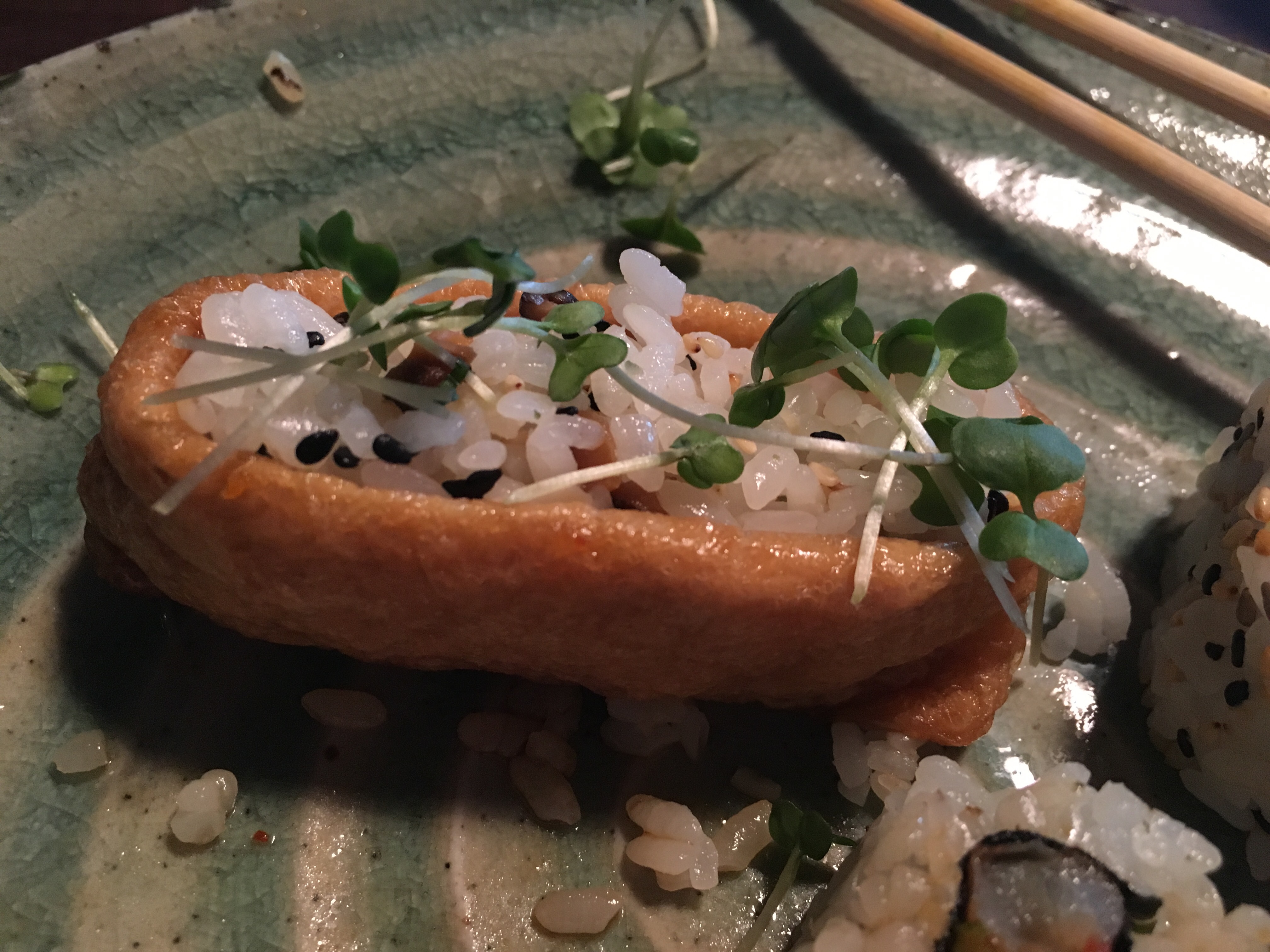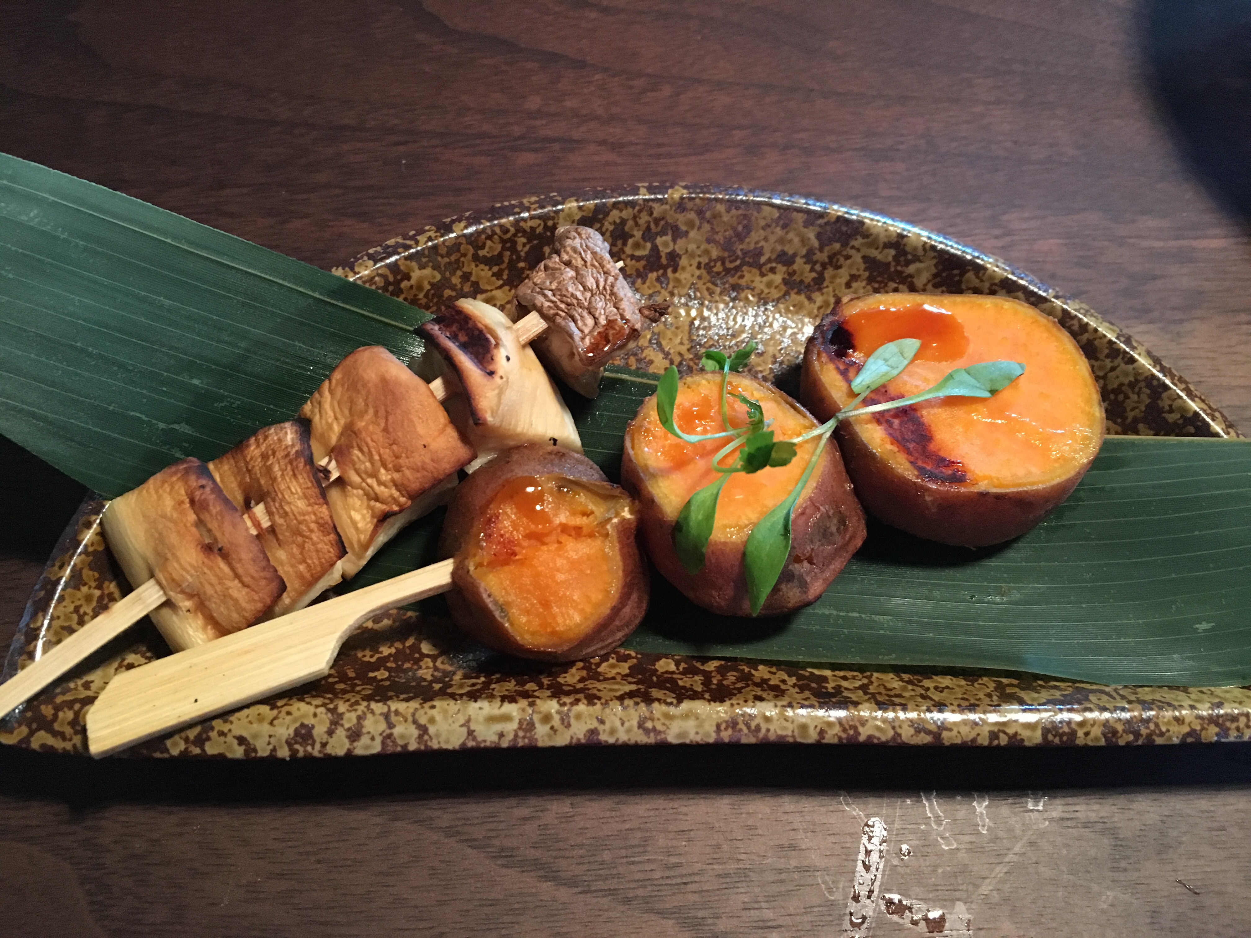 Although I was feeling very full, our plates were whisked away and yet more food presented on the table. Next up were the ‘sticks’, of which I was served satsumaimo yaki (grilled sweet potato) and eringi (king oyster mushroom) skewers. These were the slightly more underwhelming part of the meal, as though they were well cooked, I believe the dressings they usually come with are not vegan, so it literally was just plain sweet potato and mushroom. I enjoyed the mushroom one as it was meaty and still quite flavourful, but the sweet potato I felt I would have been disappointed if I’d have paid for it (at £2.20, for something gone in two mouthfuls).