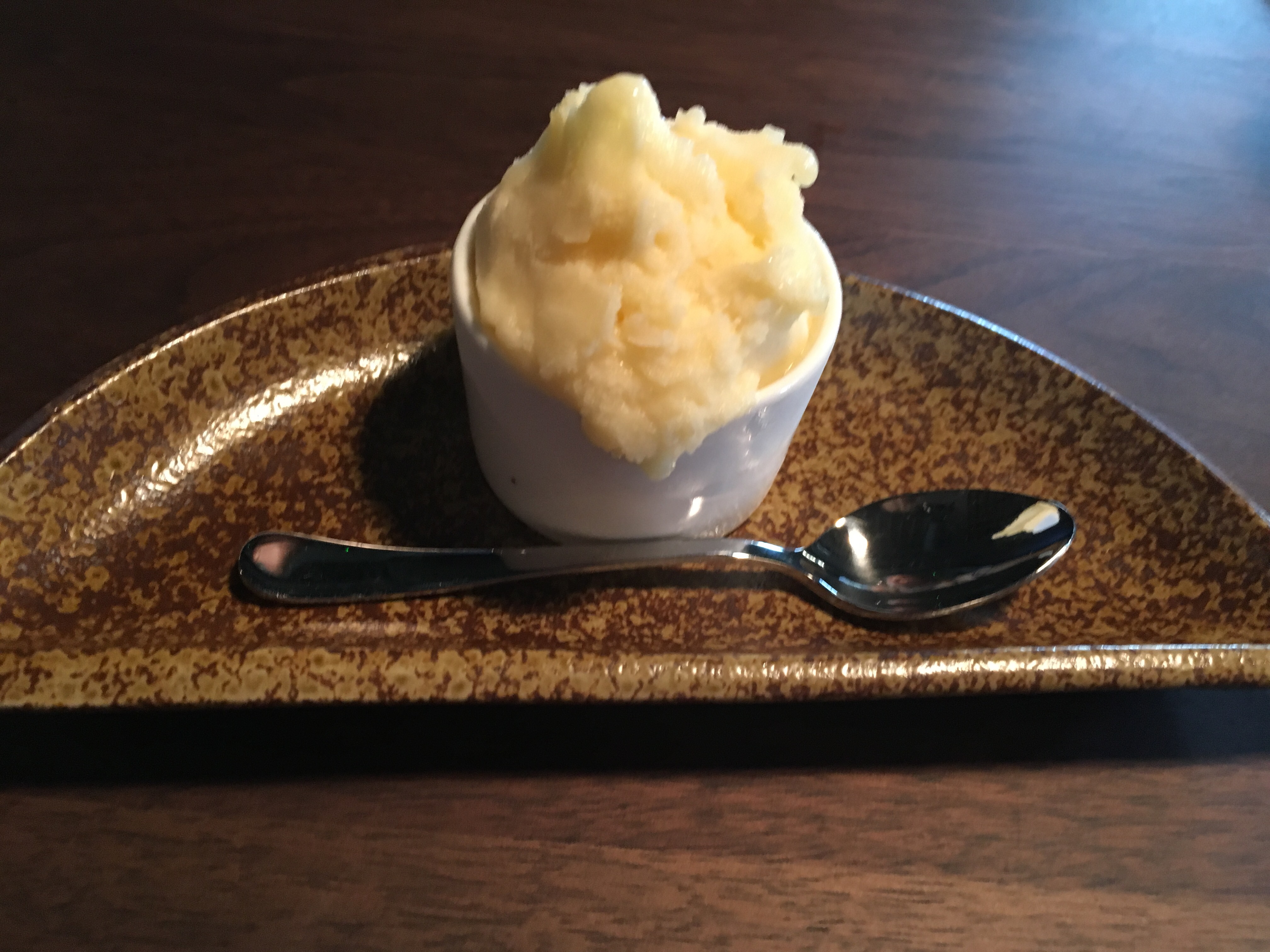 Last but not least, we were brought out dessert. There are 12 little sweet pots on their menu, but only one of them is vegan sadly, and no prizes for guessing that it’s a sorbet. However, after eating so much food it was nice to have something to cleanse my palette, and the yuzu sorbet I was served was definitely the nicest flavour I’ve ever tried. It had a smooth, creamy texture closer to ice cream, and the citrus was very refreshing.