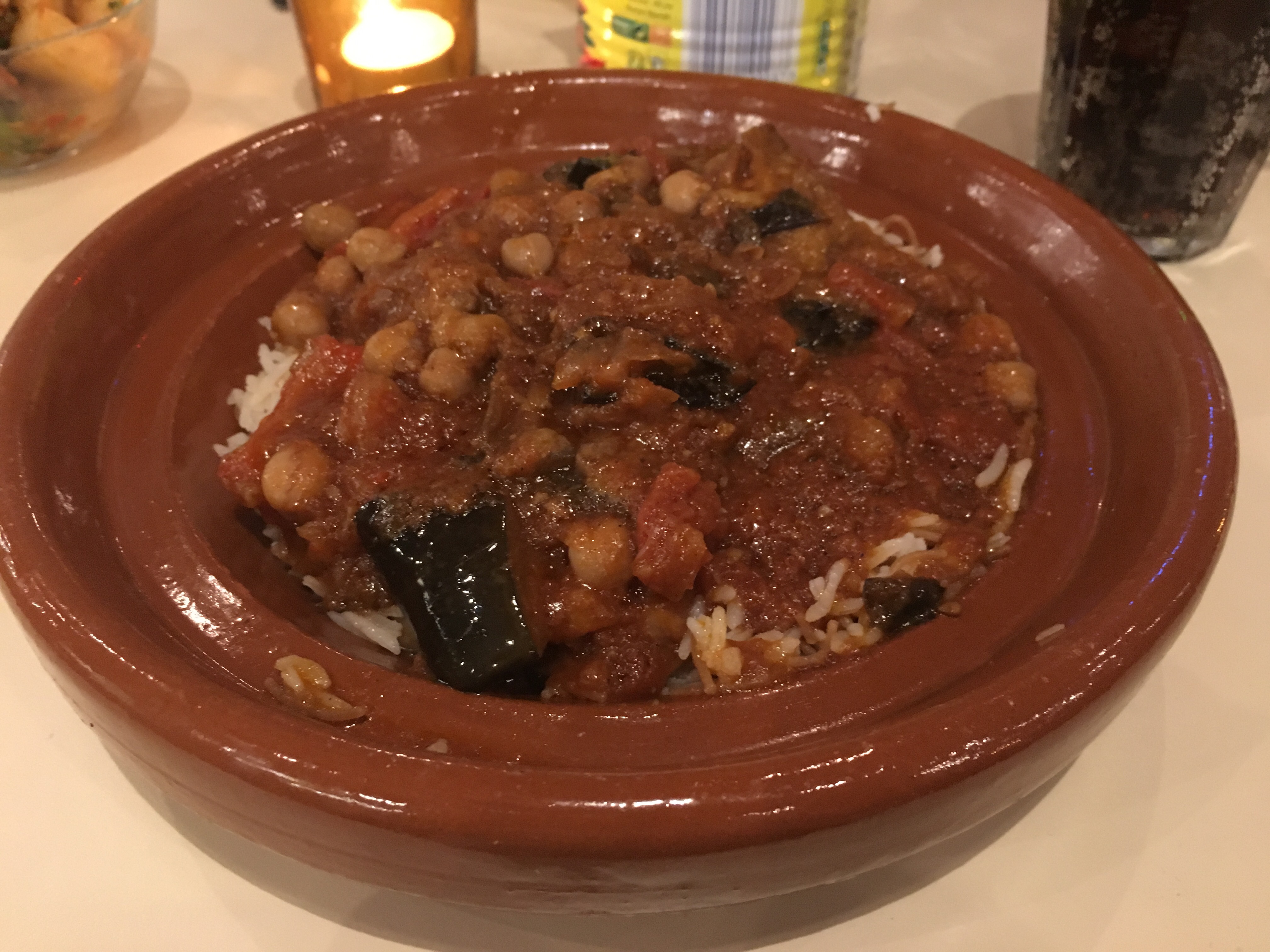For the sake of sampling as much food as I could stomach for the review (ahem), I decided to try a main and a couple of mezze. I was deliberating between two which sounded like it might be possible to veganise if the dressing/sauce was removed. I checked with the waiter taking our order whether the Baba Ganuj was definitely vegan, but he had never heard the word before, which I was quite surprised at. I tried to rephrase and asked if the dip contained dairy or egg but he still didn’t understand what I meant, and had to get someone else over to help. We got there in the end and at least now hopefully any future vegans who visit won’t have the same trouble! Because of all the faff I decided I’d go for the safe option with my main and order the one I was positive was vegan, minus the garnish, the aubergine tagine.