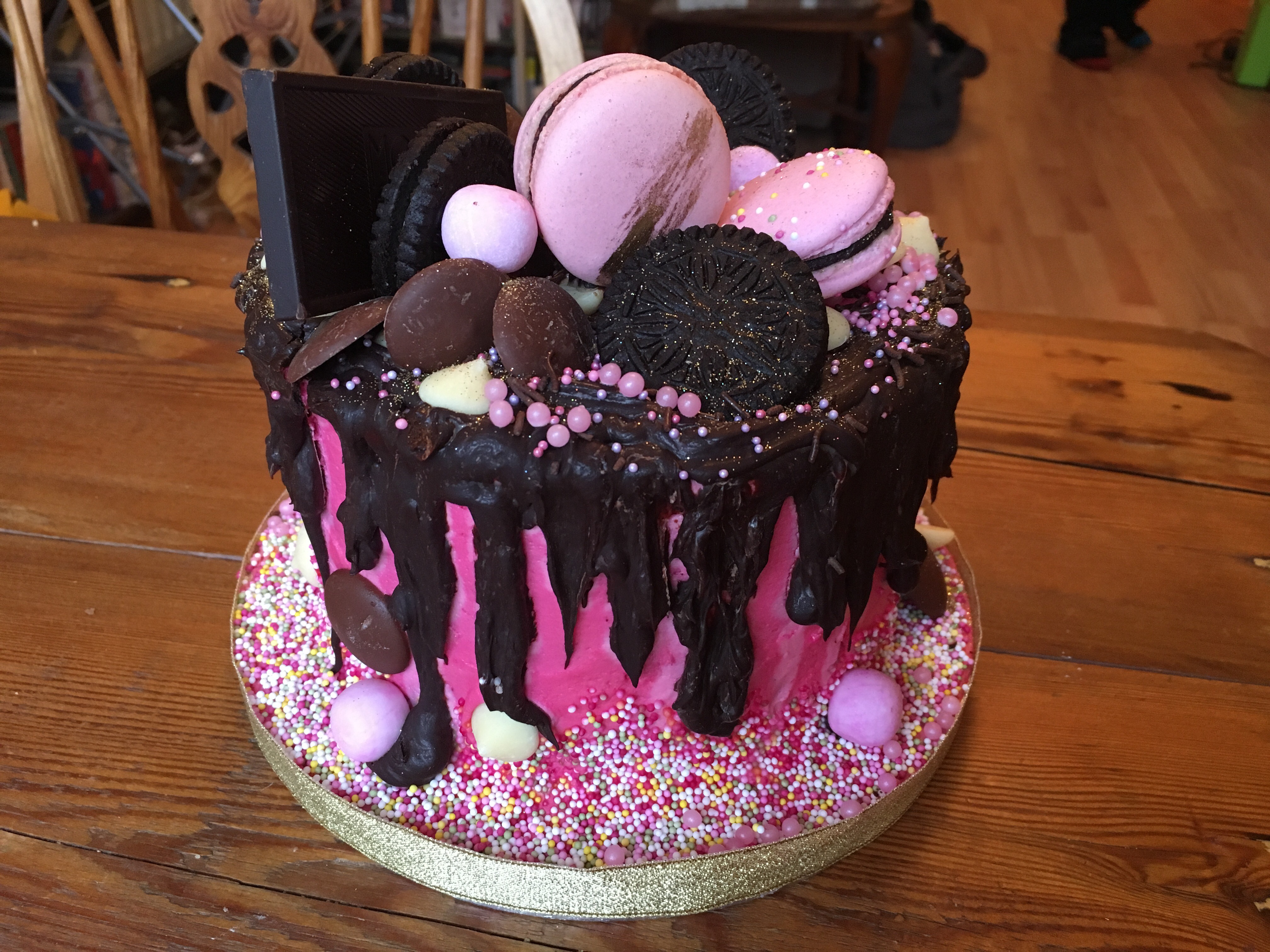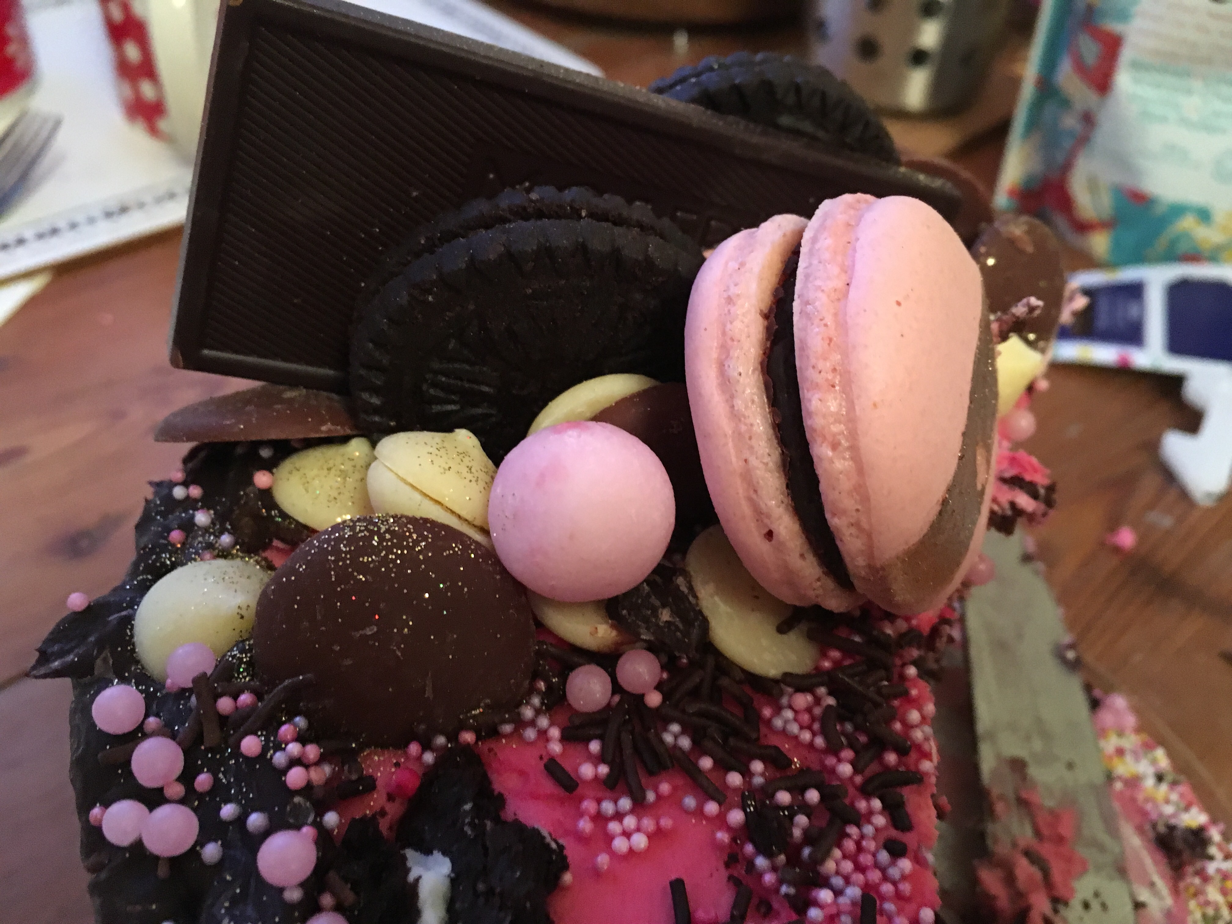 I don’t need to say too much because the pictures speak for themselves, but when I collected the cake the night before, I was so excited when Isabelle lifted the lid of the box. She’d masterfully baked and decorated a layered chocolate sponge drip cake, covered in a bright pink buttercream icing with dark chocolate dripping down the sides, topped with all manner of vegan goodies. Strawberry bonbons, cookies and cream biscuits, a dark chocolate bar, white and milk chocolate buttons, and lots of pink sprinkles and glitter. She’d even made some gorgeous pink vegan macarons using aquafaba (the brine from a tin of chickpeas, which perfectly replicates egg whites when whipped)!