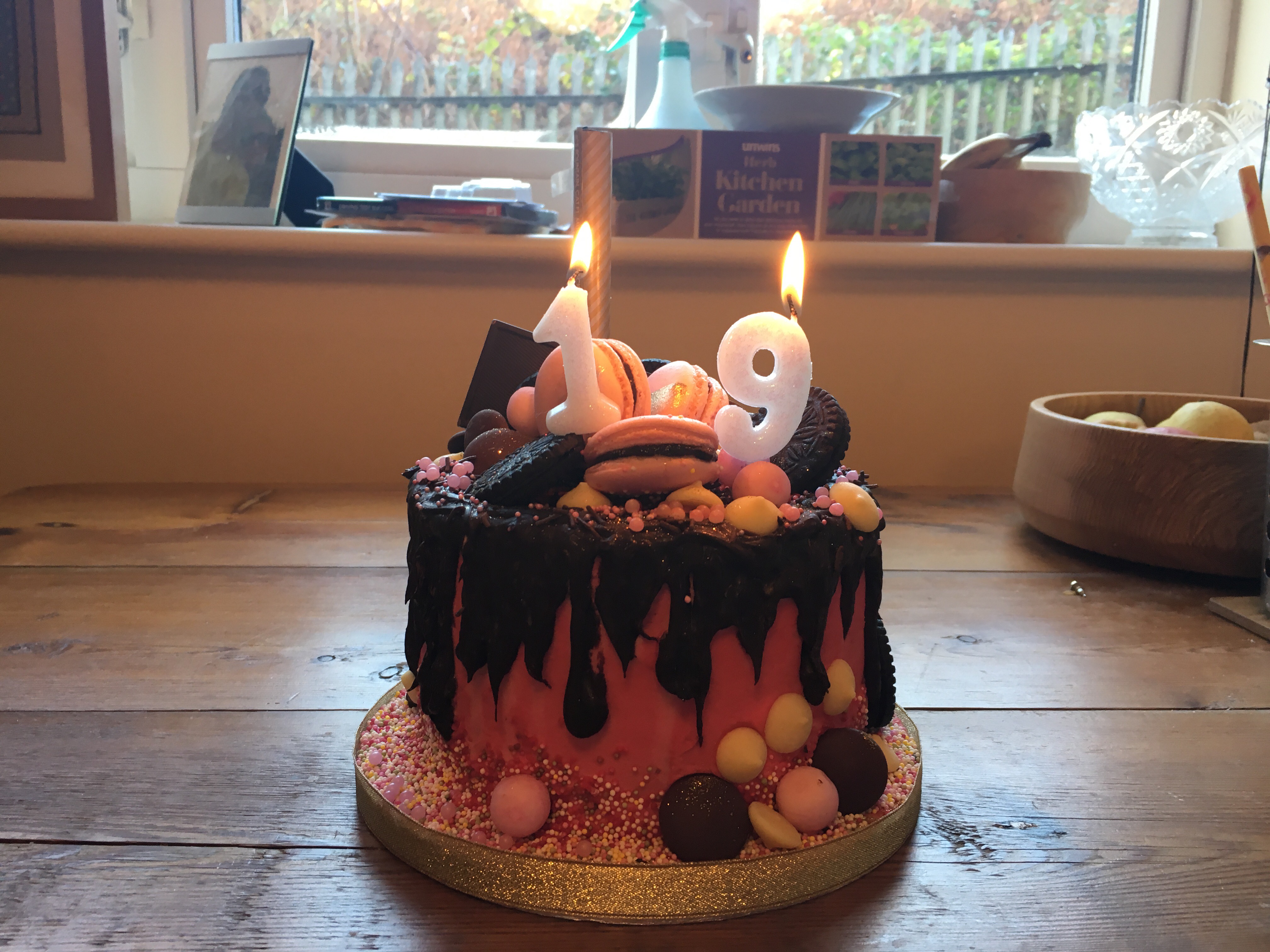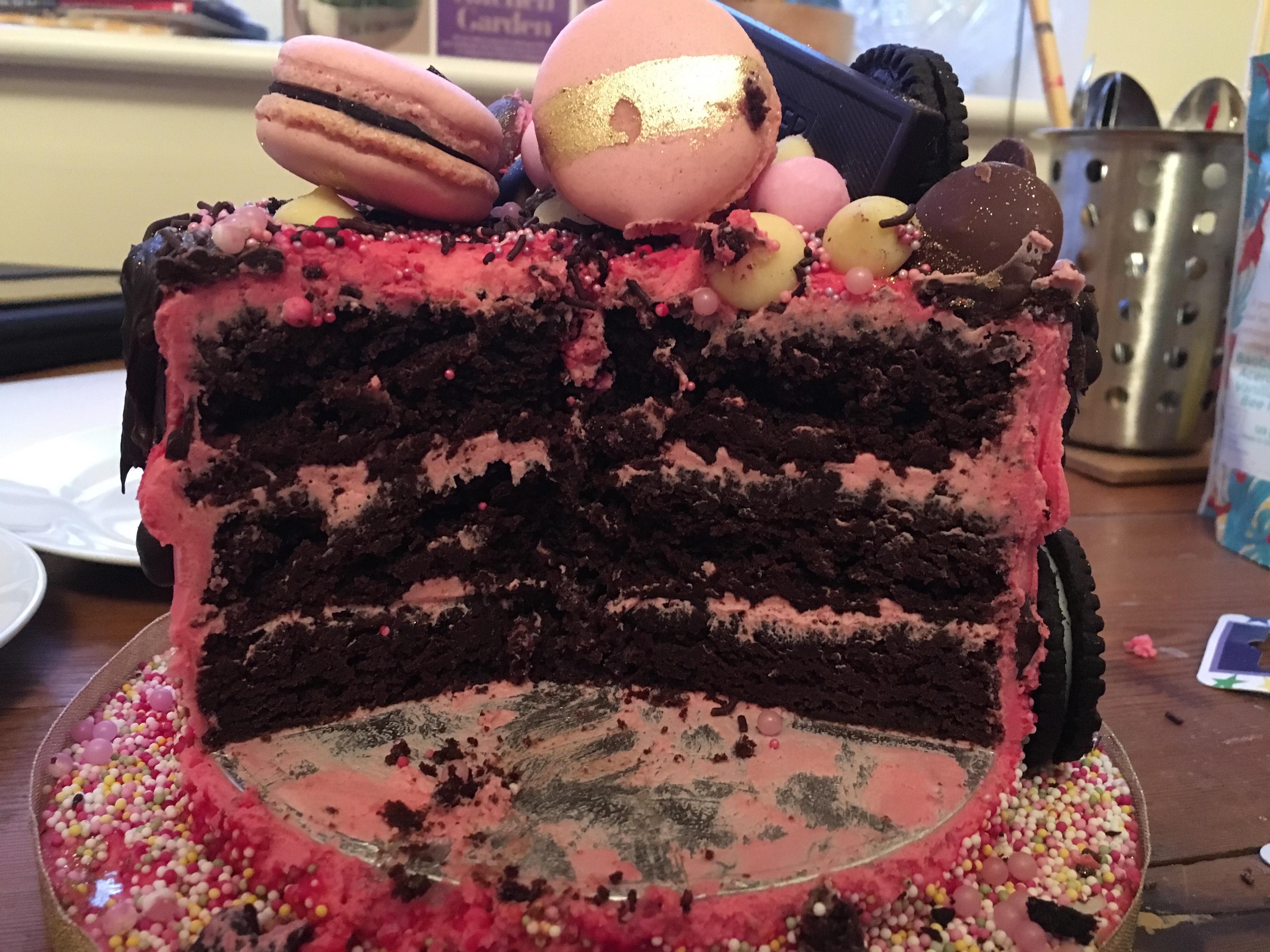 After a day out in Oxford, we returned home for tea, cake, and candles. When we cut into it, three gorgeous layers of rich chocolate cake were sandwiched with pink vanilla buttercream. Isabelle told me she had adapted one of her brownie recipes for the layers, which meant they were extra decadent. The cake was incredibly rich and the amount of icing on top was generous so it only took a small slice to fill me up, especially along with nibbling on some of the toppings. Lucy was left with comfortably more than half of the cake to take back to university with her to share with her friends.