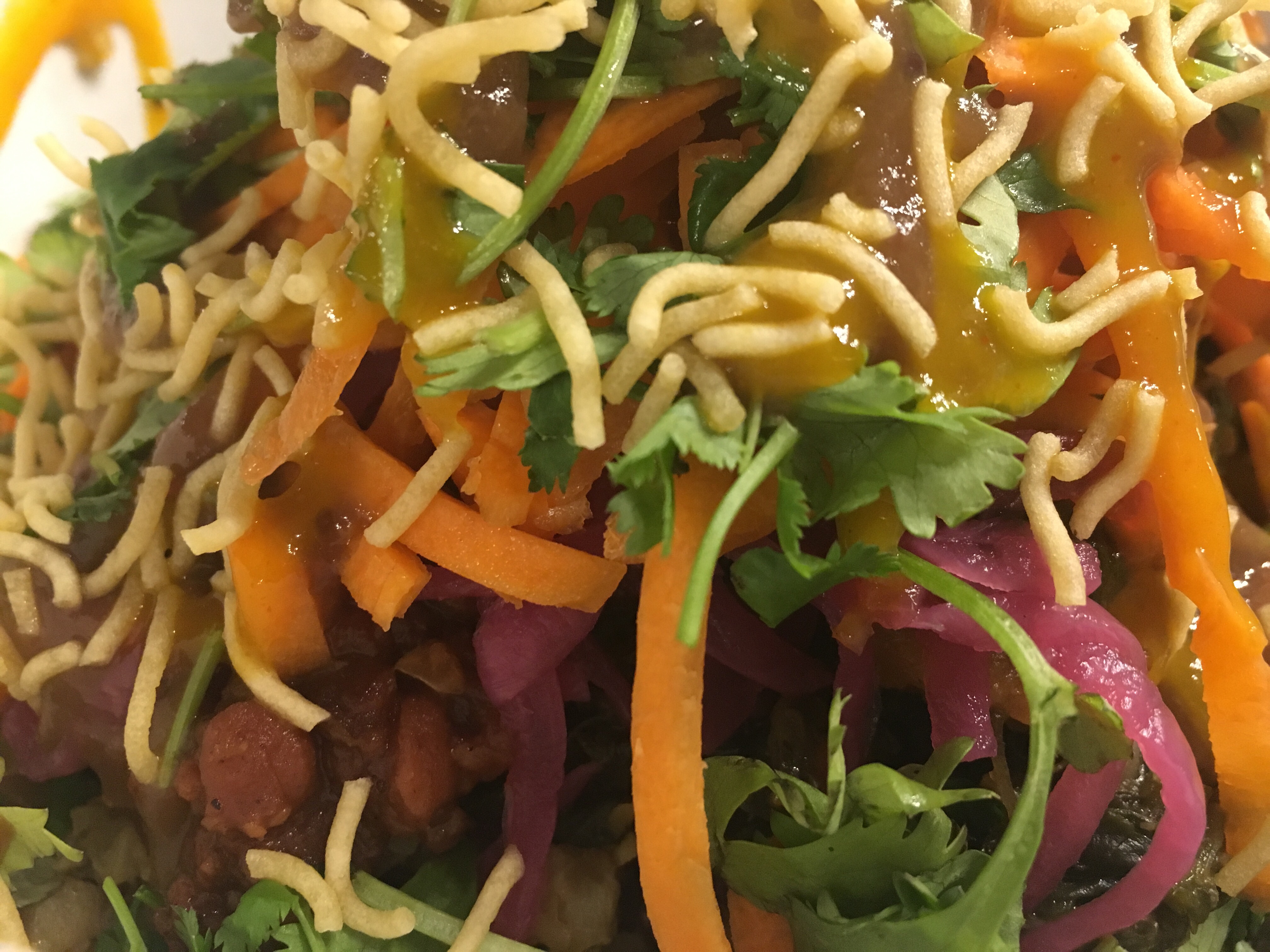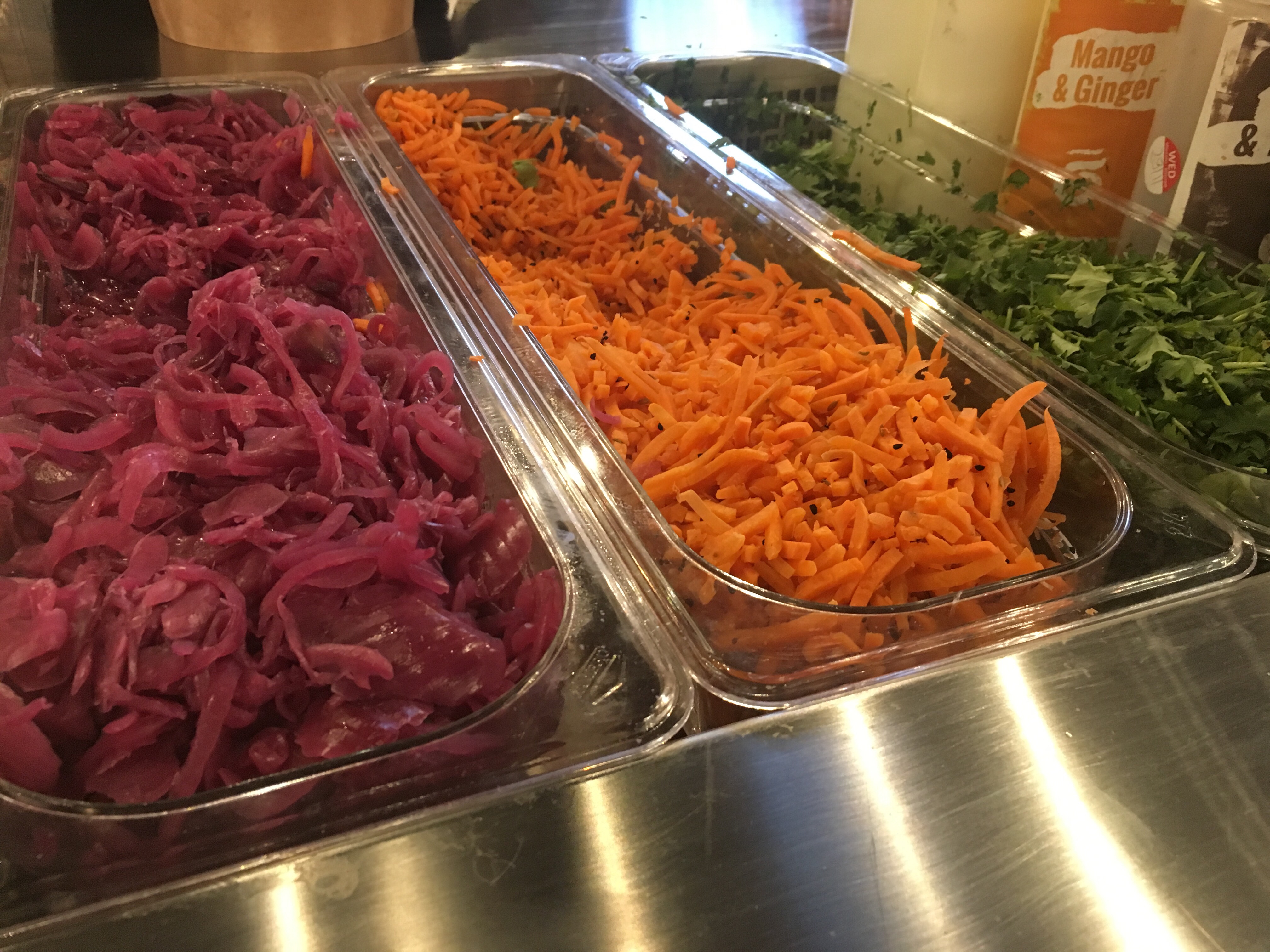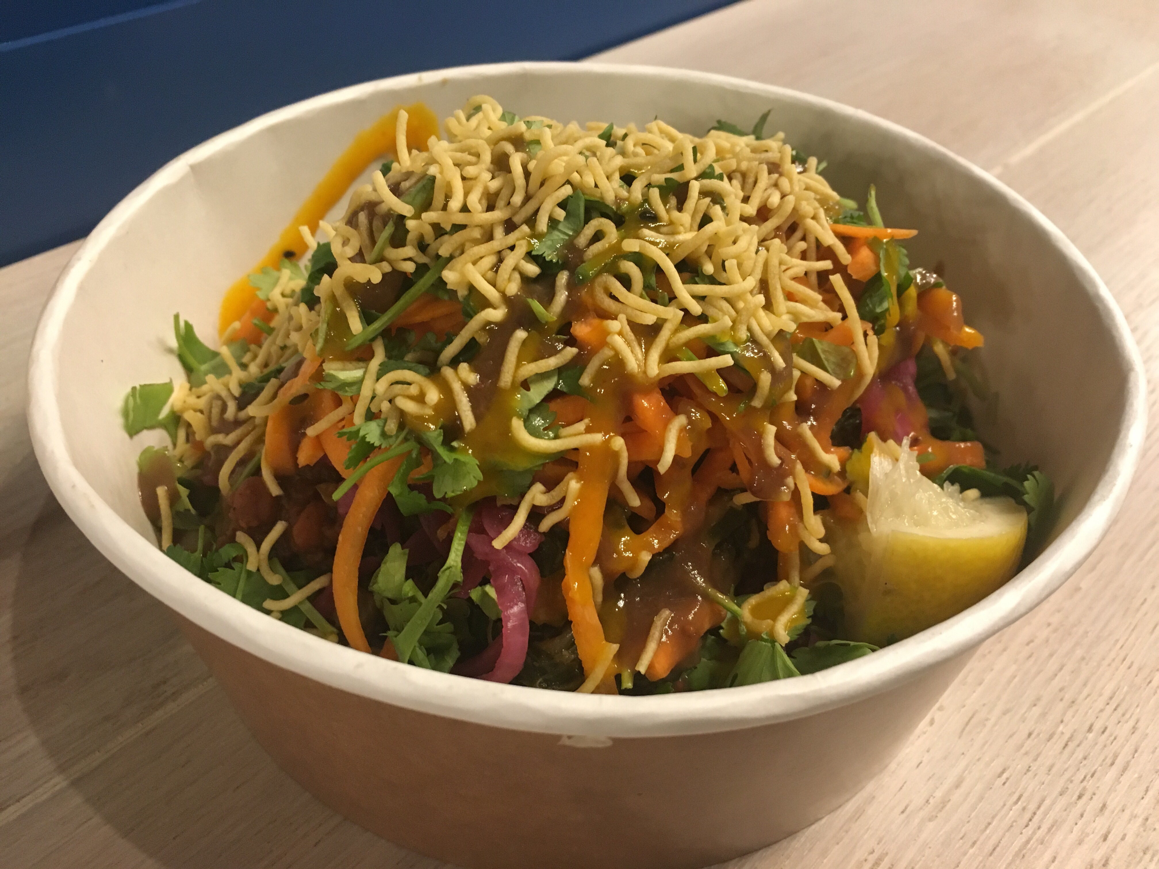 Along with your bowl or roll you’re offered a choice of salad and dressings. Mark hopes customers don’t turn down any of the salad options, as to remove any one of them affects the balance of the dish, and I would agree that your meal would be missing something if you don’t go for everything that’s available. The acidity of the lightly pickled onion offers a nice contrast to the sweetness of some of the fillings. There’s also fresh grated carrot tossed with turmeric and onion seeds, and sev, crunchy gluten-free strands of chickpea flour, which add texture. Finally everything is topped off with a squeeze of leamon and a very generous handful of coriander, which I know can be a controversial herb, but it’s the perfect garnish for these dishes.