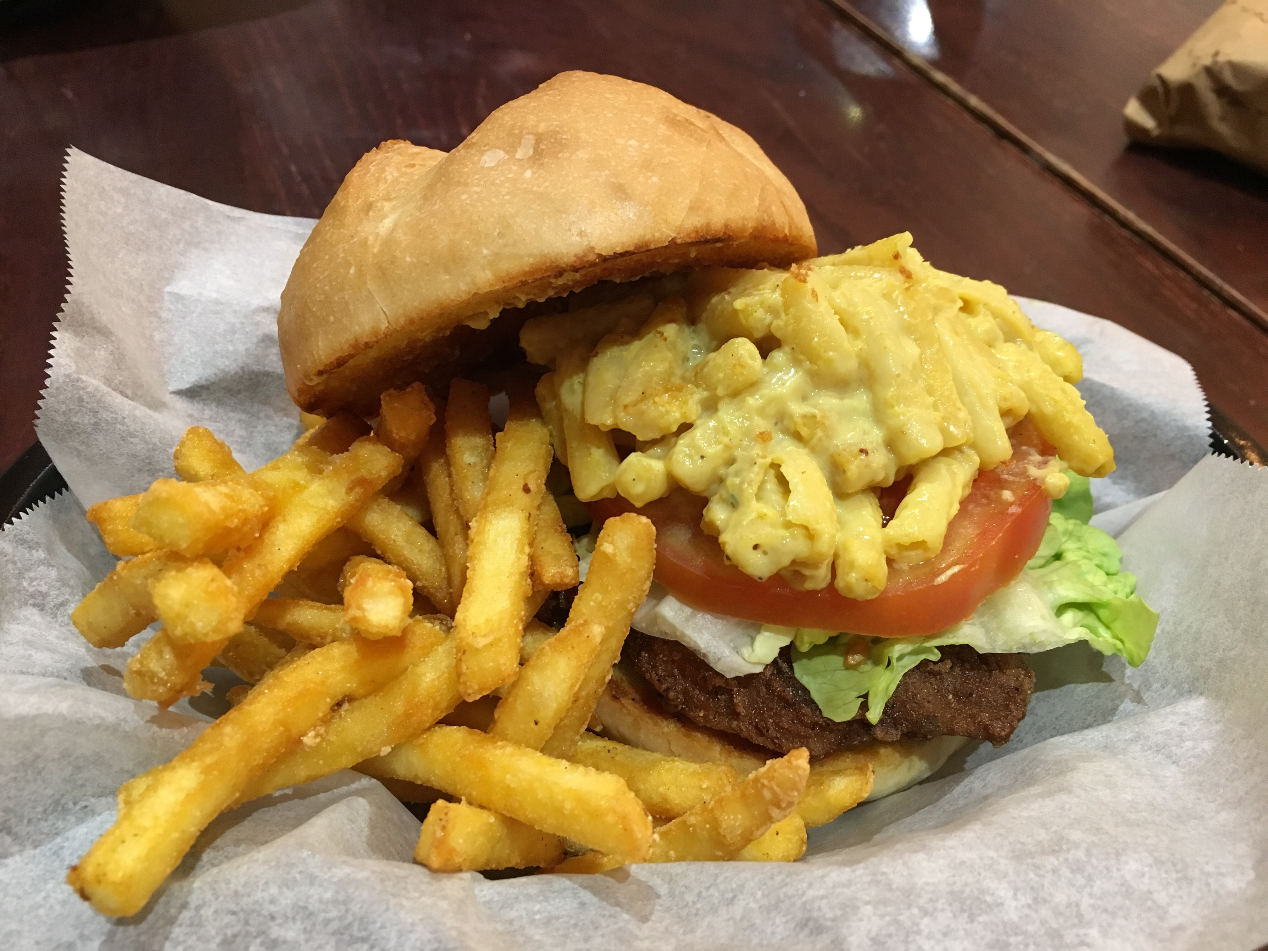 I decided on the Mac Daddy, a fried chicken-style seitan burger, topped with mac ’n’ cheese, in a bun with salad and fries on the side. The seitan burger was perfectly crispy on the outside and the texture was pretty accurate to what you expect from a chicken burger. The seasoning was spot on too, and it was one of the tastiest things I’ve eaten in a while – world’s away from the awful Byron Burger I had not long previously. The mac and cheese wasn’t overly ‘cheesy’ but its addition to the burger made it the most deliciously comforting meal. The fries were cooked exactly how I like them, fresh and crisp, not a soggy chip in sight. The whole meal transported me to a place of happiness. The only thing I would say was that the chef was a little heavy handed with the salt in everything for my tastes. I know that American diner food typically would be very salty, though my diet mostly consists of quite plain, simple wholefoods, so perhaps my taste-buds just aren’t accustomed to it. In any case, it didn’t particularly lessen my enjoyment of the food, I just found I needed to drink a lot of water.