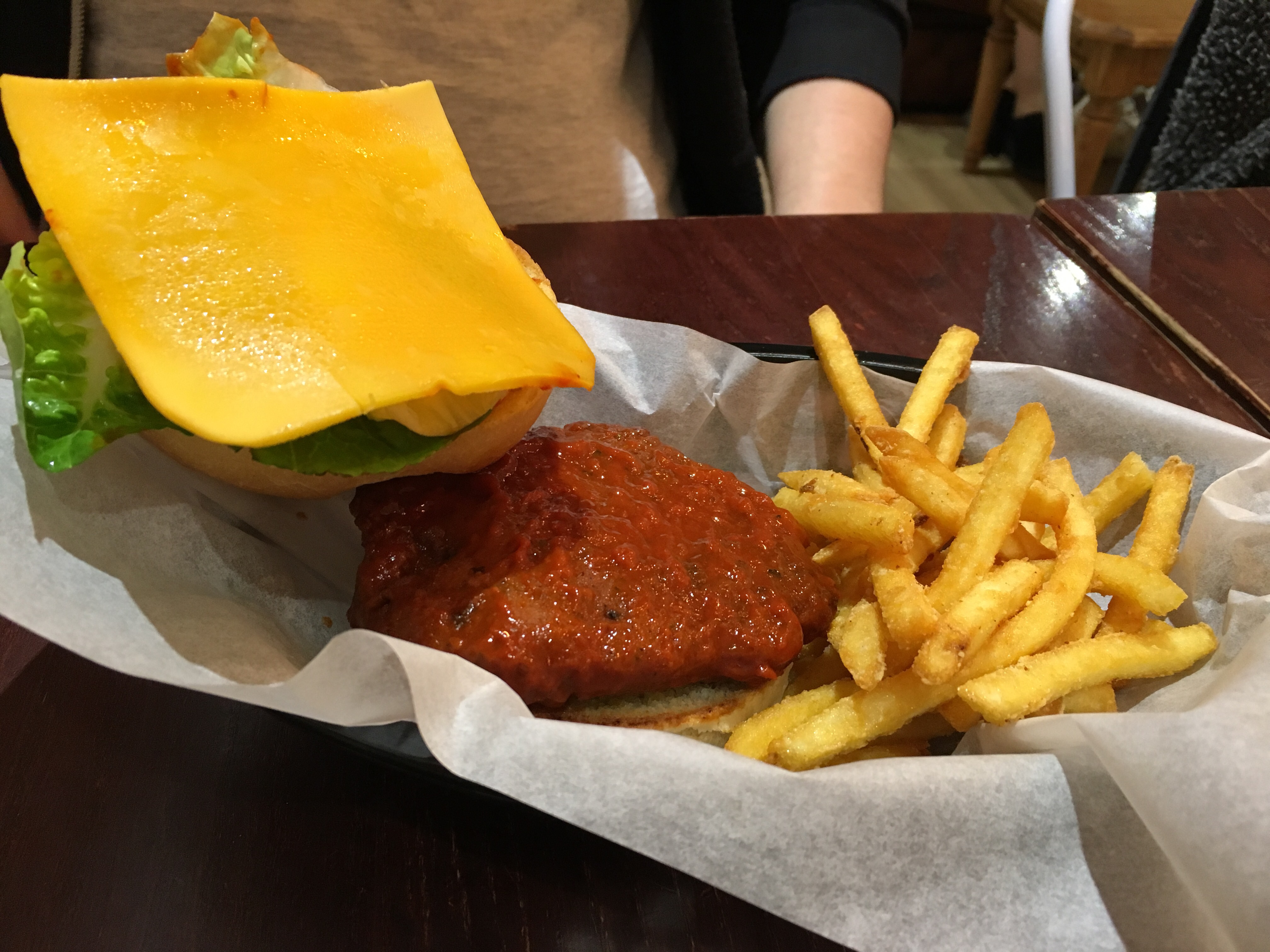 I had been eagerly checking out HFK’s Instagram feed on a daily basis in the lead up to the restaurant opening, and though I hadn’t seen the full menu, I was already pretty sure what I was going to order (I have to admit it was a tough decision, not being used to having quite so much choice)! We were seated by a super friendly waiter and told that once we’d checked out the menu we should order and pay at the counter. Happy Friday Kitchen is really casual and laid back, and I’m almost not sure whether I would call it a restaurant in that sense, though the food is certainly up to scratch and worth the restaurant prices. The food is American diner-style, and there’s no escaping that you are probably going to get your hands dirty and sauce all over you. If anything this adds to the enjoyment though, and I’m confident that any non-vegans who visit aren’t going to feel that they’re missing out on anything.