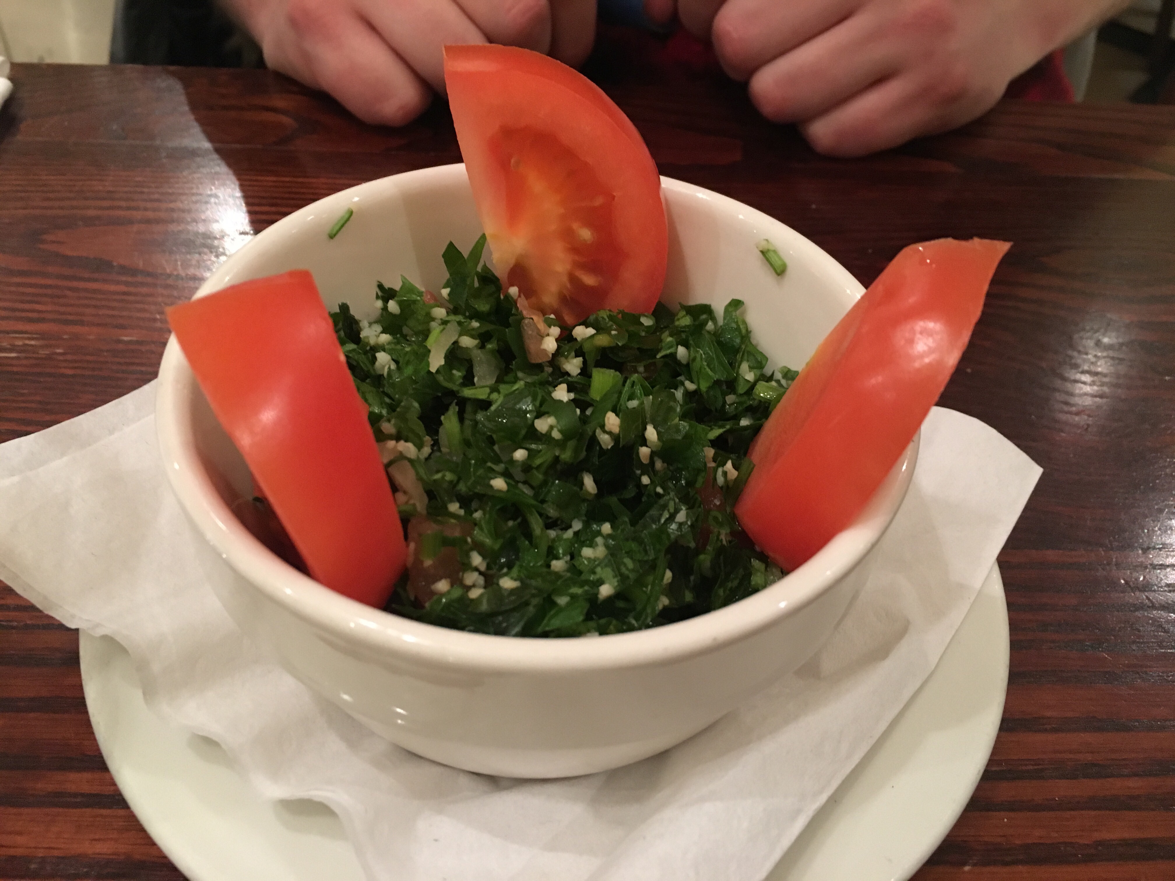 I also ordered a tabbouleh salad on the side, which was interesting as it was different from the other few times I’ve tried this dish in terms of the ratio of cracked wheat to herbs. It was super refreshing, but this was pretty much just a bowl of finely chopped parsley with a minuscule amount of wheat, mint and red onion mixed in. To be fair, that is exactly how it’s described on the menu and I did enjoy it as a more healthy accompaniment to my chips, so don’t really have any complaints! Also, no vegan puddings to finish off your meal with unfortunately but my stomach probably would’ve breathed a sigh of relief at that.