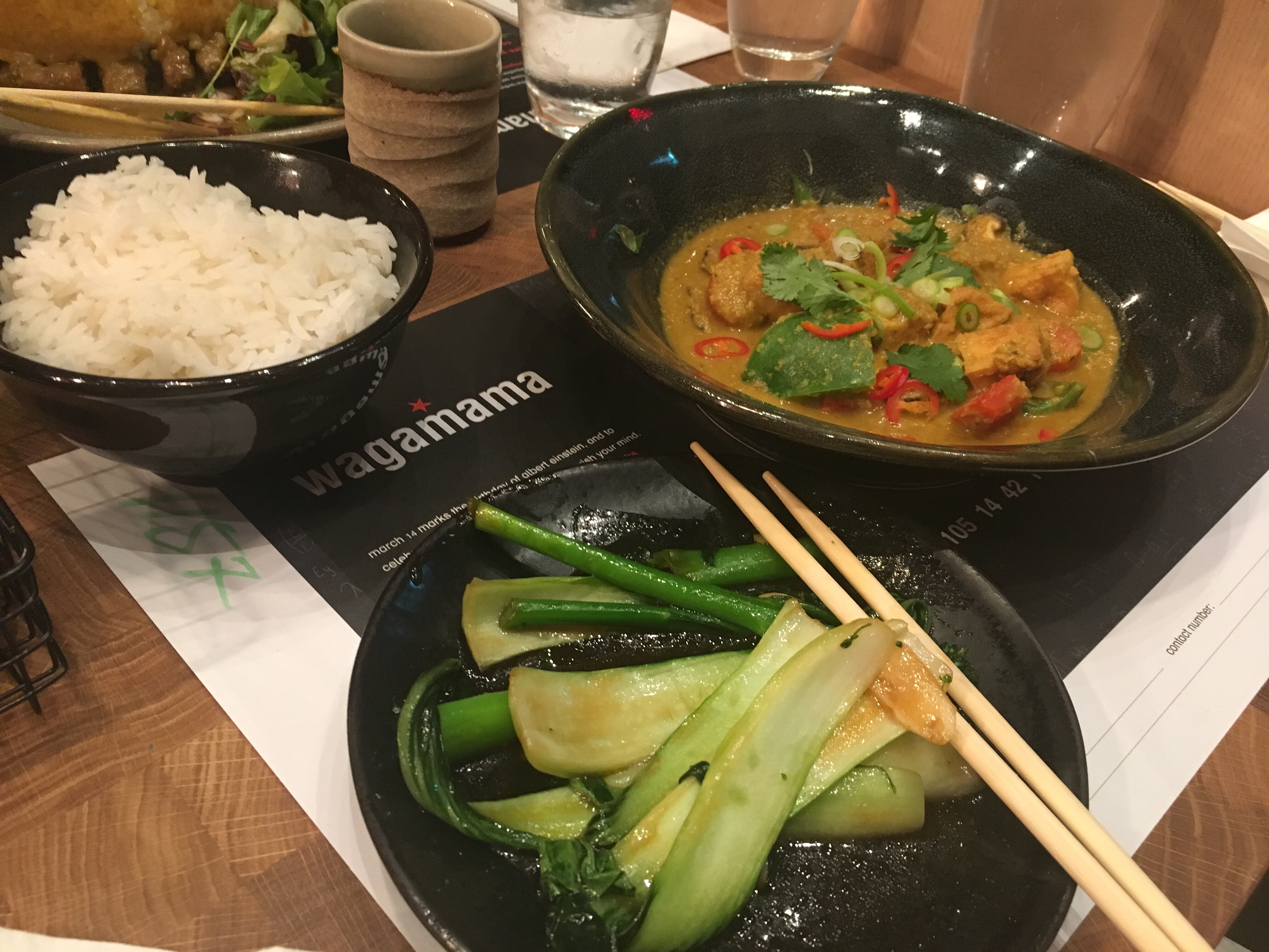 Between our orders we tried the vegatsu, the vegan pad thai and the yasai samla curry. All were packed with flavour and incredibly filling, making wagamama what I think is one of the best value meals out. My pad thai had a good kick to it from a generous handful of chilli, but it wasn’t overpowering and the whole dish has so many different elements which come together to make for a delicious comforting bowl. The tofu was also cooked to perfection, for my tastes. We all ordered a side of wok fried greens to go with our mains, and these are possibly my favourite things on the whole menu. A small plate of stir friend broccoli and bok choi seems simple, but the punchy garlic and soy sauce definitely makes it.