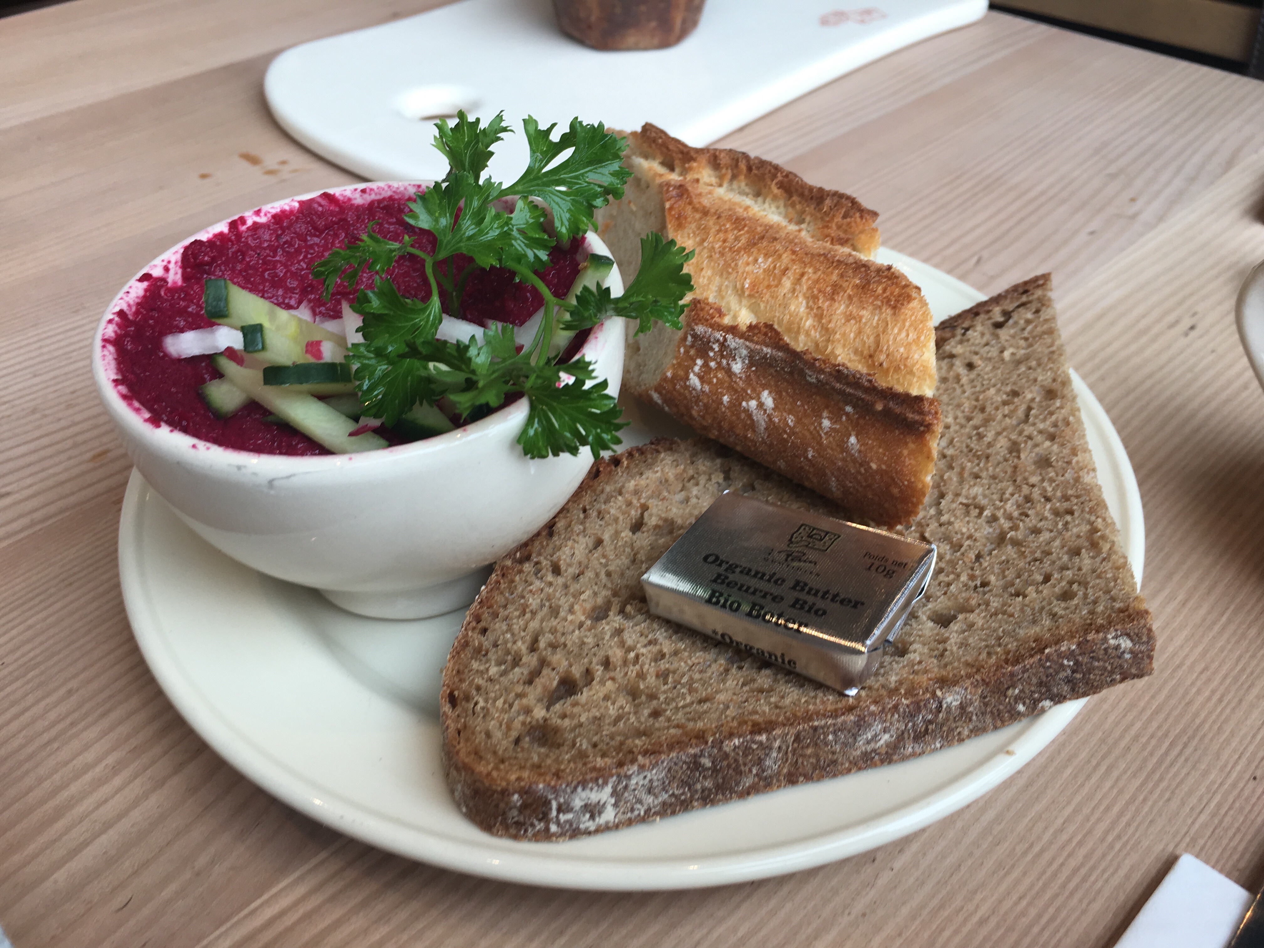 We also ordered a side of beetroot houmous, mainly because we were keen to try Le Pain Quotidien’s bread and didn’t realise both of our mains came with some already. We didn’t get started on this until we’d polished off our main courses and were pretty full by this point, but we had a good go at it. The houmous was vibrant, packed a powerful sweet beetroot punch, and I would have finished the plate off had I not been so greedy with the rest of my order. As you can see from the photo, despite the dishes being labelled vegan, we were given a portion of butter (and this was the case with our mains too) but at least it was wrapped up and we could return it to the kitchen.