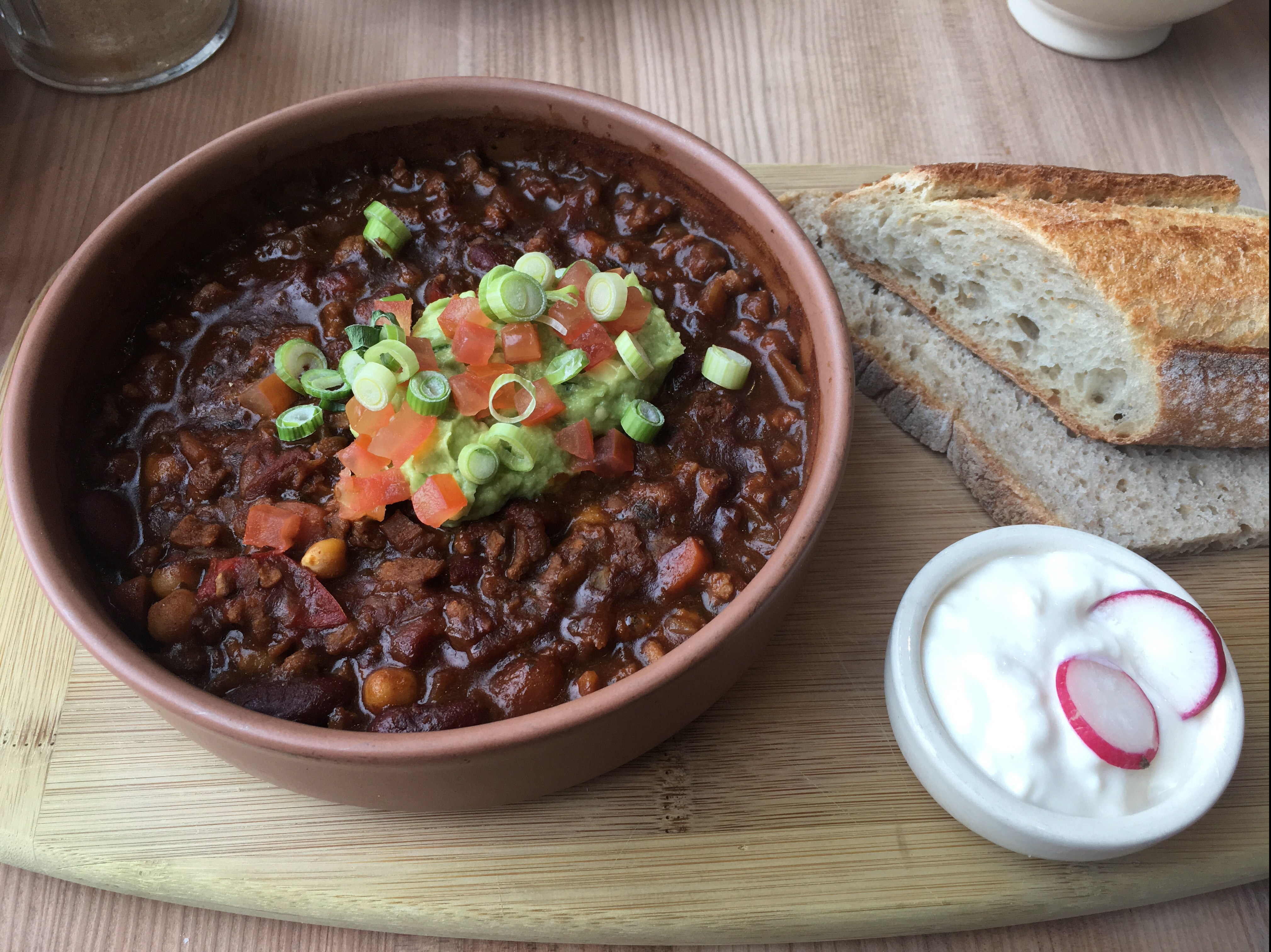 Lucy ordered the vegan chilli, which again looked so enticing when it was put down on the table. The bowl was served with guacamole, soya sour cream, and more crusty fresh bread. Lucy eats meat and said she probably wouldn’t have known this chilli was vegan if it hasn’t been labelled up as such, and that it was really good. The same as with my curry, it looked super wholesome and comforting.