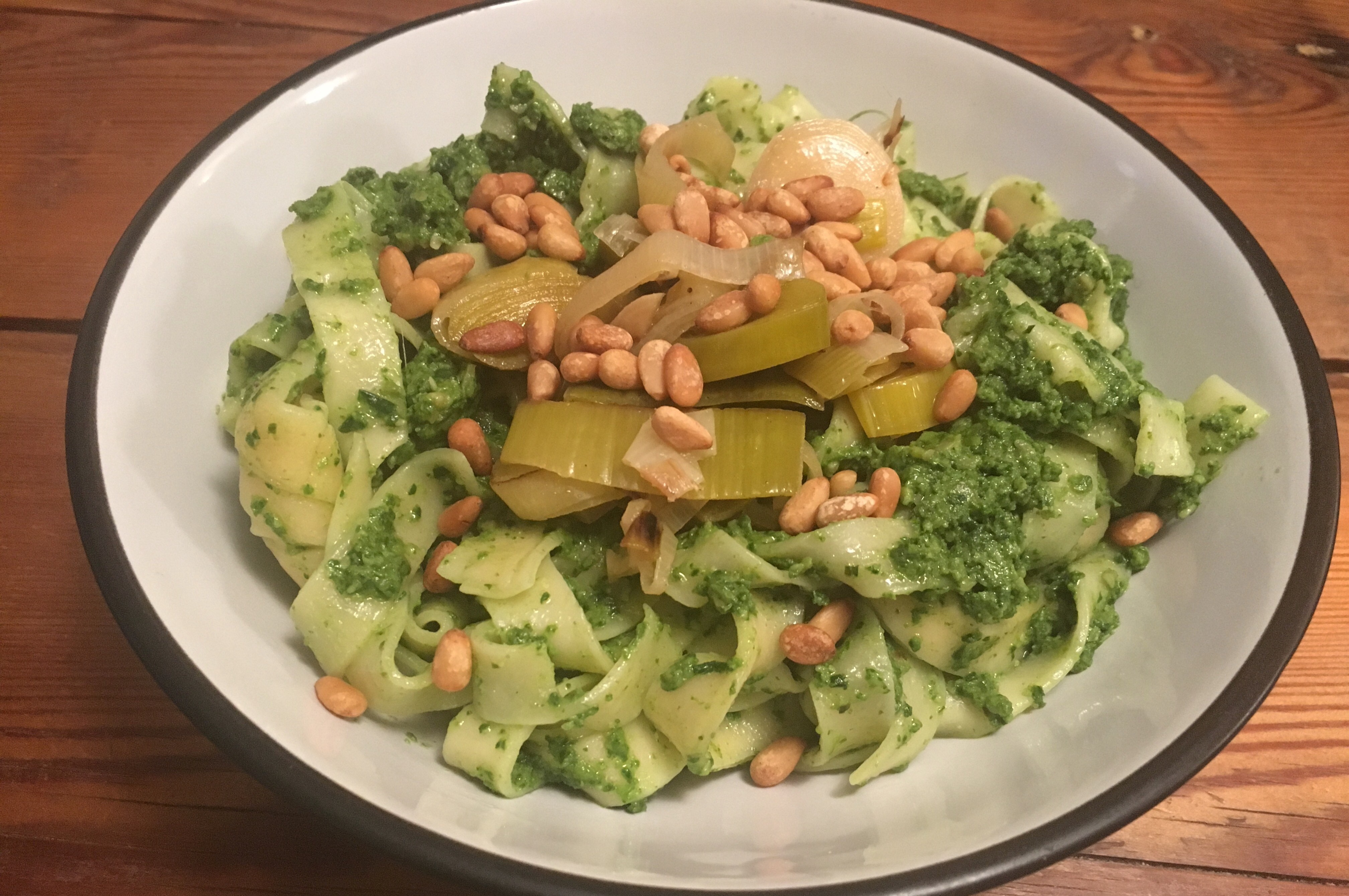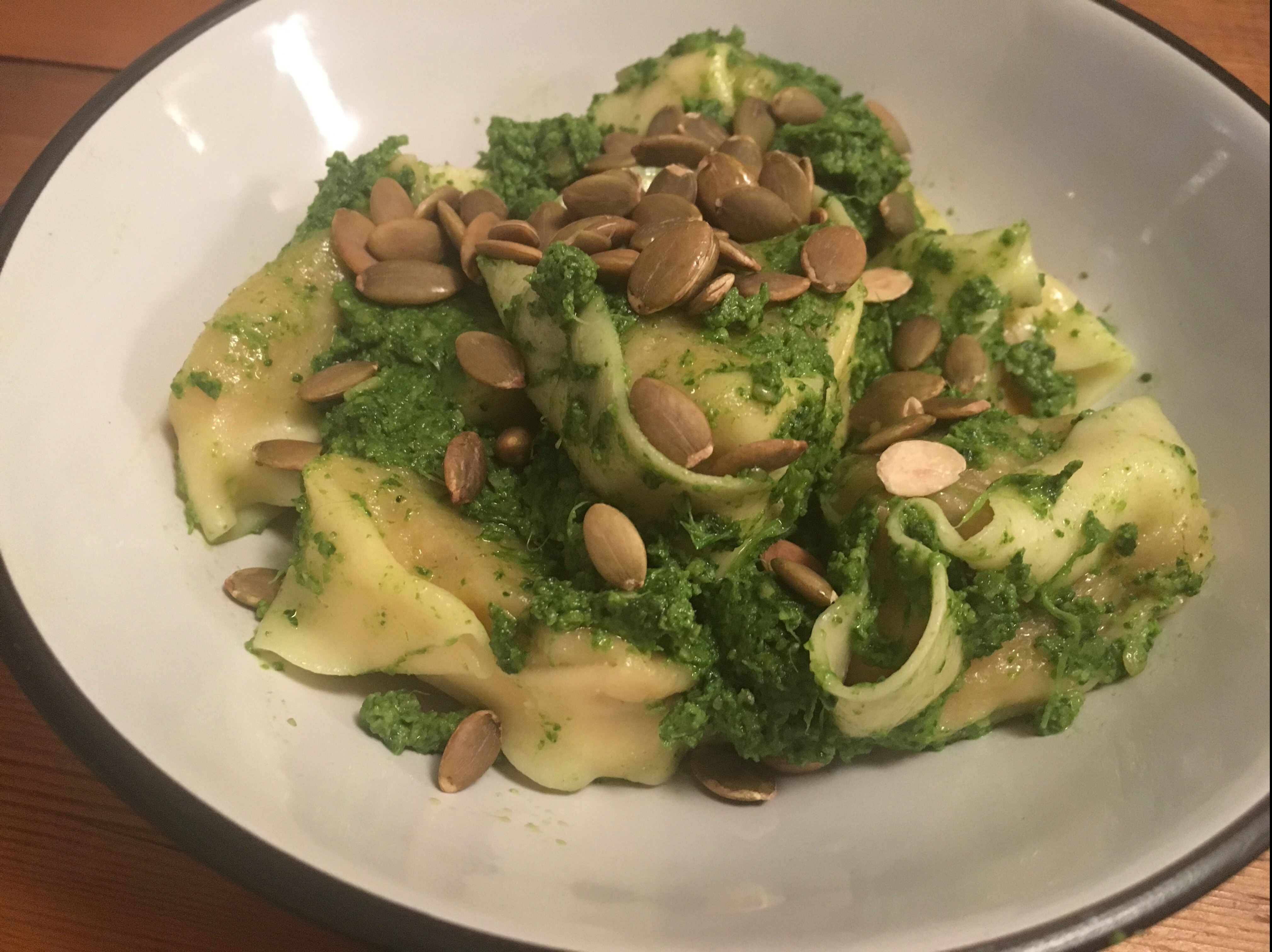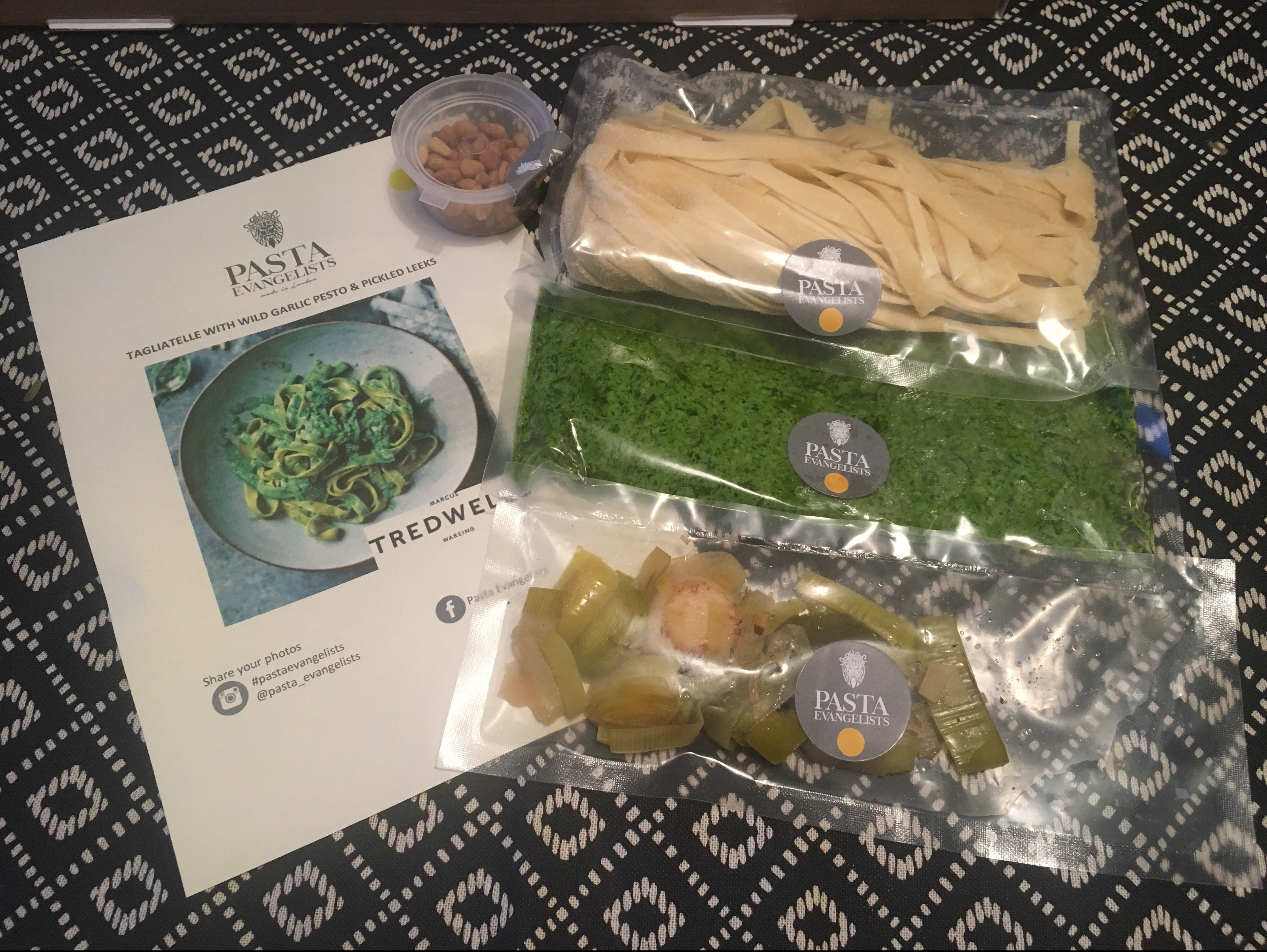With that out of the way, on to the product itself. I was sent a couple of servings to try – a tagliatelle with wild garlic pesto, and a pumpkin tortelloni. The long cardboard box is sized to fit through a standard letterbox, but that’s no good for me as I live in a flat, so I got it delivered to my office. I was given a one hour delivery slot and the parcel arrived no problem, so this was actually really convenient (apart from making my cycle home with gym kit slightly trickier, but that was my own fault for not thinking things through properly). Inside were two individually packed portions of fresh plant-based pasta, a sachet of pesto for each, a little pot of seeds, and for the tagliatelle, a packet of pickled leeks. One of the pesto sachets had leaked a little but it was only a small amount of oil so nothing too serious. Included in the box were recipe cards featuring images of the dish as cooked by the professionals, and step by step guides of how to put together your quick evening meal.