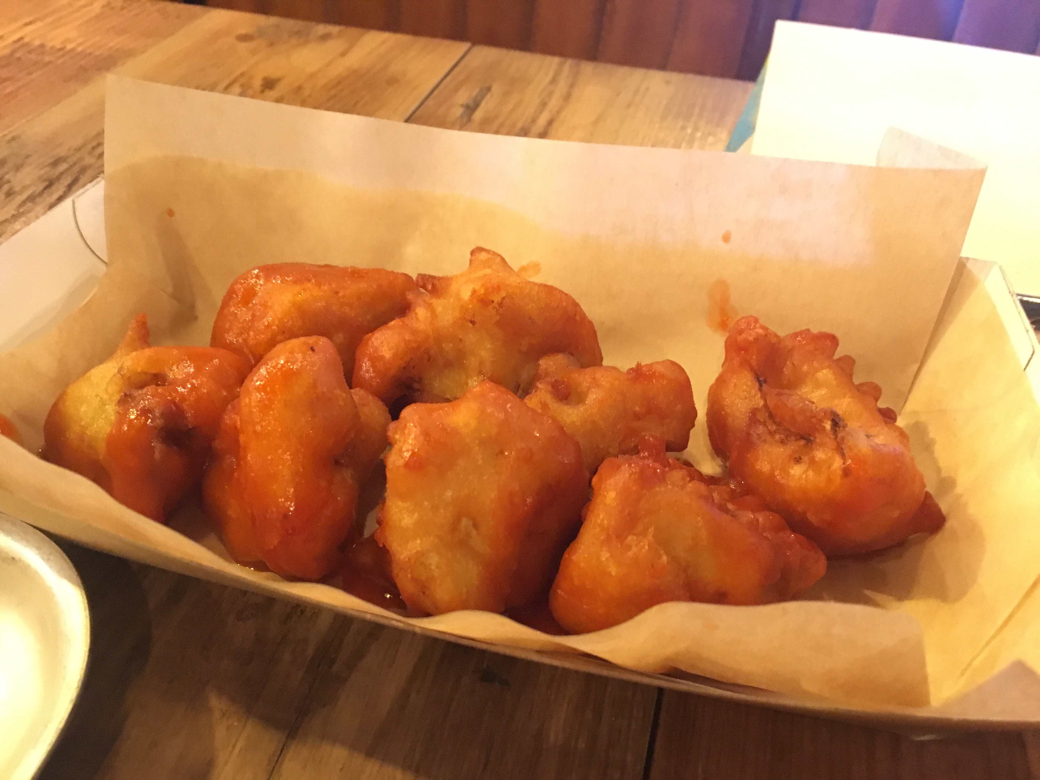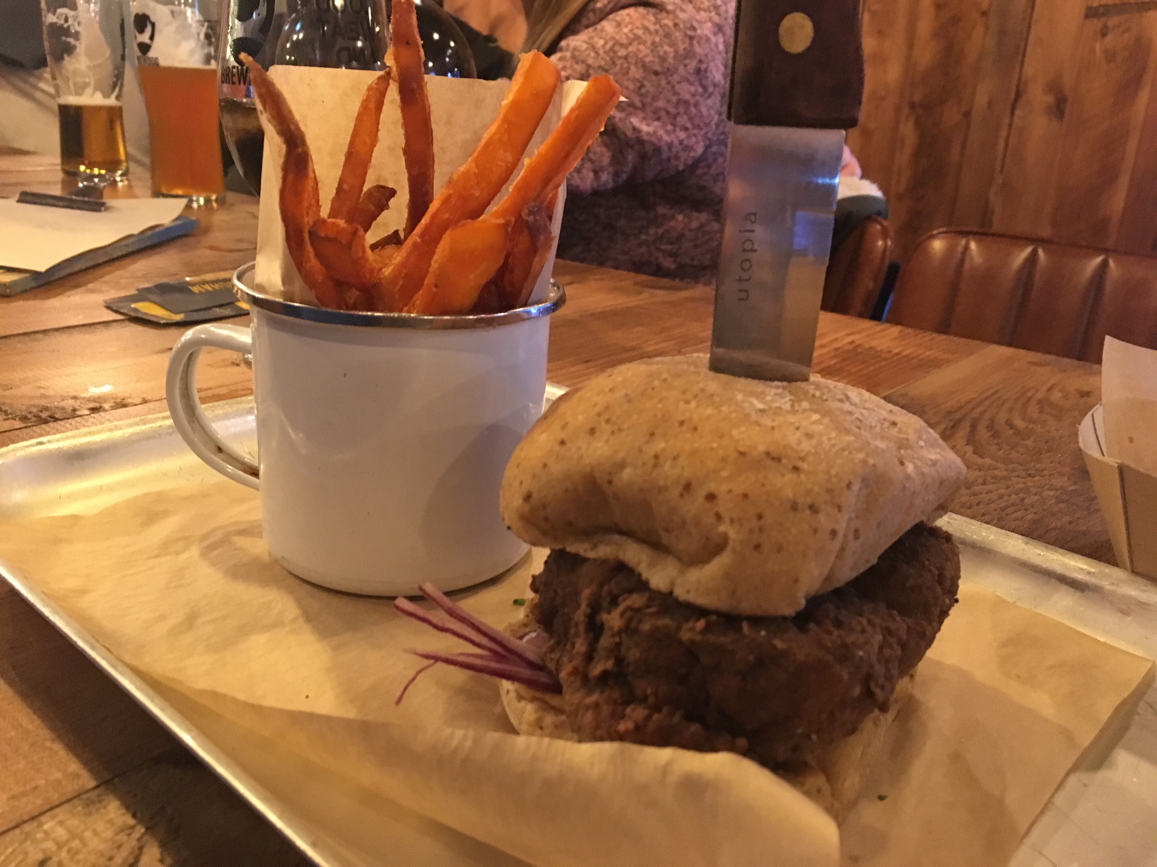When our food came out, it appeared there had been some crossed wires between the person at the bar taking our order (was the music too loud, or did he just not even understand the fact that some of the Brewdog burgers were vegan? We’re still not really sure). What arrived was a seitan burger in a non-vegan brioche bun with dairy mayo on one board, and a vegan burger on the other, with a side of actual chicken wings. Before I even noticed the chicken wings I mentioned that the vegetarian burger should have been vegan, we were apologised to, and the meal was sent back. A couple of seconds later, the person serving us, who we think was a manager, came back to ask ‘can I just check, the other burger, it was a side of chicken wings you wanted wasn’t it?’. I think he knew what the answer was going to be before he asked the question. He collected up the other board and assured us our meals would be cooked fresh (which we just have to trust was the case).