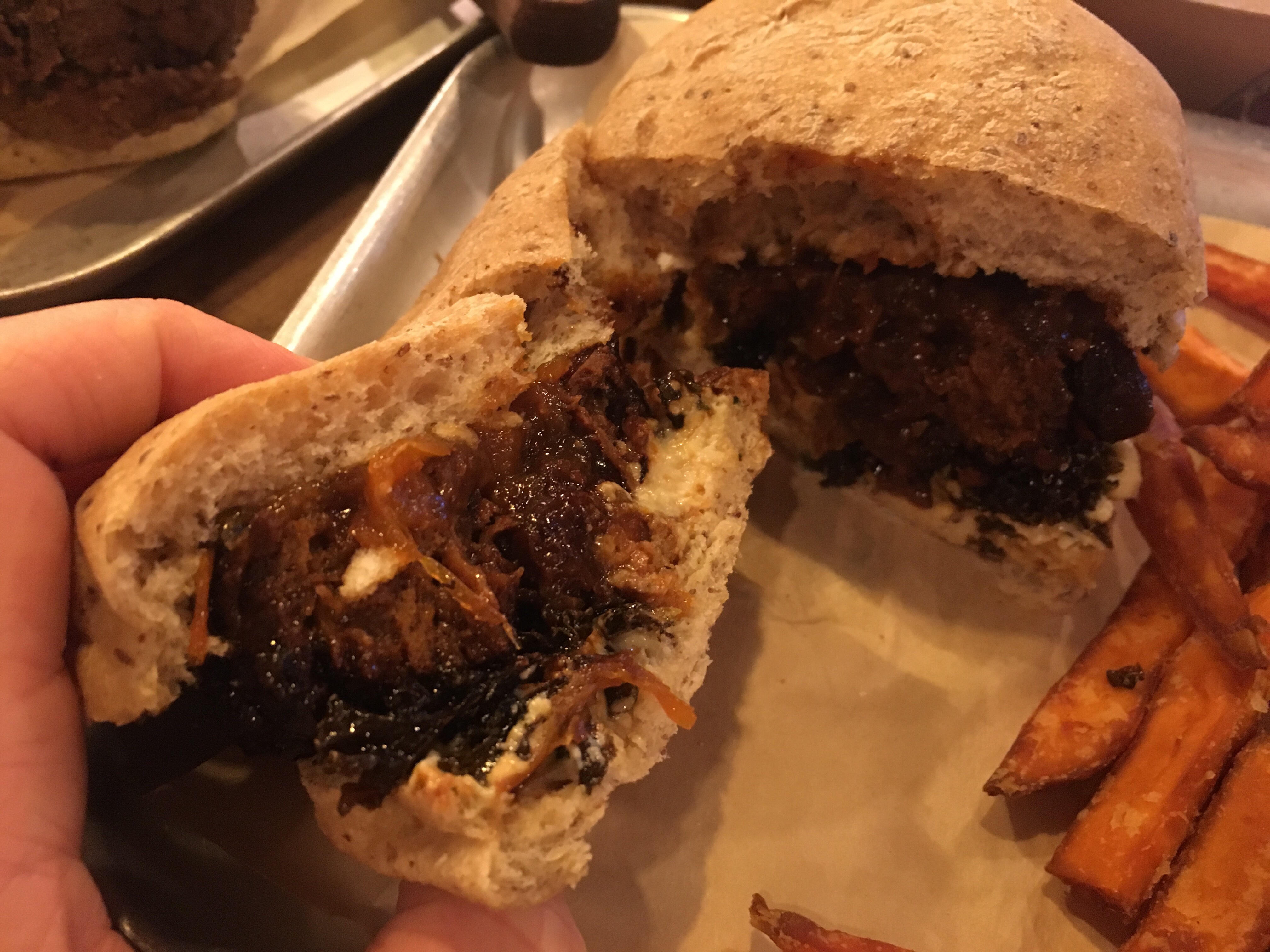 I’d ordered the Hail Seitan burger, a BBQ seitan steak served with hummus and kale. The burger itself was very meat-like, so much so that I had to check there wasn’t a meat version of the same burger on the menu as I was worried they’d got it mixed up again. But no, it was definitely seitan, and the texture and BBQ flavours were pretty spot on. I was kind of unsure about hummus and kale in a BBQ burger but the chargrilled greens and creamy, tangy hummus balanced out the sweetness from the sauce nicely. I did find the BBQ sauce almost overly sweet and combined with it being so filling, I struggled to finish it off.
