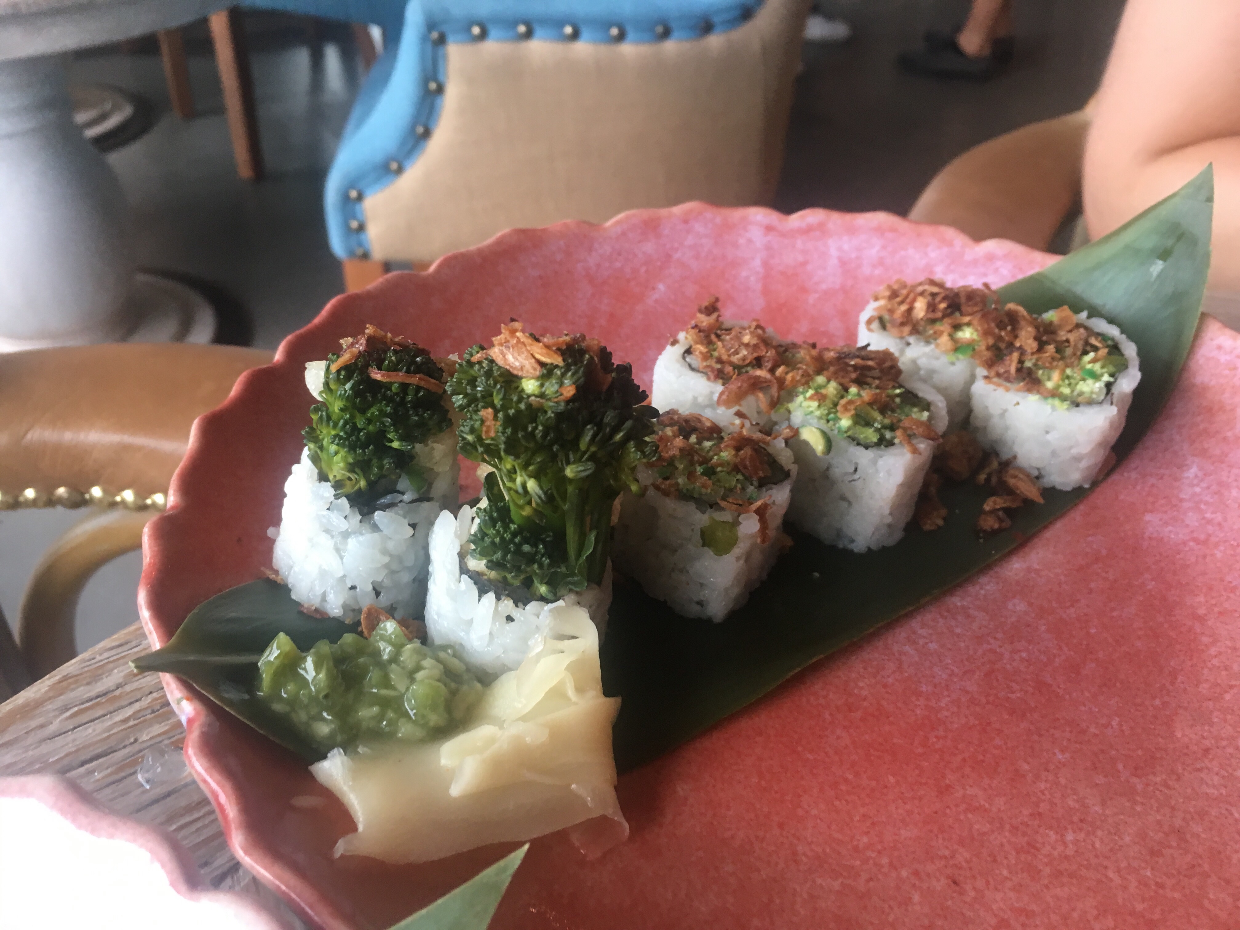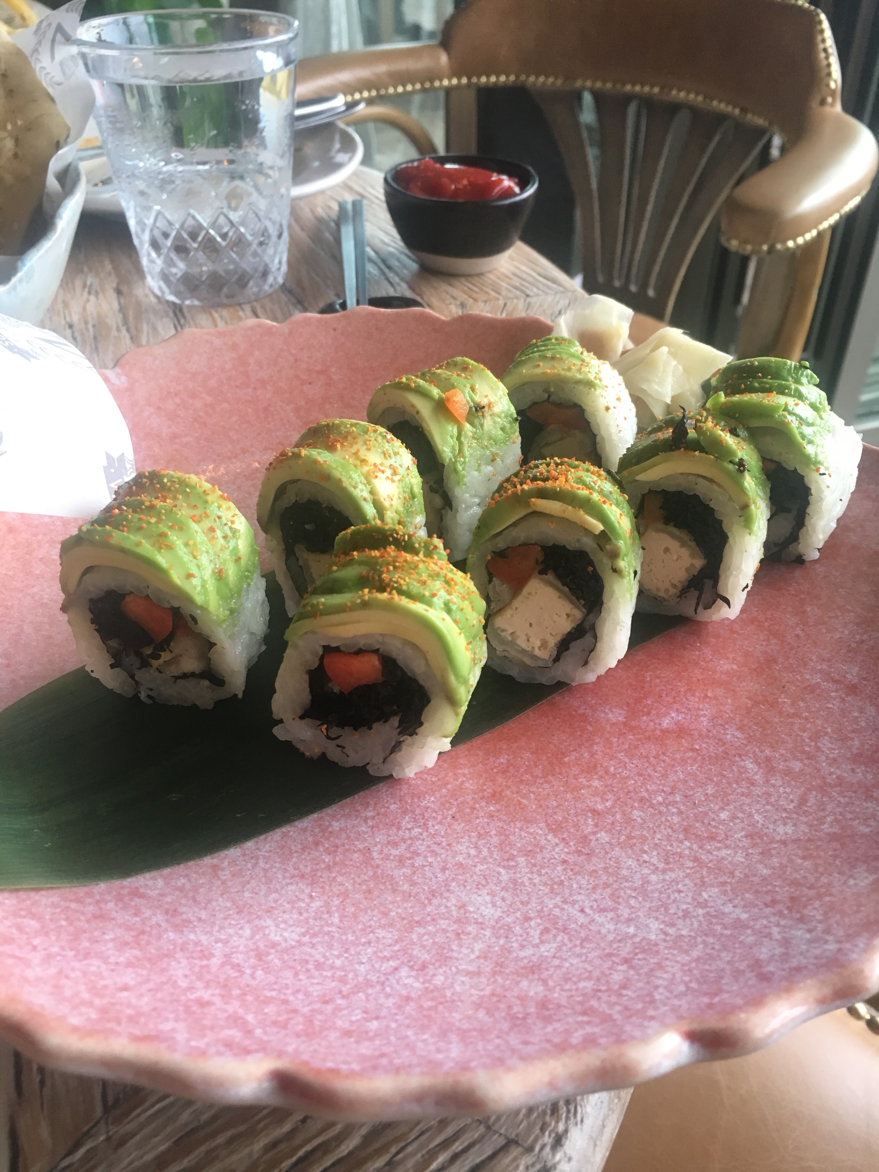 I’d been told bizarrely that the beef rolls could be made vegan, filled instead with some mushrooms, peppers and veggies, so we ordered two full rolls of the vegan version of these, as well as one full roll of the avo and tofu. Both types of rolls were light and refreshing, and despite being someone who isn’t a huge sushi fan, I could happily get on board with these. As you’d expect, everything was perfectly presented on the plate – it’s a very Instagram-worthy location!