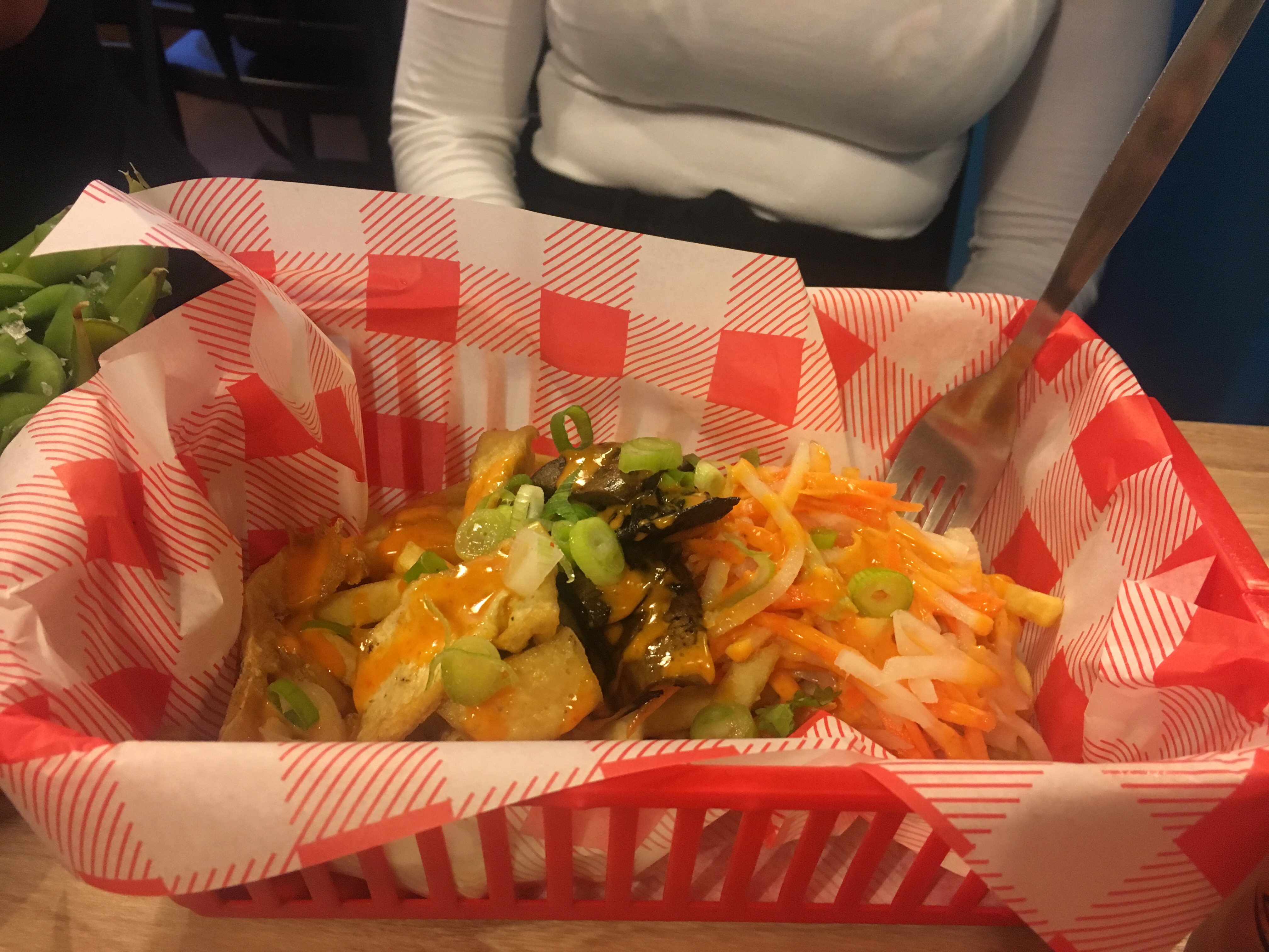 Our other colleague ordered the vegan kimchi fries and a side of edamame beans. The fries looked so good, and we were told kimchi usually has fish sauce in so it’s great to find a vegan-friendly option. I didn’t try any of her meal but she recommended it too!