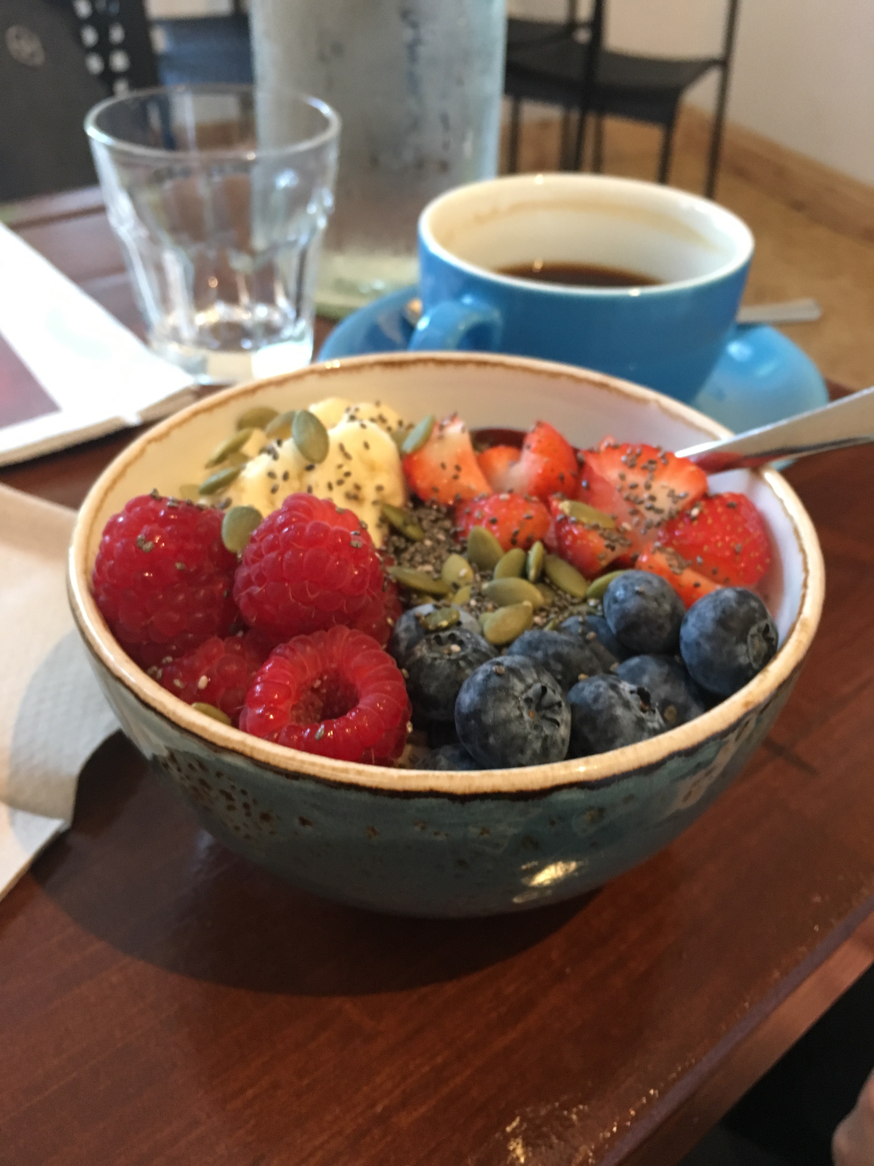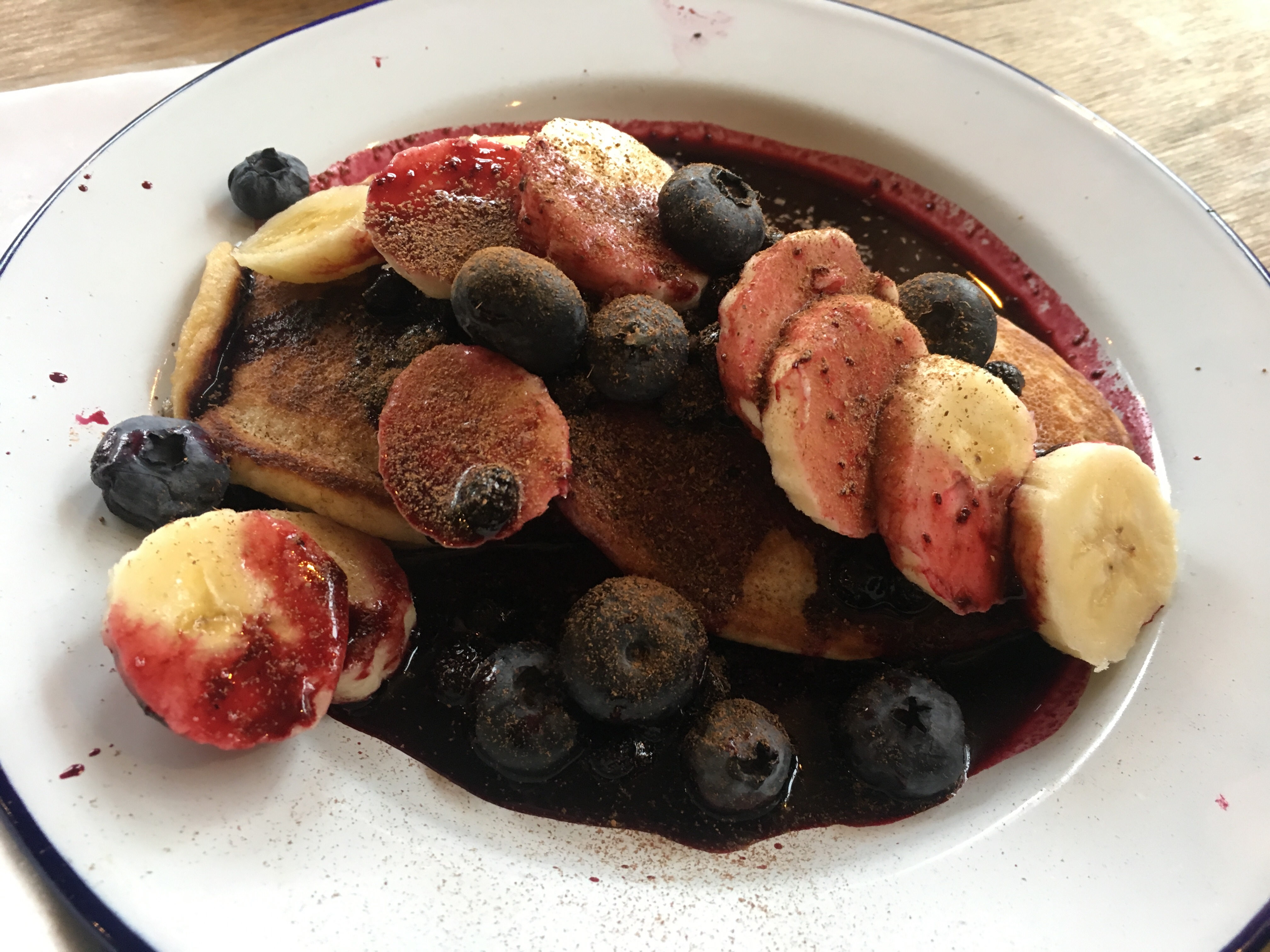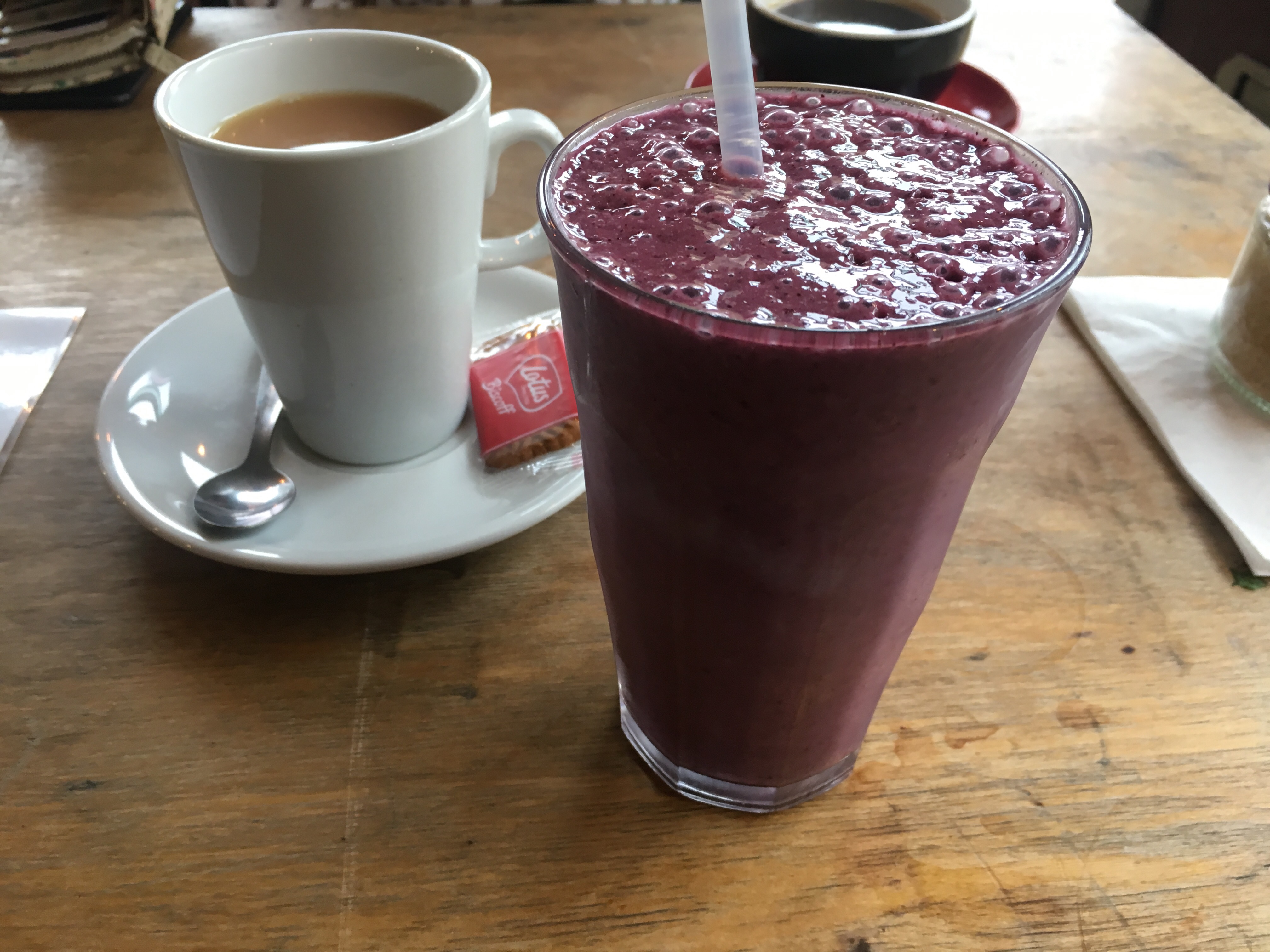 blueberry compote with ample fresh blueberries and banana slices on top. There were just two pancakes, but they were pretty filling, and at £3 a stack it was possibly the cheapest I’ve ever seen pancakes served at. Alongside it I ordered a breakfast smoothie (yes, I am aware I effectively had two breakfasts). It was a blend of berries, oats, chia seeds, and almond milk, and was deliciously creamy and filling. I was sceptical that a smoothie alone could be filling enough for breakfast but this one definitely was!