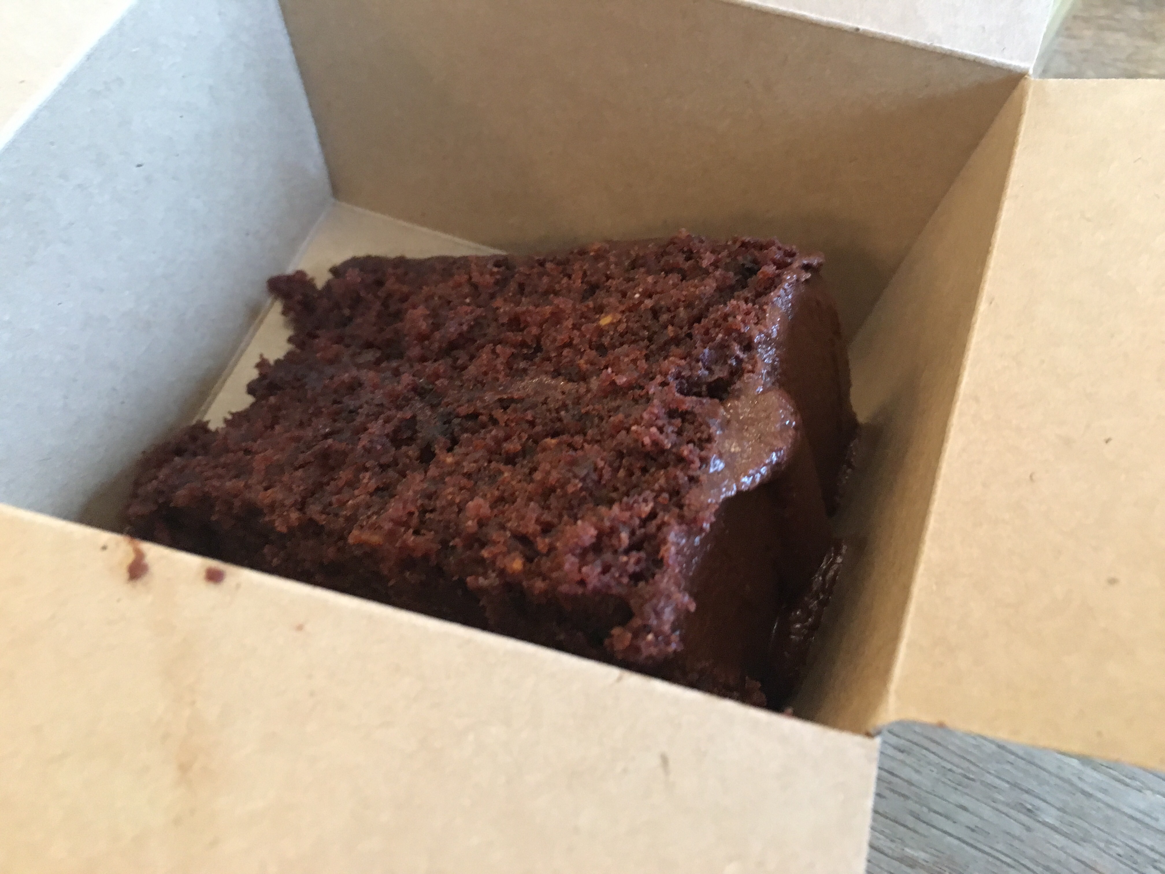Apart from a little mix up with our orders which was easily solved by swapping my fries with a colleague (there seemed to be only three members of staff looking after the whole place, and although its small enough, it was super busy). The burger itself was huge, and although it was quite crumbly, the cheese and bacon held it together well enough. I did miss the coleslaw which was advertised on the menu but I think they forgot to put in the burger – although, it definitely wasn’t dry, that’s just me being greedy! The salad was really tasty and felt like a welcome addition to the plate rather than just an afterthought. The meal was so filling that I picked up a slice of chocolate cake to go, which I ended up eating the next day. It was again a generous sized slice, decadent and delicious. For a little twist, it was filled with chai spice and absolutely delicious.