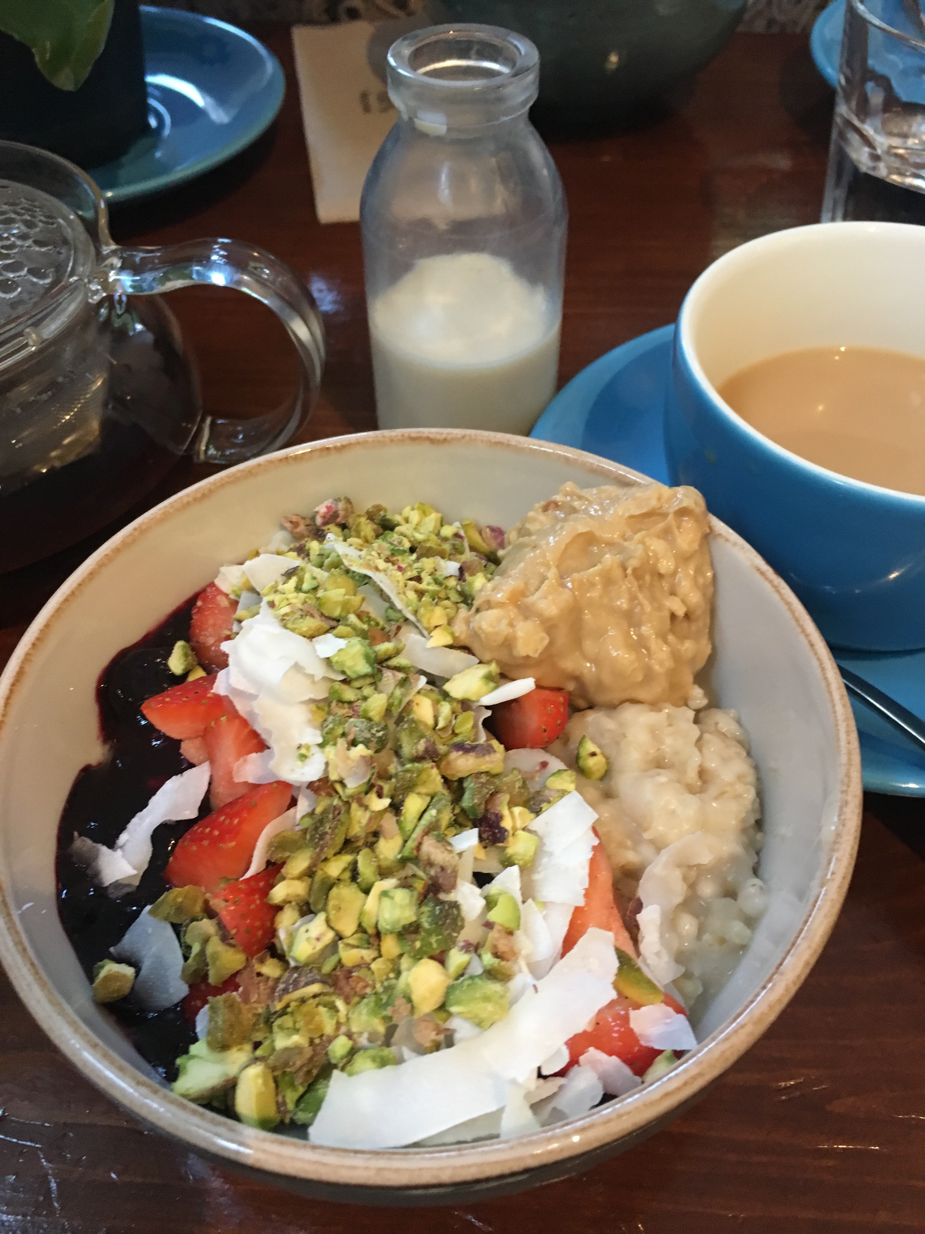 The next morning, we visited the Bristol Porridge Project for breakfast. For those who know me, I wouldn’t need to say that this is my idea of heaven. I definitely eat some form of oats every day. For breakfast in winter I have a warming porridge, and in summer I go for overnight oats. Upon entering the café you are presented with an array of porridge topping combinations on black board (I took a sneaky photo so I could recreate some of them at home). There were only one or two which weren’t vegan. With the majority at £3 a bowl, it’s really not an excessive amount to pay for breakfast out, and certainly much better than the obscene £16 my hotel were asking for. There were a handful of ‘limited edition’ style bowls available at £4, one of which I ended up going for because it featured all my favourite things. The porridge was cooked to just the thickness I like, and the bowl was absolutely loaded with toppings: in my case, peanut butter, pistachios, strawberries, coconut shavings, and a berry compote.
