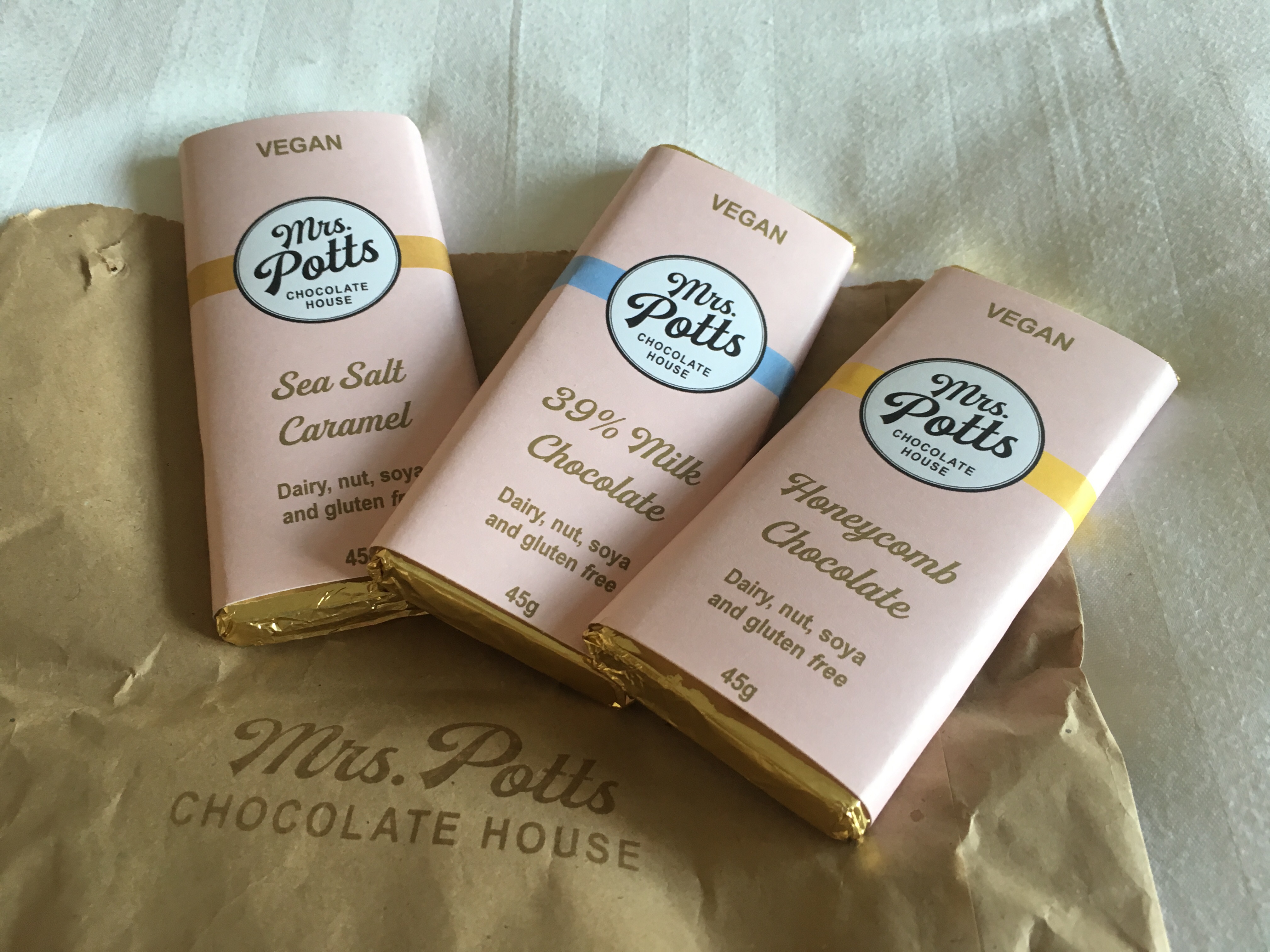We ended up ordering a fairly boring takeaway for dinner as we were tired from the conference, but during the day I did manage to take a trip to Mrs Potts Chocolate House and pick up a few goodies to take home. I am a sucker for vegan baked goods. I got a rich & fudgy chocolate brownie, a chocolate chip cookie sandwich, and a chocolate cupcake. I wasn’t sure what the cupcake frosting was made from but it was light and almost marshmallowy. It had a bit of a different flavour to any buttercream or frosting I’ve tasted before, which I wasn’t sure I liked, but Jamie enjoyed it. Mrs Potts’ also sell their own homemade vegan chocolate bars which I think were my favourite out of everything I bought there. They were deliciously creamy, and came in the cutest packaging.