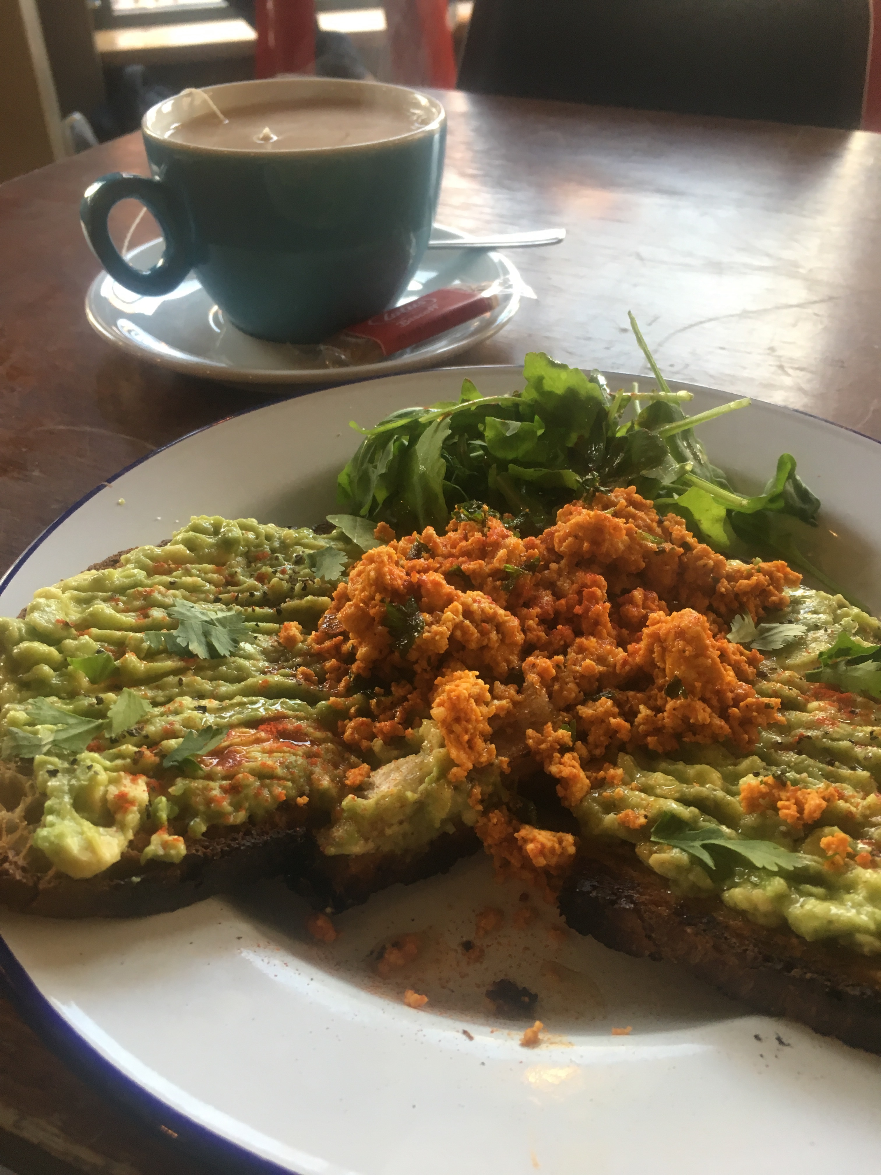 The next morning brought my last day in Bristol, and I felt sad that I couldn’t have stayed a bit longer, there was so much to explore that I didn’t get a chance to because I was working! Still, I think I made the most of the food. I went back to Exchanges for breakfast, and got avocado on toast with scrambled tofu, served with a rocket side salad. With a squeeze of lime, it was zingy and fresh, and the tofu scramble was very flavourful. I also picked up a pot of overnight oats to take to the conference for lunch, because the catering at the conference had been pretty questionable. It was only about £2.50 and a huge portion, filling me up for lunch without the need for anything else. It tasted great and some fresh blueberries and seeds on top gave it a bit of added texture. I know if this was on my way to work every day I’d be a regular.
