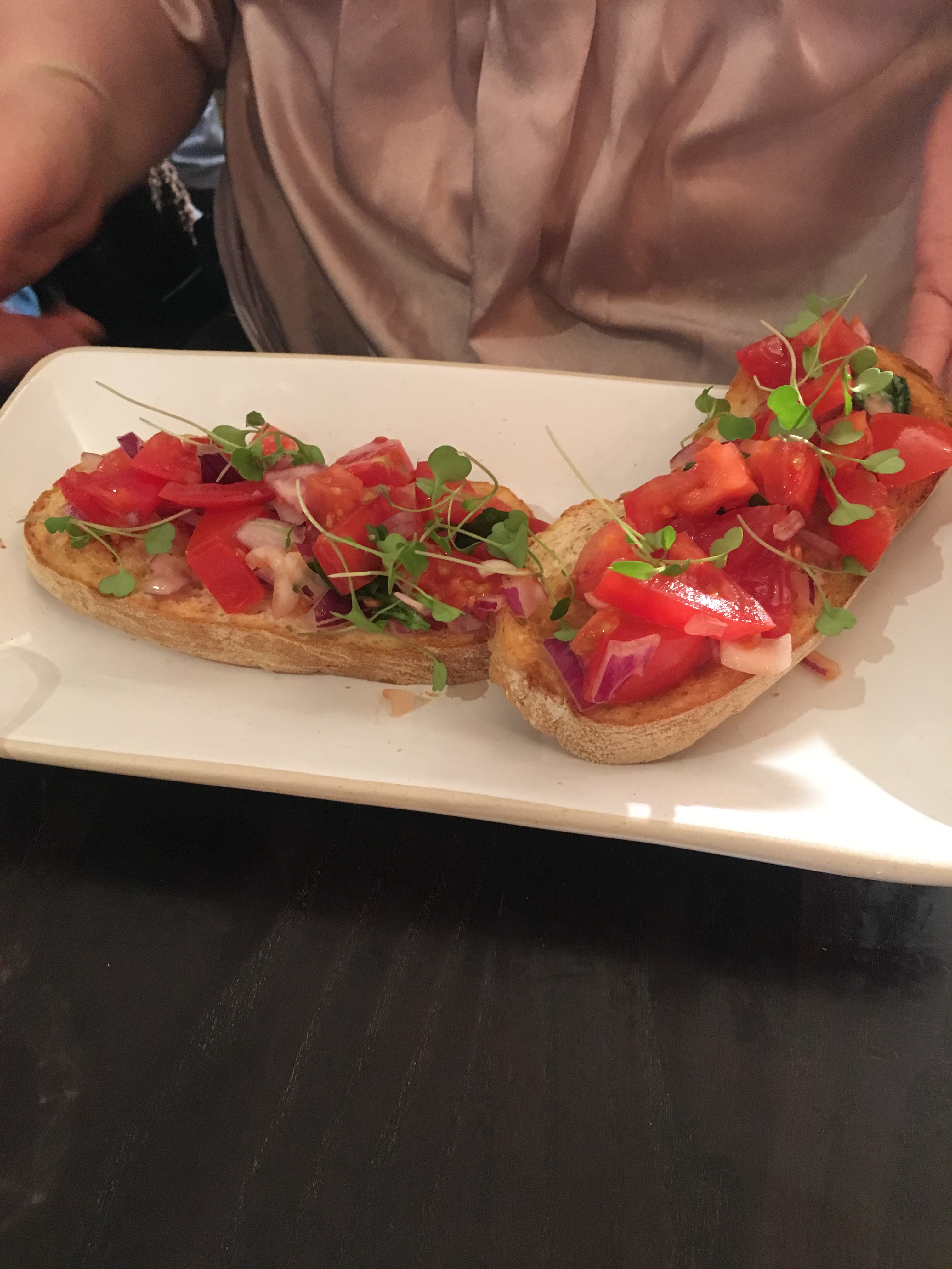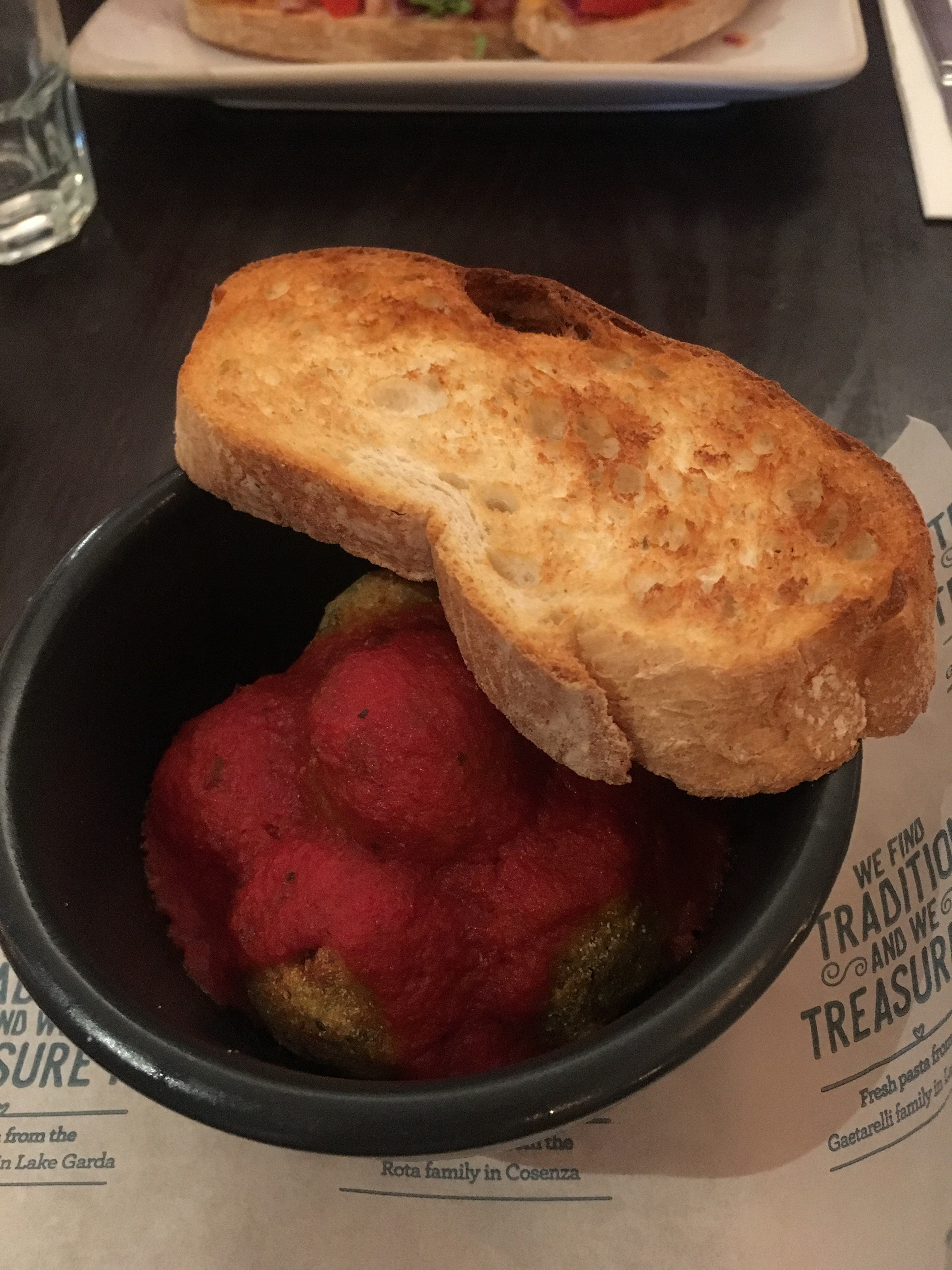I managed to persuade everyone in the interests of my review, and because we had buy one get one free on food, that we should all take advantage of ordering three courses. I was intrigued by the vegan polpette, which definitely sounded like something a little different from the standard vegan starter you find at these kinds of places, though that’s not to say a vegan garlic bread wouldn’t go amiss! The ‘meatballs’ arrived in a small bowl with a piece of bread balanced on the edge. The shape of the bowl made it not the easiest thing to eat, it would’ve been better with a side plate for the bread. I thought it was the right size for a starter though and a nice start to the meal. The balls themselves were less meaty than I was expecting, having bought meat-replacement meatballs to eat at home before, these were more like falafel. They were seasoned quite nicely and the tomato sauce was tasty, but there could’ve been a bit more of it, as along with the un-buttered toast, the dish felt slightly dry. My friend ordered the other vegan starter available, the bruschetta with tomatoes, which is the less original dish that I’ve seen on a fair few chain menus – Zizzi, Ask Italian, etc. It looked surprisingly appealing on arrival with the vibrant red and green from the toppings. Olivia seemed to enjoy it, though she said the tomatoes weren’t the most flavourful. It’s not really something I’d order myself and I hope that restaurants are moving in the direction of more adventurous things!
