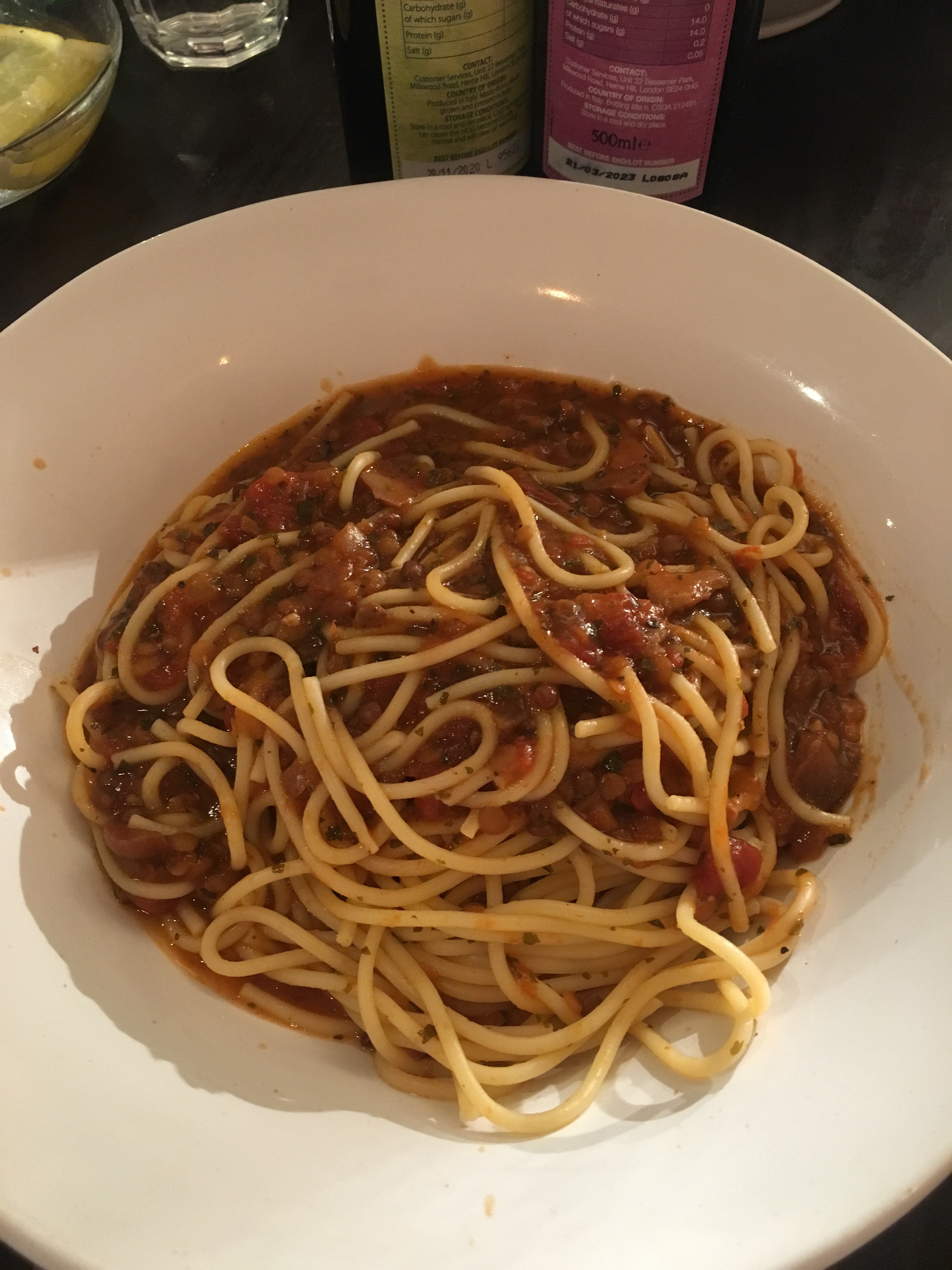 Onto our mains, and I like that there is a vegan option on pretty much every main course section, so whether you’re looking for a pasta, pizza, or risotto dish, you can find one. I might’ve gone for the risotto but I’d had one for dinner the night before, so decided to be pretty unadventurous and go for the lentil & mushroom ragu. Again, it was a very good sized portion, albeit splashed in the big bowl with absolutely no attention to presentation whatsoever (I’ve seen Masterchef, I thought you were supposed to at least clean the sauce splashes off the side of the bowl before service)! It was exactly what you’d expect from a spag bol from this kind of place. The sauce wasn’t anything particularly special, though at least they seemed to have got the right amount of it for the spaghetti. The lentils were al dente, a few I felt that probably weren’t quite cooked through. I could definitely make something with more flavour at home, but these kinds of restaurants and their dishes are literally designed for the bland British palate. It did what it was supposed to do in that I focused much more on the conversation at the table than the food, which was a pretty average, home-cooking style bowl of comforting carbs.
