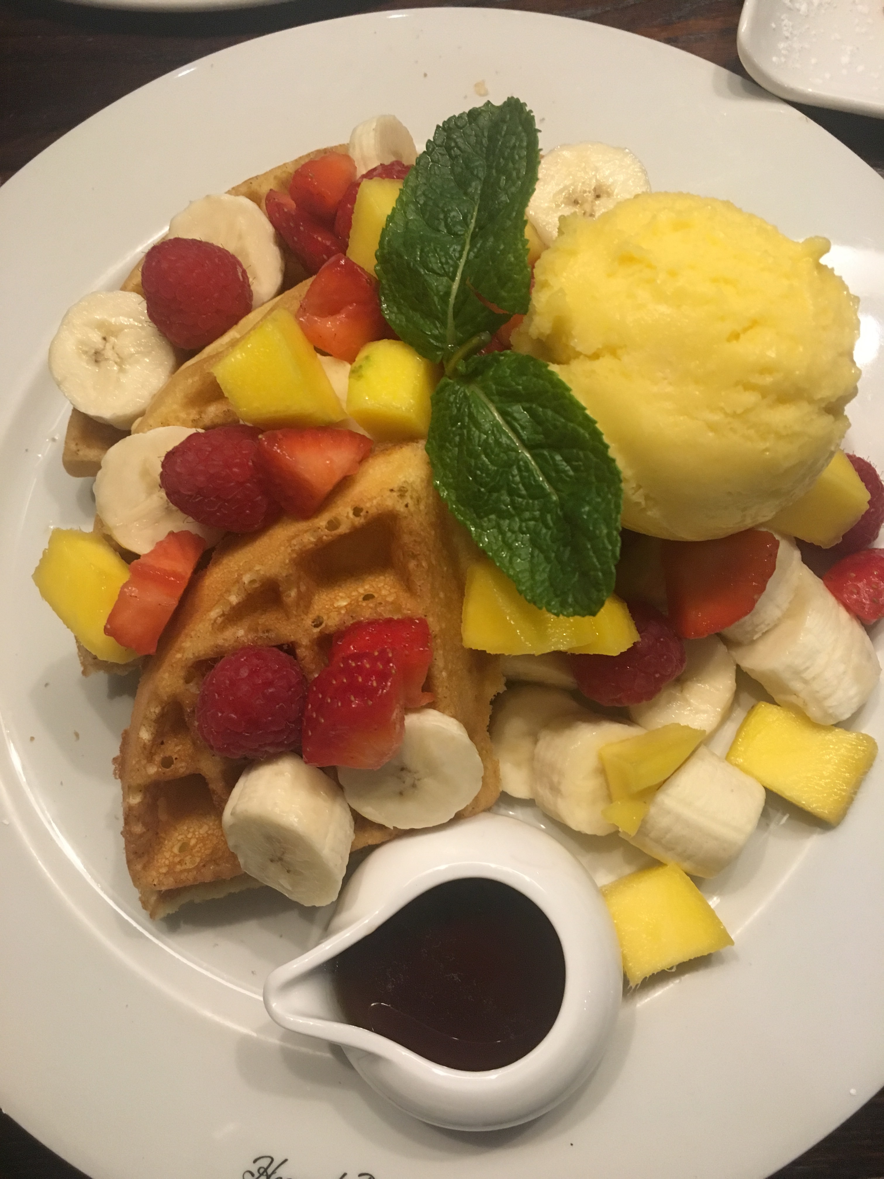 img_9486We tried a couple of the waffles, and narrowing our choice down to just two from the abundance of options was challenging. The portion sizes were absolutely huge, so I thought these were amazing value – far better than anything I’ve seen elsewhere. I would struggle to get through one in one sitting so it might even be a good option to share. The waffles were crisp on the outside and fluffy in the middle, with a hint of sweetness but certainly not too much considering all the sweet toppings. I couldn’t tell from eating it that it was a gluten free batter. img_9479I chose the ‘Sinful but oh so heavenly’ waffle, piled up with mango, banana, strawberry and raspberries, served with a generous pot full of maple syrup to pour over, and a scoop of mango sorbet. It was the perfect summery dessert and I was really impressed by the amount of fruit. The sorbet was also enjoyable for me as sorbets go, without any icey chunks which you often find in lower quality scoops. Jamie ordered the Lotus Biscoff waffle, for which you definitely have to have a very sweet tooth. It was drizzled with melted Biscoff spread, topped with biscuit crumbs, and served with a creamy vanilla ice cream. Very indulgent and such a treat.