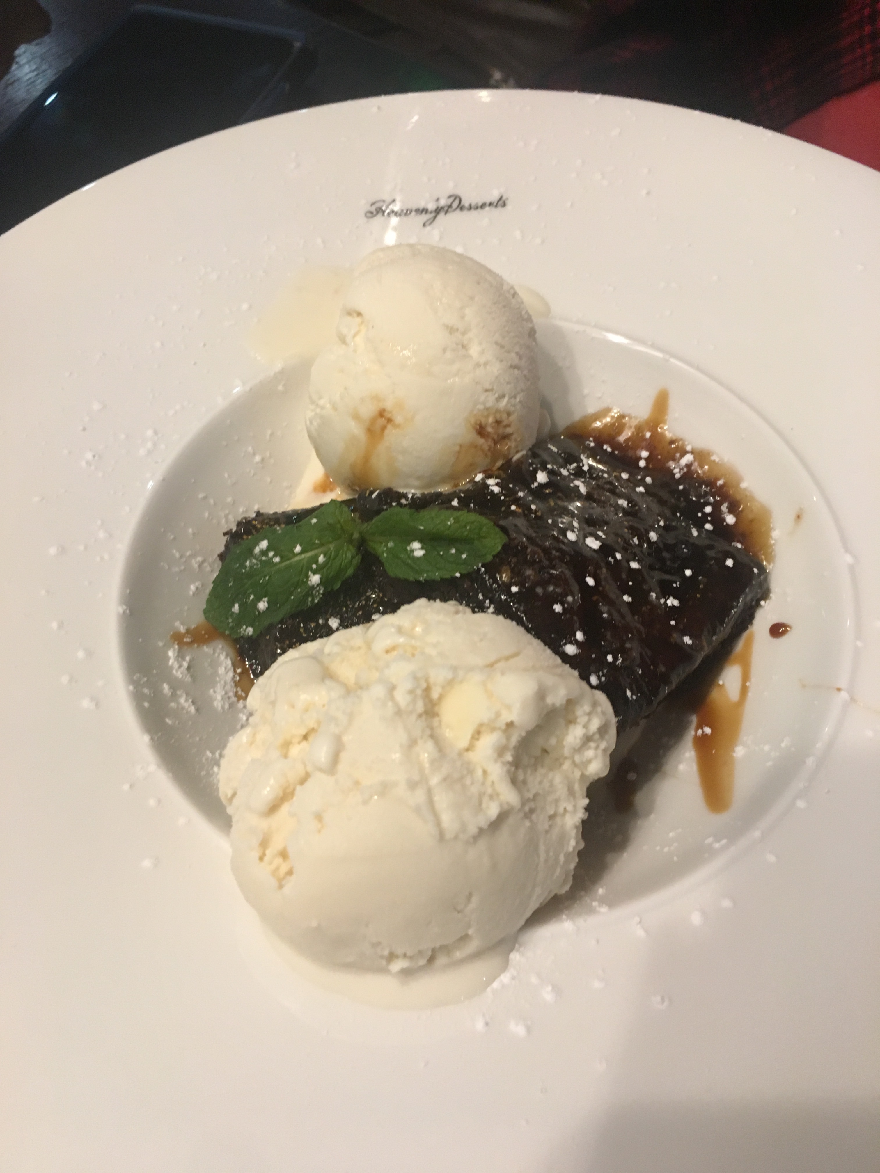 img_9491Finally, we reach the Sundae section of the menu. As you can imagine with all the toppings they’d featured throughout the menu so far, there were a lot of combinations to try here. We went for the ‘Cookies and Cream’, a huge glass filled with layers of vanilla ice cream, plentiful dark chocolate sauce, Oreo halves, and chunks of their chewy chocolate brownie. The dish was pretty much overflowing and we felt like big kids tucking in. The pool of sauce and melted ice cream at the bottom defeated us, and as with