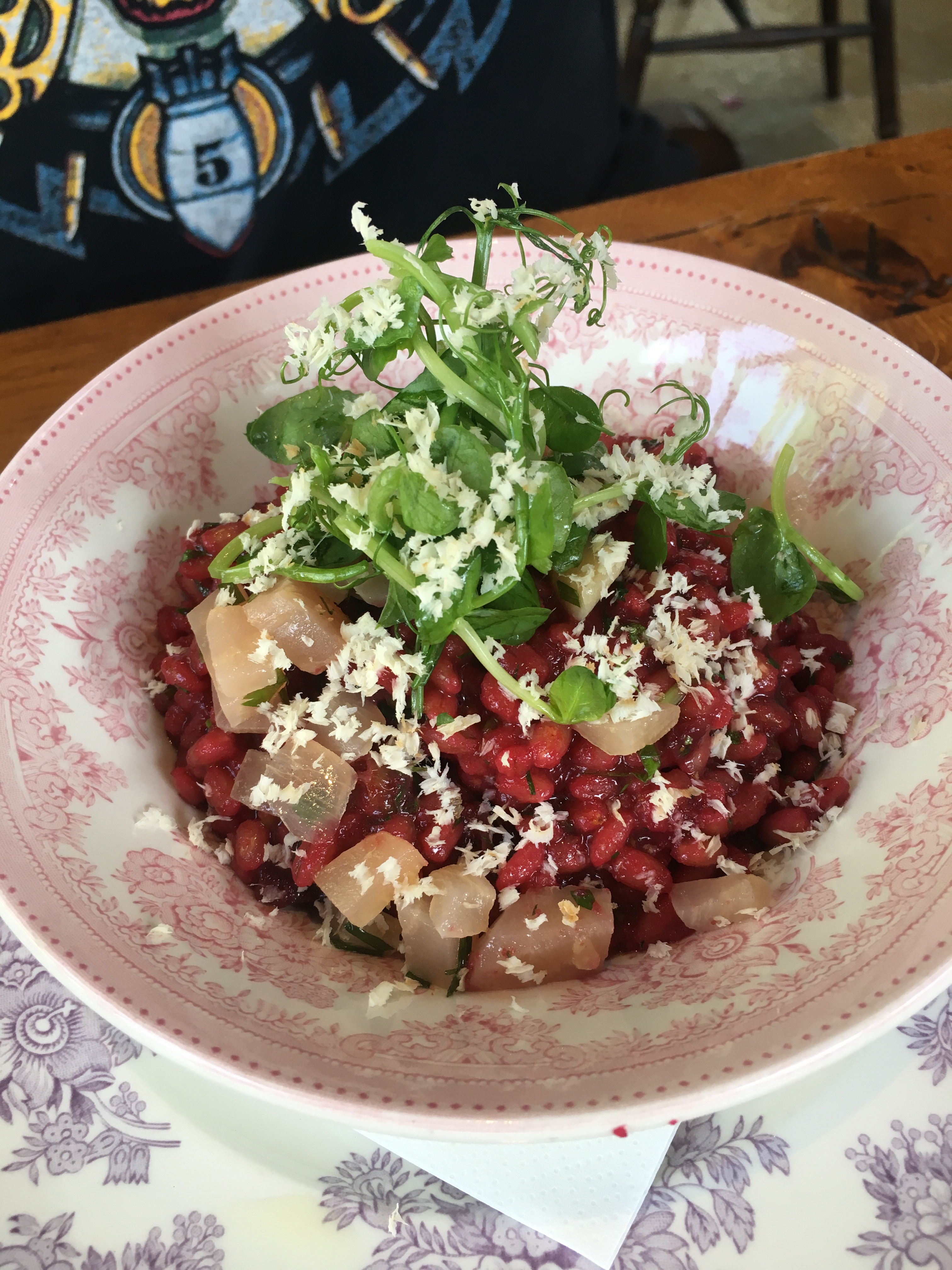 Jamie ordered the heritage beetroot pearl barley risotto as his starter, which is also available as a main course. The generous size bowl looked really beautiful in deep pink, with a pop of green from the pea shoots on top which added a bit of freshness. The beet flavour was punchy, with a slightly sweet earthiness. I really enjoy pearl barley in a risotto as the grains retain a nice bite, though the blended beetroot also added a creaminess to the texture. There was a sprinkling of vegan parmesan giving a bit of extra salty umami. All in all enjoyable, and we both agreed that the bowl full was very generous and particularly in the heat we wouldn’t have managed much more of it due to its richness.