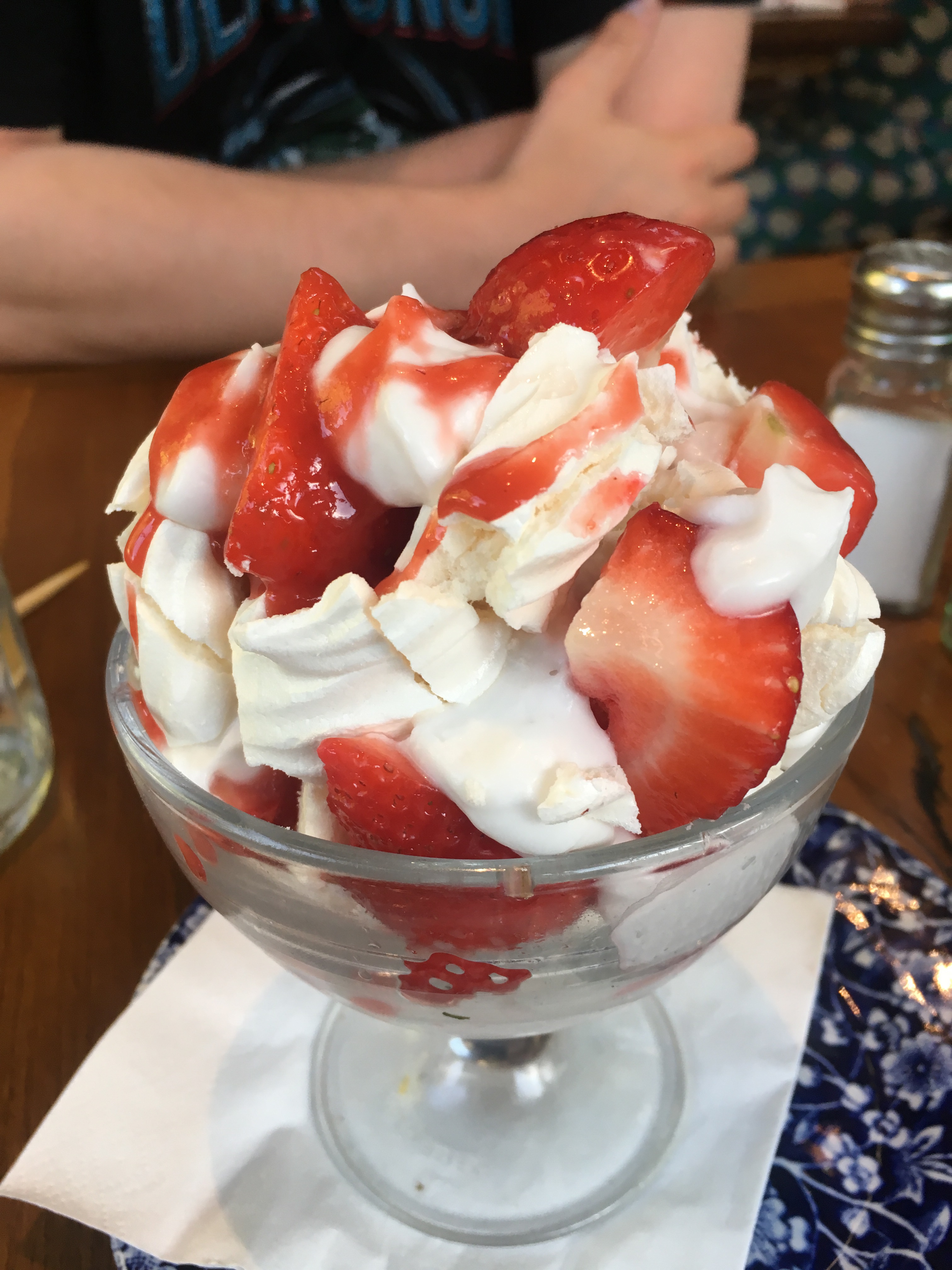 We were feeling really full so we decided to order a pudding between us. Alongside the seemingly obligatory sorbet, they offered ice cream by the scoop (today’s vegan flavour was salted caramel) and an interesting sounding strawberry and vanilla ice cream sundae. Not being one to turn down a decent vegan dessert, we opted for the latter. What arrived was basically like an Eton Mess, and congratulations because the team really nailed this dessert. I was sceptical it was even vegan with the crisp & chewy pieces of meringue scattered on top, and the creamy rich ice cream (I checked, they use Booja Booja). Topped with perfectly ripe and slightly tart strawberries which offset the sweetness of the sauce and cashew ice cream, this was a delight to eat, and part of me regretted having to share.