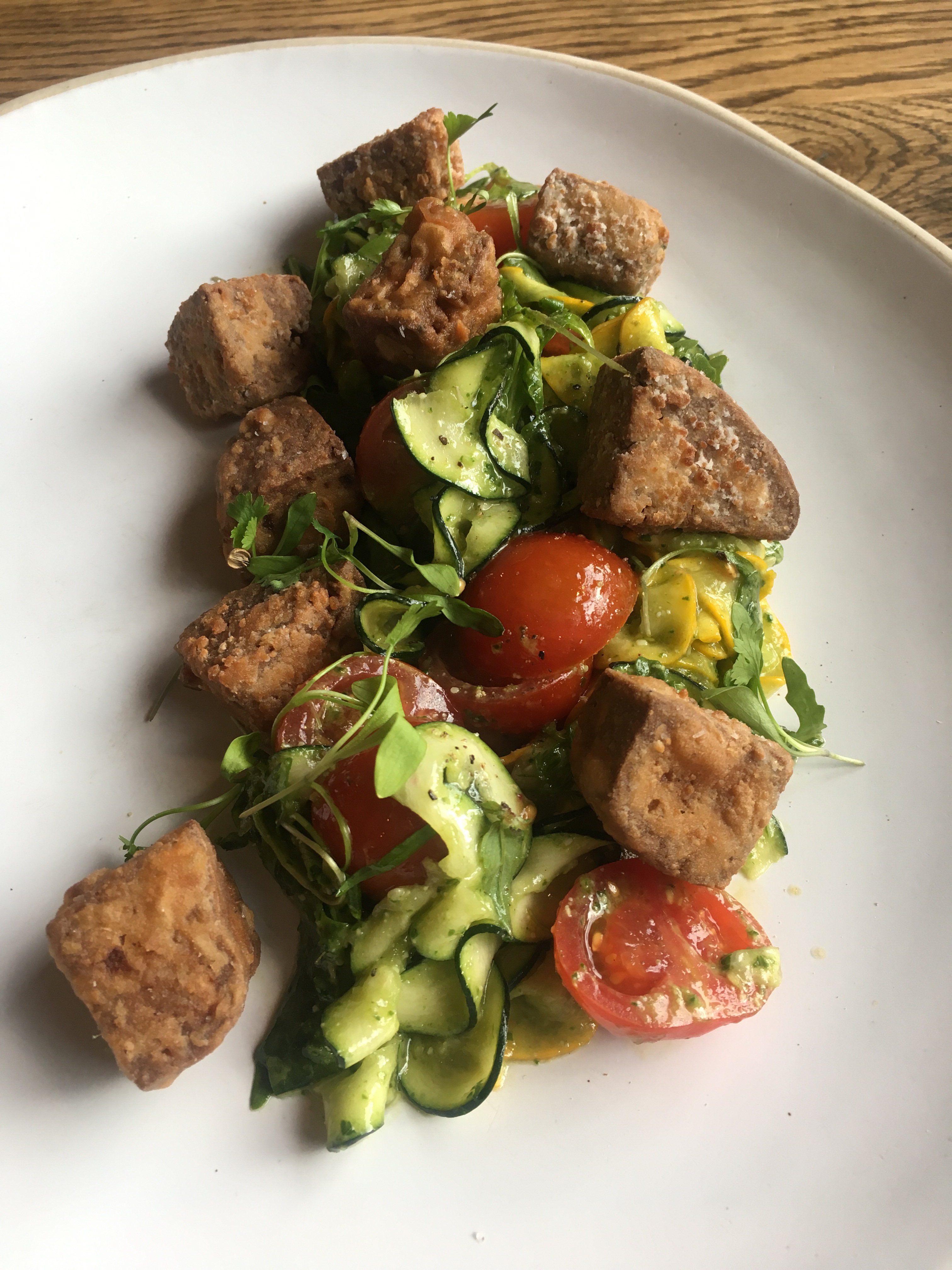 Jamie had ordered a small portion from the salad section of the menu for his starter, the soy and black pepper tofu salad. The fried tofu was so crispy on the outside, and the very salty soy gave it some of the best flavour we’ve ever tasted from tofu. The saltiness was contrasted so well by the other salad elements. Sweet yellow courgette and ripe, sweet cherry tomatoes were delicious alongside the tofu. Lashings of olive oil made everything taste buttery and again made it feel decadent for a salad. A handful of rocket just about lifted it from becoming too rich. We’d both had a wonderful start to our meals.