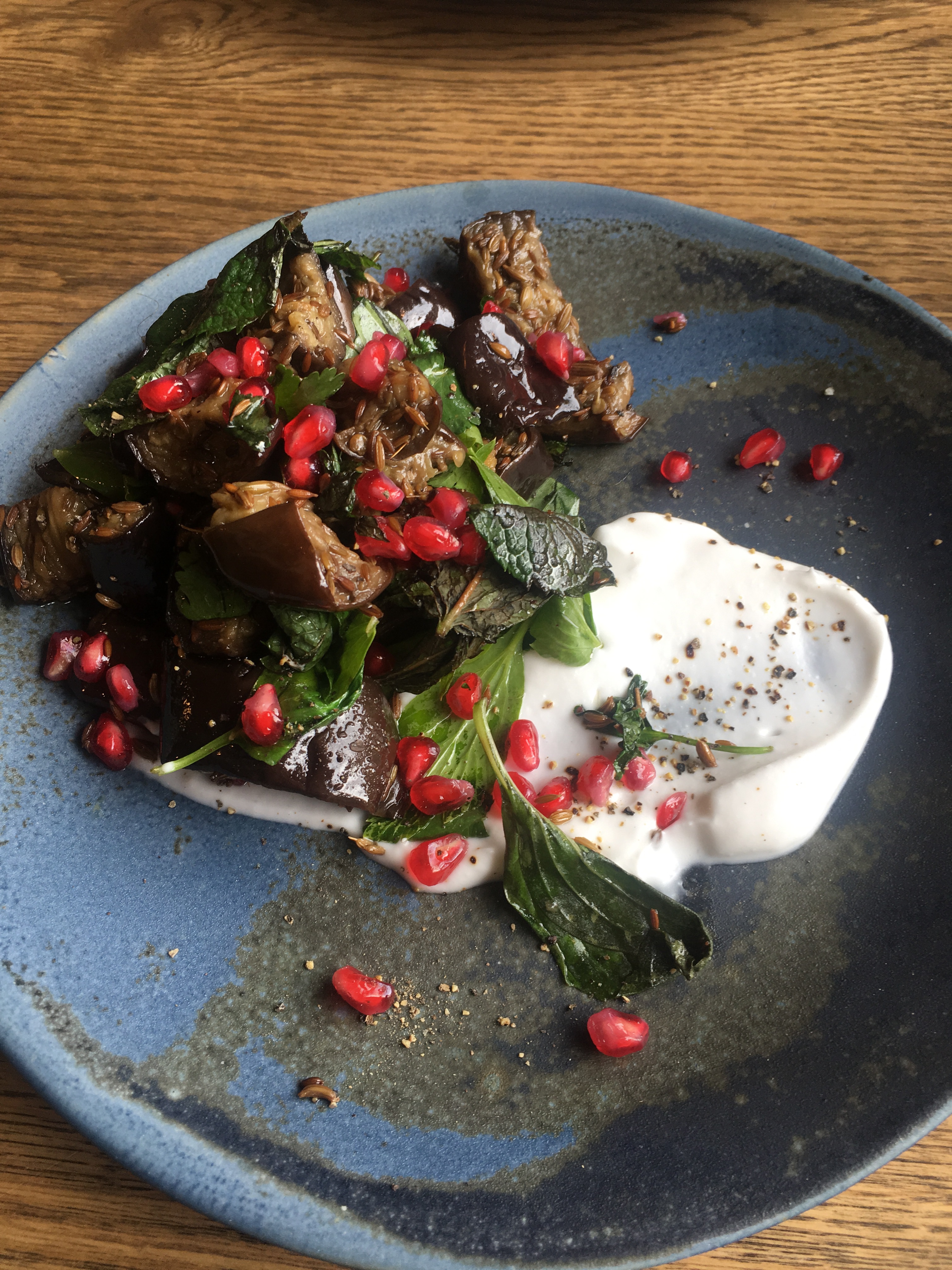 With so many vegan junk food options on the market at the moment – don’t get me wrong though, I do love them – it was really refreshing to see a menu where the vegetables sing. For my starter, I went for a roasted aubergine dish, which had sounded delicious and it’s one of my favourite ingredients. It was heavily coated in cumin and fennel seeds which made for a powerful aromatic flavour, paired with creamy coconut yoghurt. There were burst of freshness from pomegranate jewels, and some mint lifted the dish too so it didn’t feel too heavy. It was actually quite a rich-feeling dish for a salad.