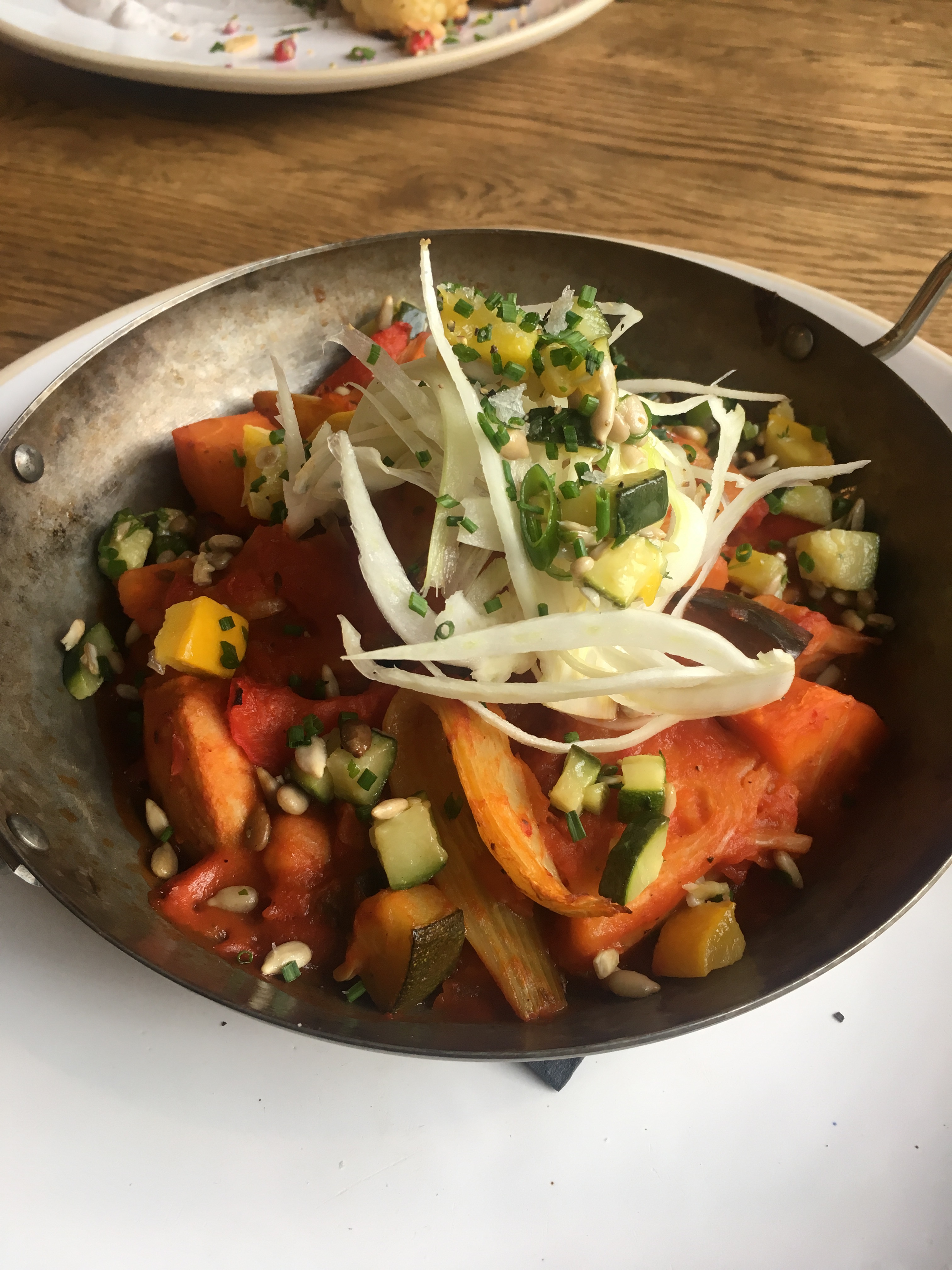 For the main course, I opted for the pan baked jackfruit. We were told this had become consistently one of the most popular dishes, with many people intrigued by this ingredient, unfamiliar to them. This was basically a vegetable and chickpea tagine type bowl with a rich, thick tomato sauce. All the veggies were beautifully cooked, with a variety of textures from some raw ones on top. It was such a hearty, warming stew, with the ‘meaty’ texture coming from the jackfruit that makes it so filling. The bowl is filled with a mixture of chunky and more finely chopped vegetables too which makes for a really nice eating experience. The richness of the sauce was complimented by the fresh fennel and a sprinkling of toasted seeds on top, all the flavours just working together so well. I loved this dish! I’d meant to order chips but forgot to, and needless to say I was fairly grateful that I hadn’t, because by this point in the meal I was getting very, very full.