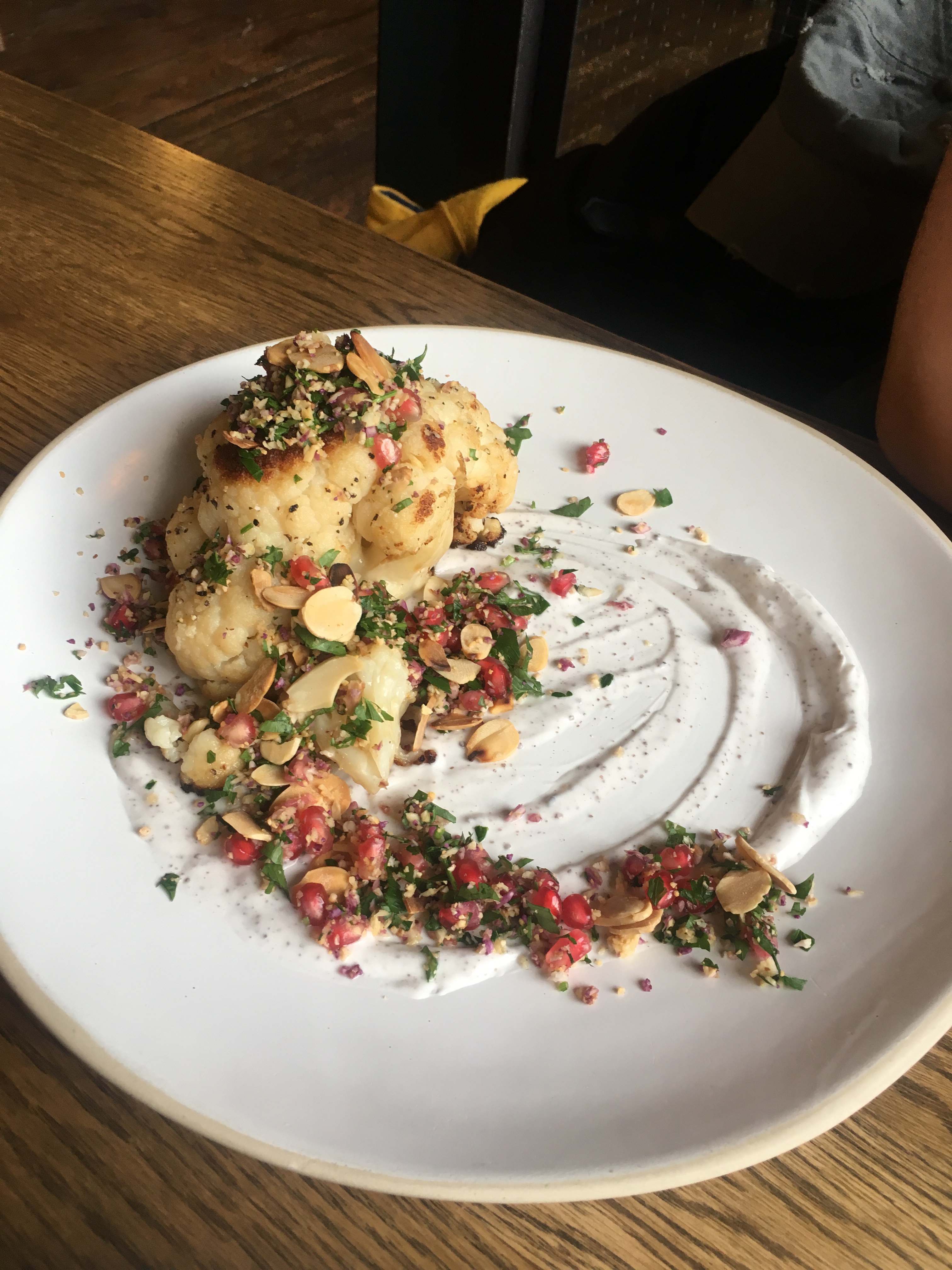The other vegan main course on the menu was a cauliflower steak, which had also sounded really interesting. When it came out, it was more a half a head of cauliflower than the ‘steak’ we were expecting, but that’s no bad thing at all considering the few calories that are in the vegetable compared to a meat alternative. It was nicely cooked to retain its texture, seasoned really well with lots of salt and pepper. The cauliflower itself had that slightly bitter flavour, and was topped with a wonderful nutty, minted tabbouleh. The almonds added a much-needed crunch to the dish, and it looked stunning. It was just the right size considering the amount of food we’d already eaten, too. Sadly I notice the cauliflower steak is no longer on the menu, perhaps linked to the cauliflower shortage we’ve had recently – which just shows how properly seasonal cooking is really.
