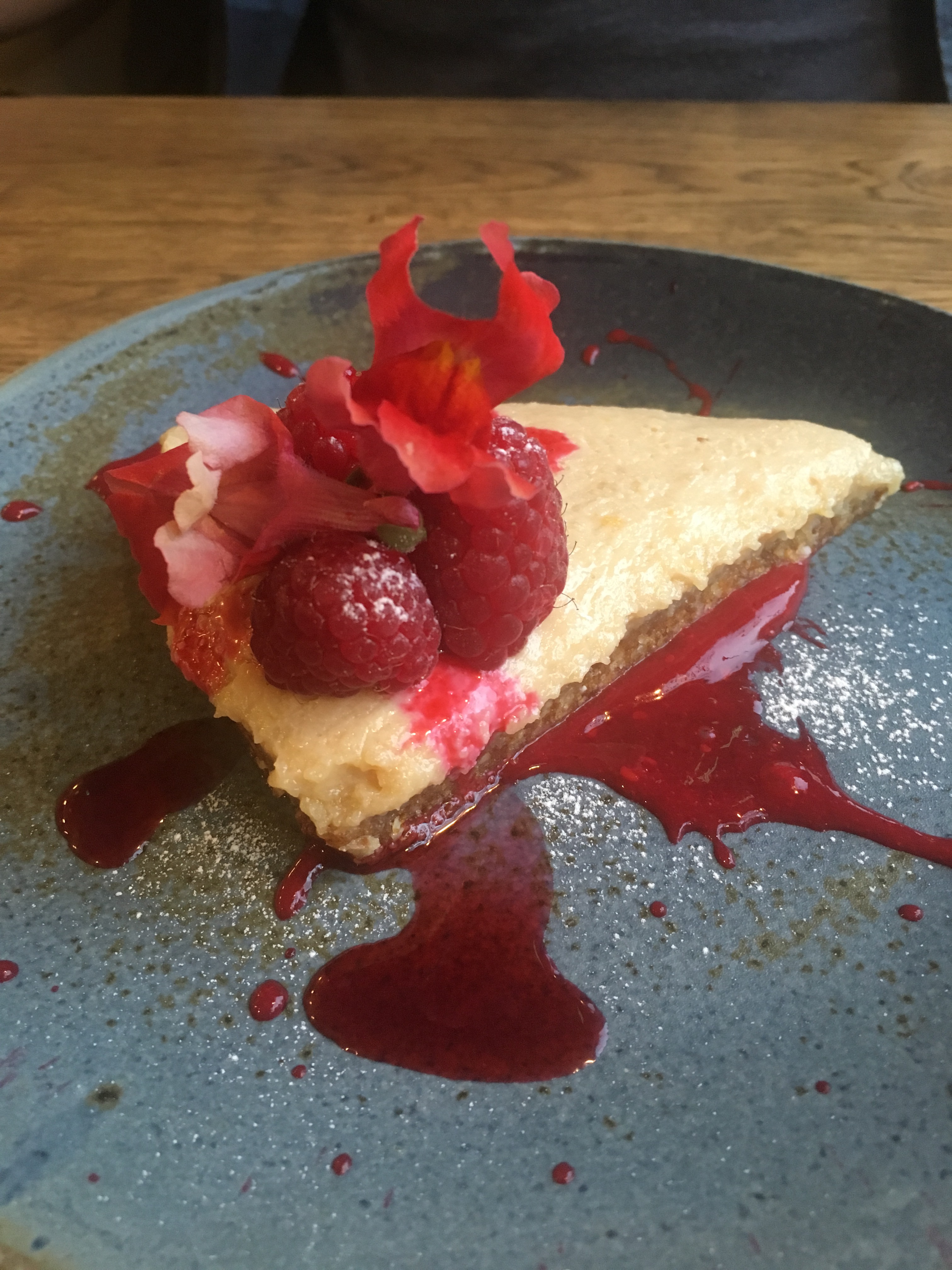 We managed to find room – just about – for pudding, and we couldn’t miss out because the Bicycle Shed’s vegan desserts sounded amazing. The cheese-free lemon cheesecake consisted of an almond and date base, topped with a cashew and coconut ‘cheese’. It was so sweet and almost caramel-like with that creamy topping, which had just a hint of lemon and wasn’t overpowering. The really tangy raspberry served with it helped to offset the sweetness. I am not a big fan of ‘raw’ desserts but this was so elegant yet indulgent, I would certainly order it again.