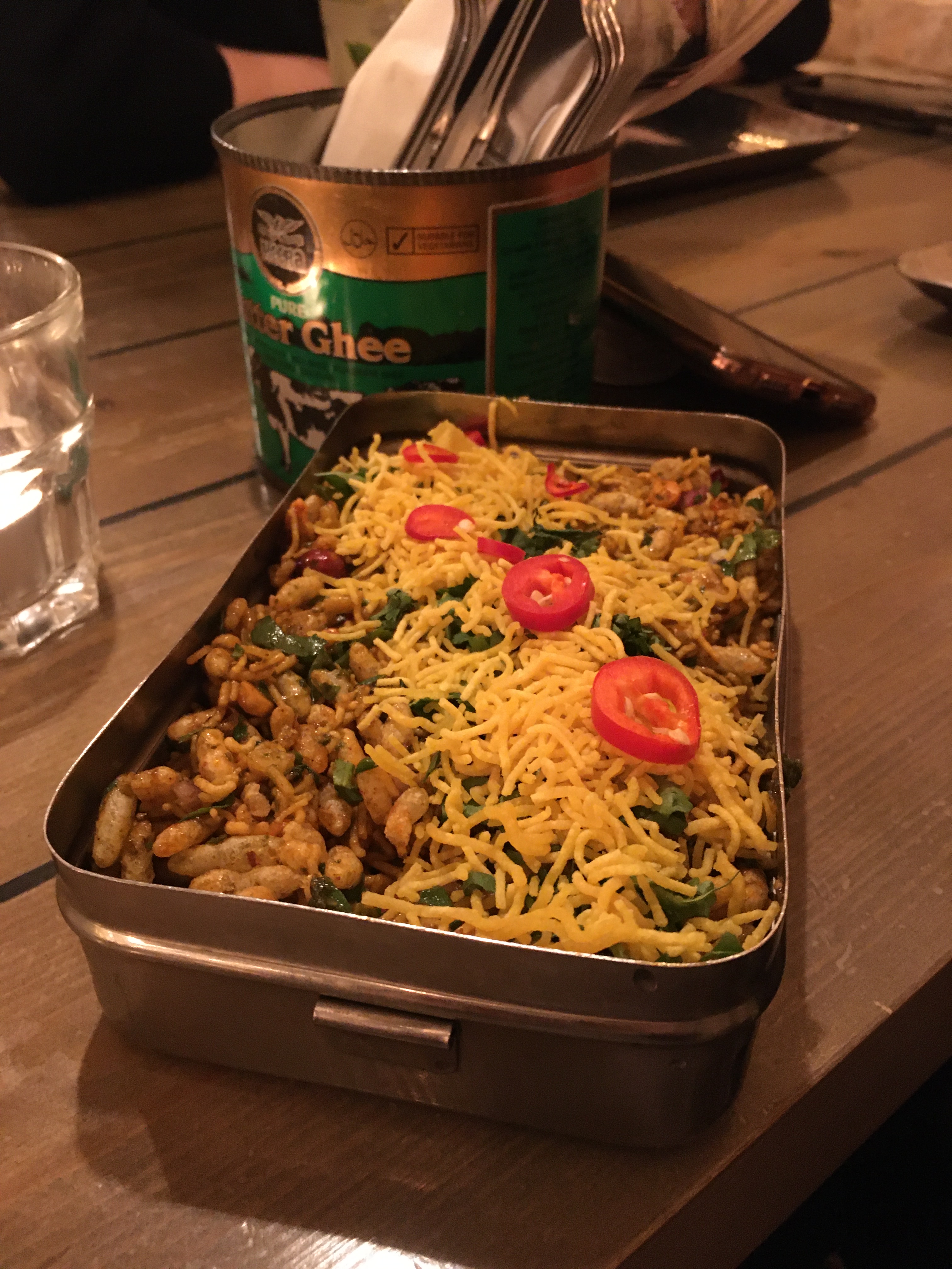 Between us there were a couple of items ordered from the street food section of the menu, which came out first. My friend Amy’s Bhel Puri was a rather large pot of puffed rice, with a hint of peanut. It was topped with gram threads, adding another interesting texture and a slight curried flavour. The dish had a sprinkling of coriander and small chilli slices on top but sadly it was a bit of an uninspiring start to the meal, with the flavours just lacking something. We felt it could’ve had something added so it was less dry, as it was kind of like a crunchy, savoury cereal without any milk.
