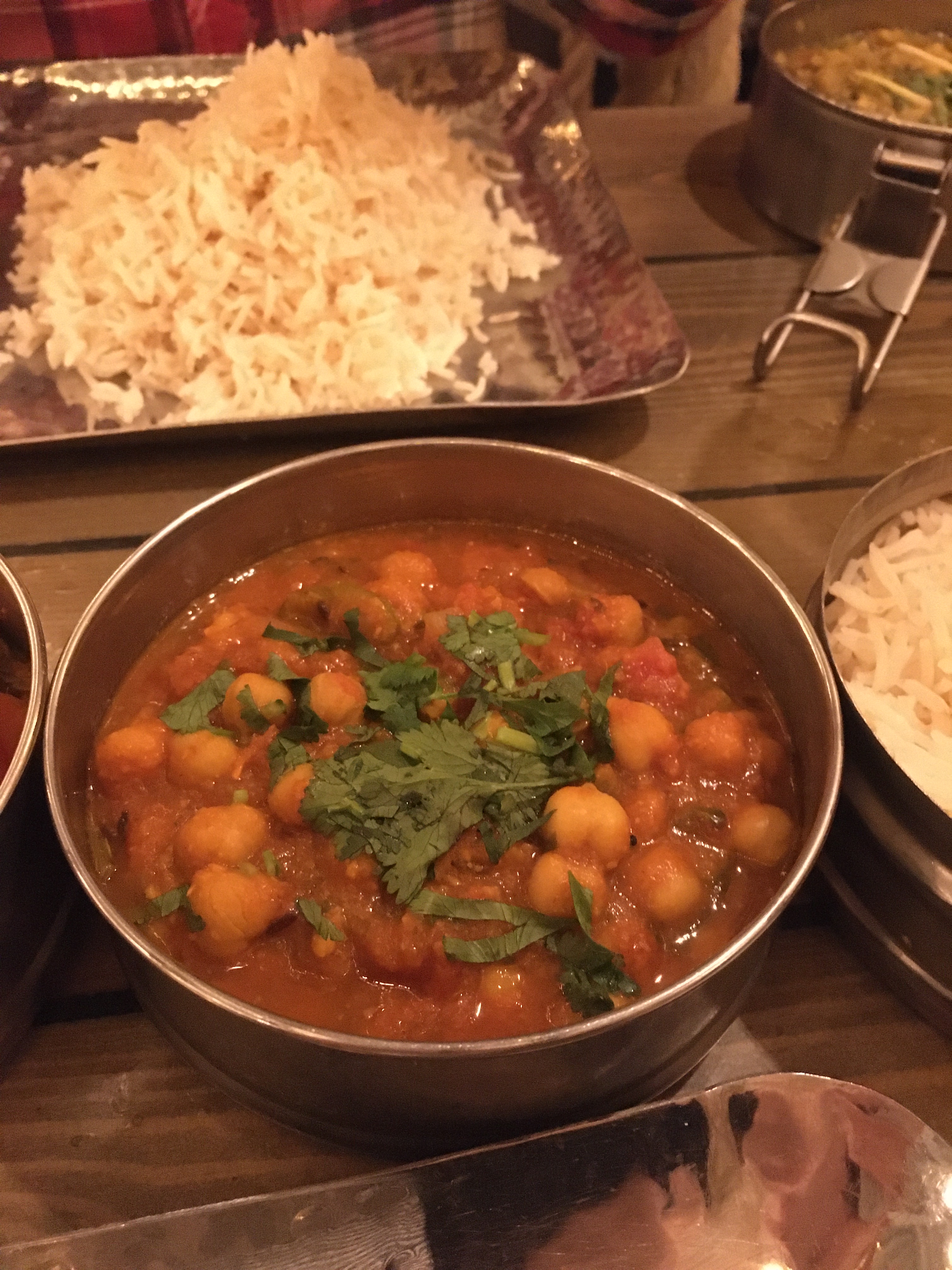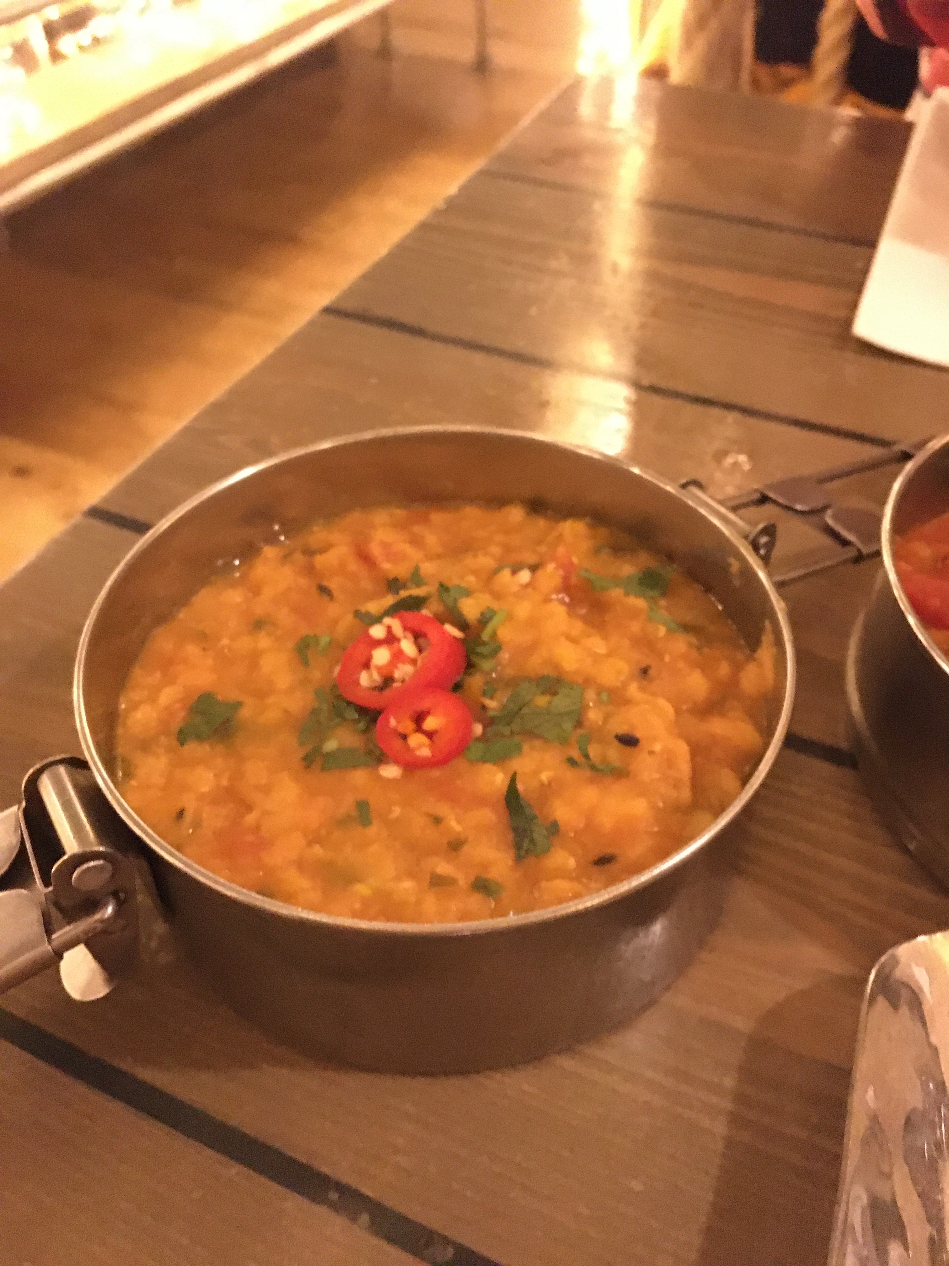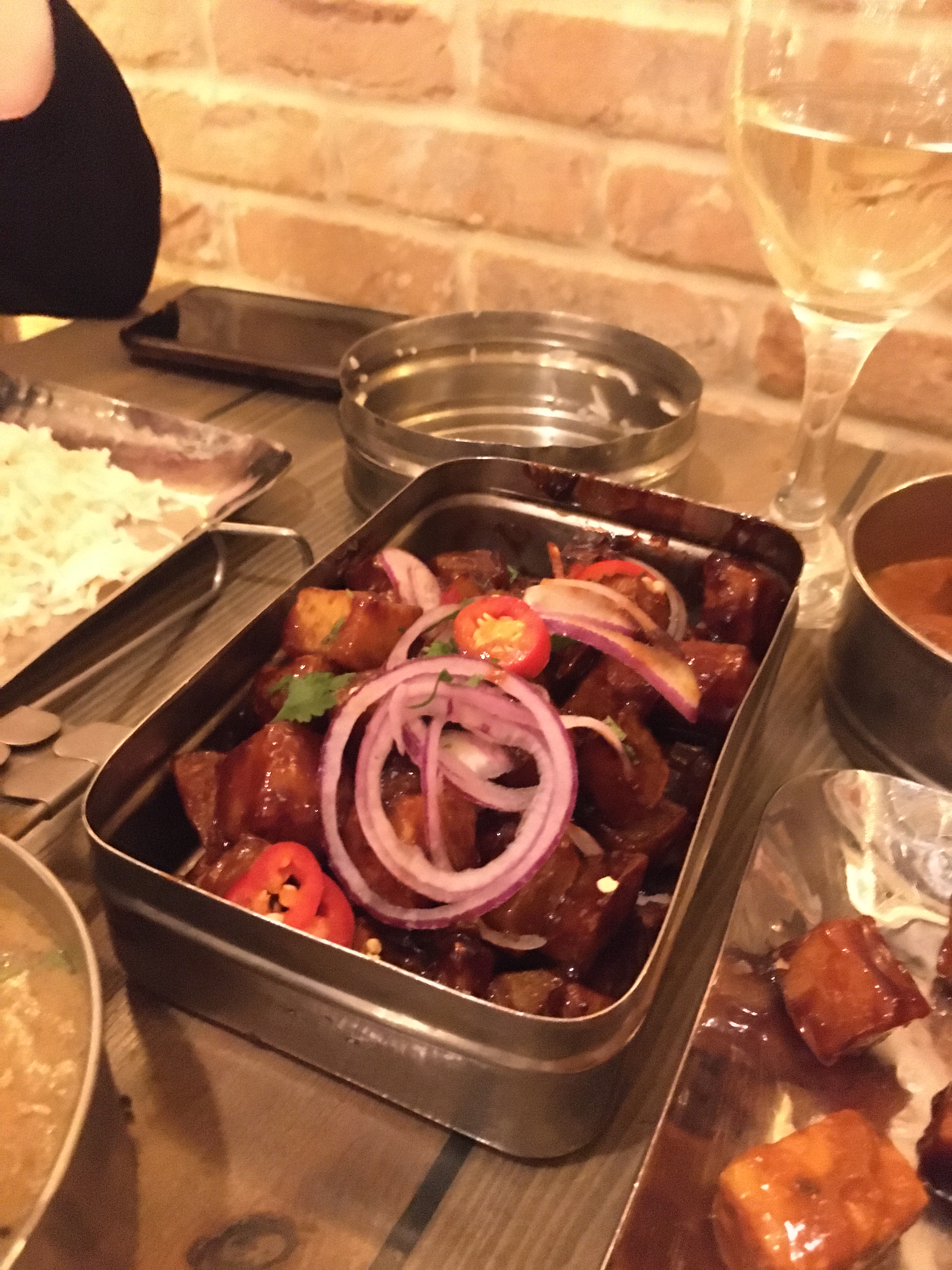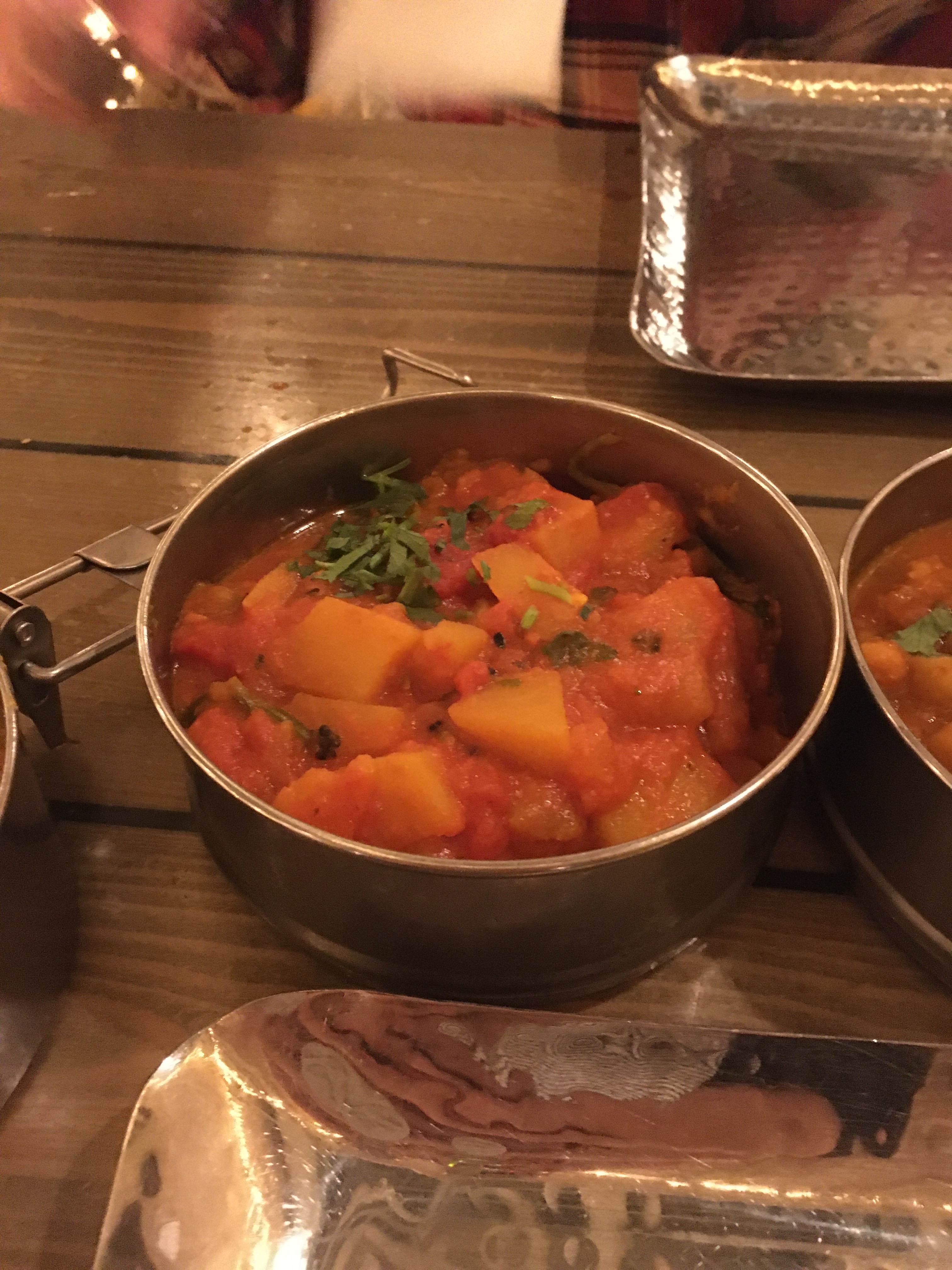 I’d ordered the vegan Indian School Tiffin for myself. This is an ideal option for someone like me who isn’t a fussy eater but is very bad at making decisions – they decide for you what mixture of veggie curries and carbs you’re going to get. Confident that everything would be delicious, I don’t mind that at all, as it’s also a great value option compared to ordering four tapas style dishes separately at £14. The presentation is fun with the traditional stack of metal bowls, placed down in front of you to reveal each menu item you’ve been served one by one. The first curry I scooped onto my plate was the tea-steeped chickpeas. Stewed in a Darjeeling tomato sauce, this curry had a real kick to it, but not so much that you couldn’t taste the interesting flavours coming through. I liked the bite from the chickpeas adding a bit more texture to my plate too.