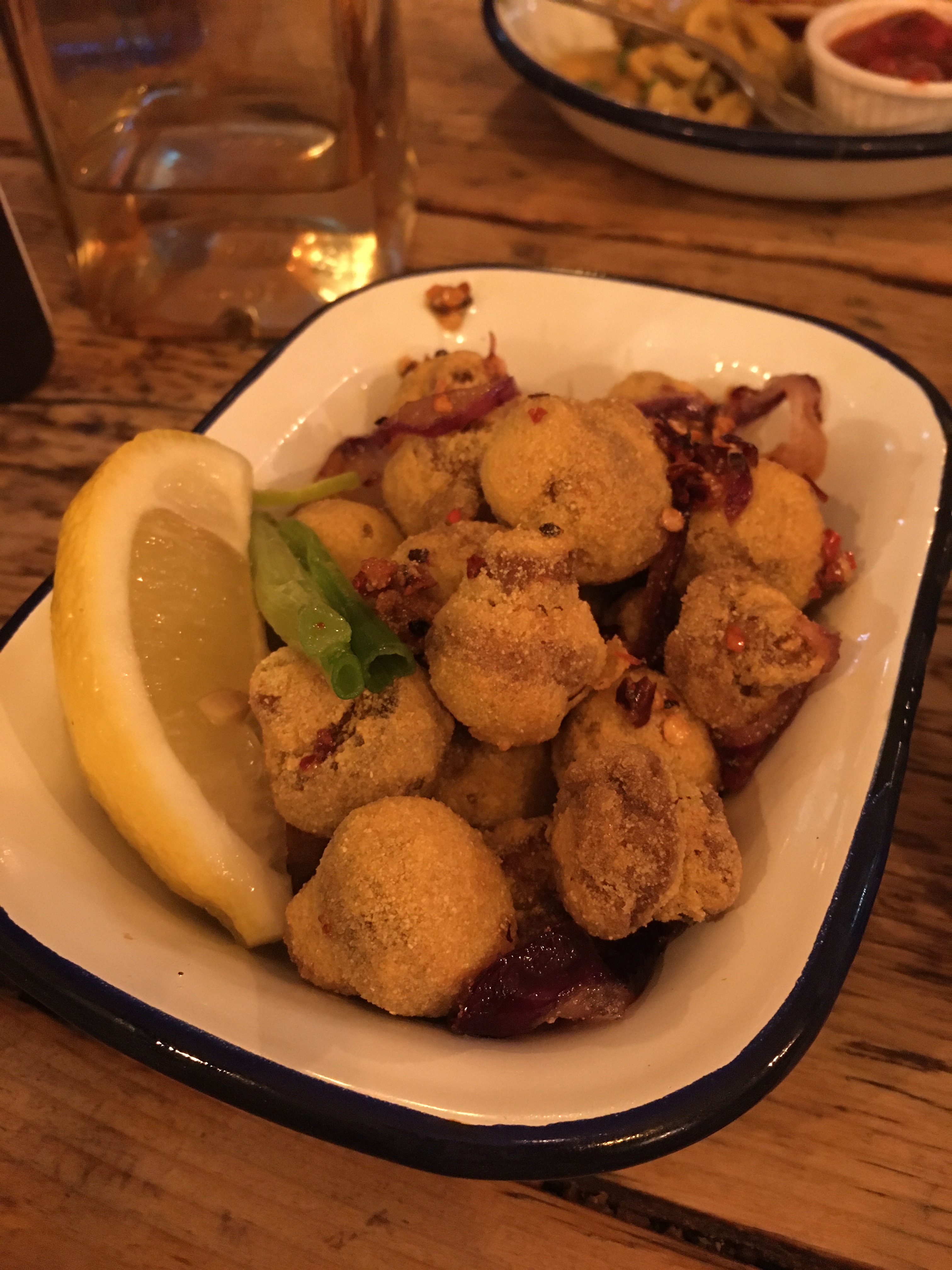 IMG_9096The food menu gets refreshed reasonably regularly, and I was excited to see a couple of new dishes that I hadn’t yet tried. Between Jamie and myself we ordered a good handful of vegan dishes (all clearly labelled and there’s an abundance of them, thank you very much) to enjoy along with our drinks. It even took us a while to decide what cocktails to order! They seemed less clear about which cocktails were vegan compared to the food, but our waiter kindly went and checked every single cocktail to confirm with us which ones were vegan-friendly. You might want to cross-check yourself with Barnivore as I’m not sure how they could’ve possibly checked whether all the ingredients were vegan in that space of time… anyway, the effort was there. I went for one that I was very sure was vegan, the mojito, which you can choose to be flavoured with a couple of different options, the recommended being coconut (of course) so I went for that. It was very sweet, a bit reminiscent of a pina colada with the super coconutty flavour. It had me feeling the holiday vibes, even on a cold dark night in Oxford.
