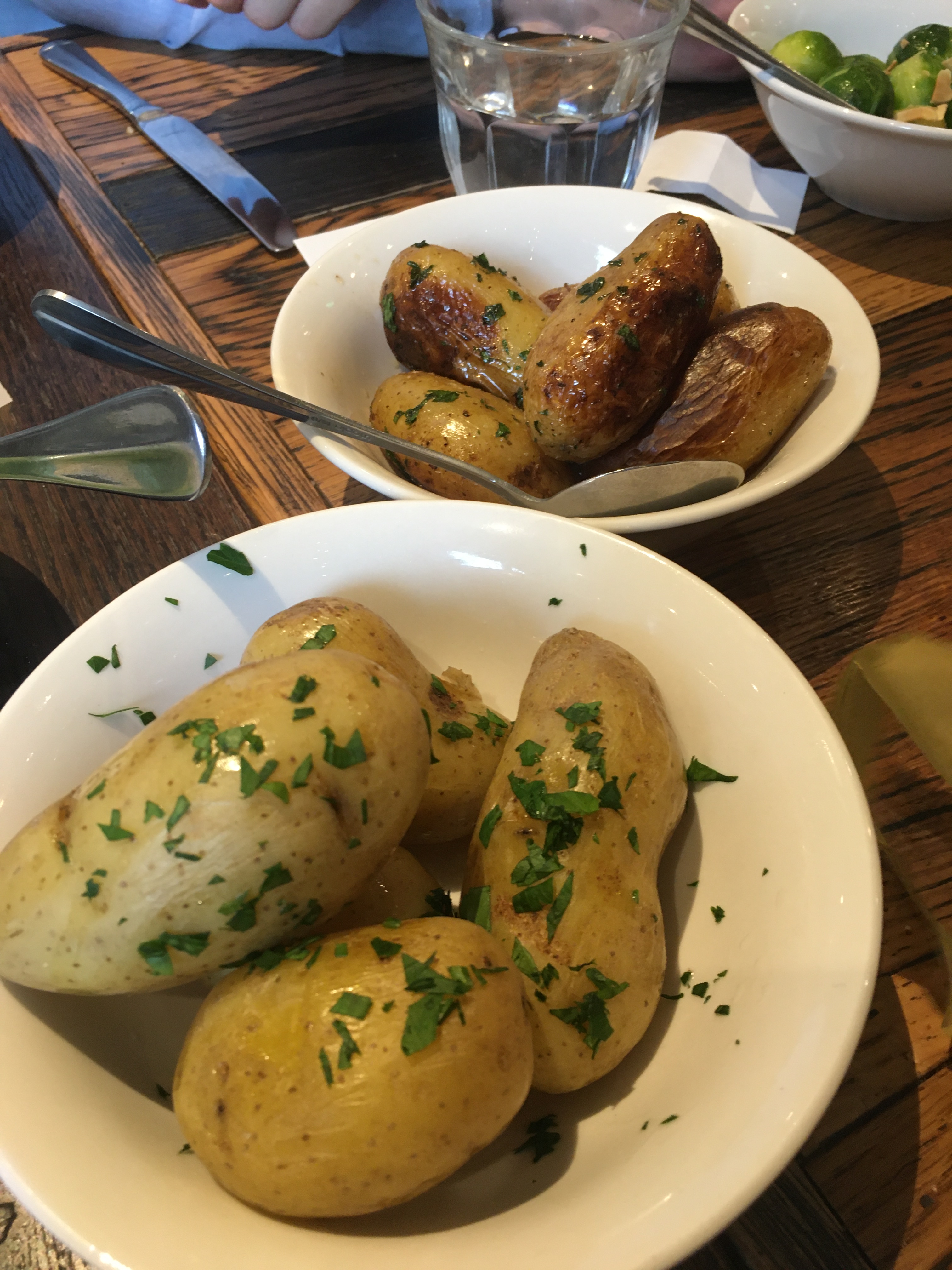 It was nice that they were attentive to the fact that I was vegan, and where everyone else’s meals were served with seasonal vegetables, they brought out separate, unbuttered bowls for myself. Both looked a little sad compared to the non-vegan counterparts (haven’t they heard of olive oil)? The sprouts were decent enough, thankfully not boiled to oblivion, although it felt like a very random addition to my main. Then there were some plain boiled potatoes. I had one but I really question why potatoes are served as a ‘vegetable’ side dish when everyone’s main course already involved mashed potato or some other substantial carbohydrate source. We all thought green beans or carrots or some other traditional Christmassy accompaniment would’ve made more sense.