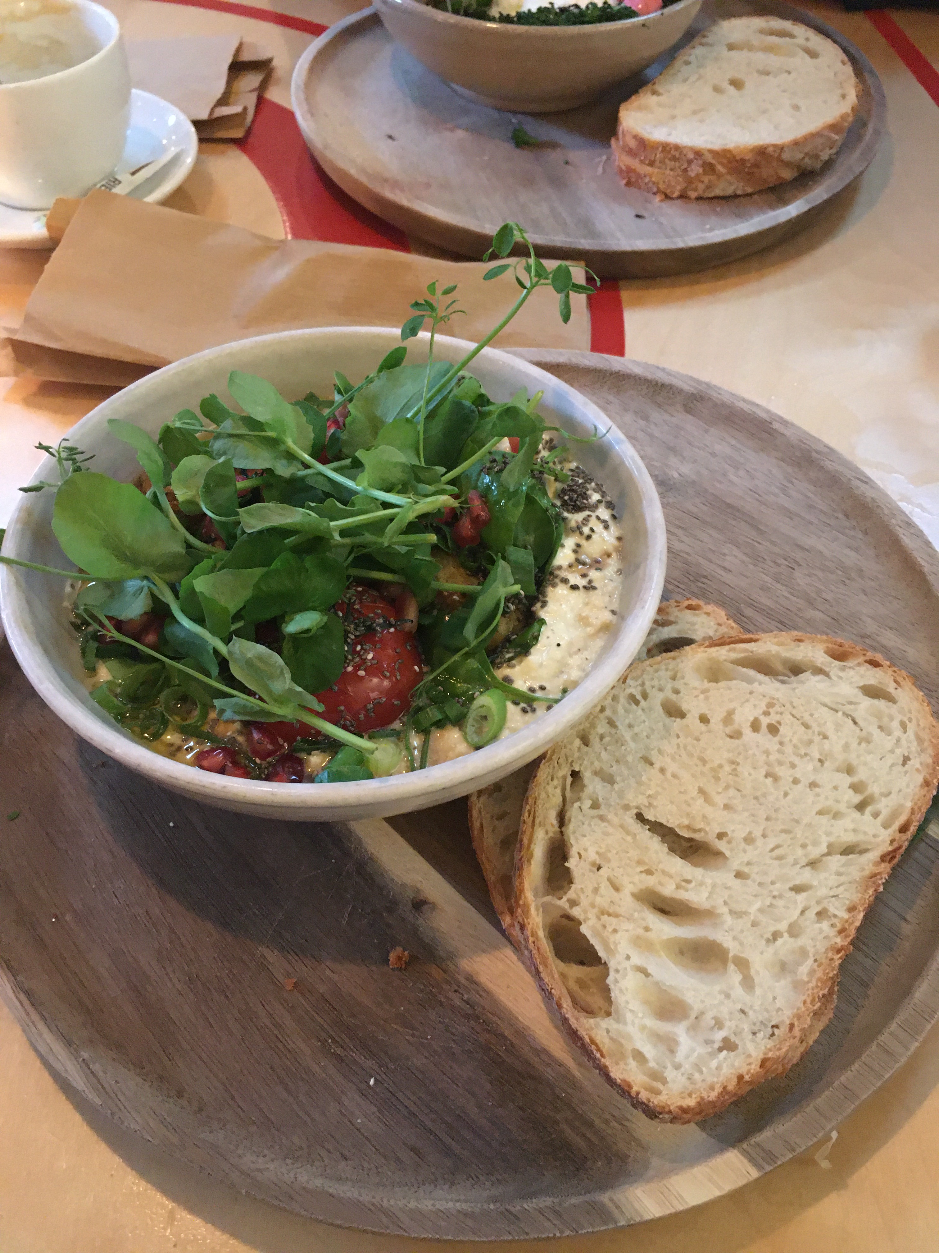 Another spot where we timed it perfectly, the queue about twenty minutes after we’d sat down was possibly the longest queue I’ve ever seen at a restaurant! This place is huge too, spanning three floors, with a really relaxed and comfy atmosphere. There were a couple of pretty interesting sounding vegan options, with super clear labelling throughout the menu. I went with the ‘All-Day Vegan’ which I really thought was going to be like a vegan version of a traditional English breakfast, but it was so far from that! It came as a bowl of soupy coconut-poached silken tofu (I don’t know how to make that sound nice but it was actually really tasty, kind of like a loosely cooked scrambled egg in texture) filled with tomatoes, potato, pomegranate seeds and topped with salad. On the side were a couple of pieces of sourdough to dunk in the comforting bowl. I don’t think I’ve eaten anything like it before, and I was happy to have tried it! Definitely a great way to get lots of protein in before a day of sight-seeing.