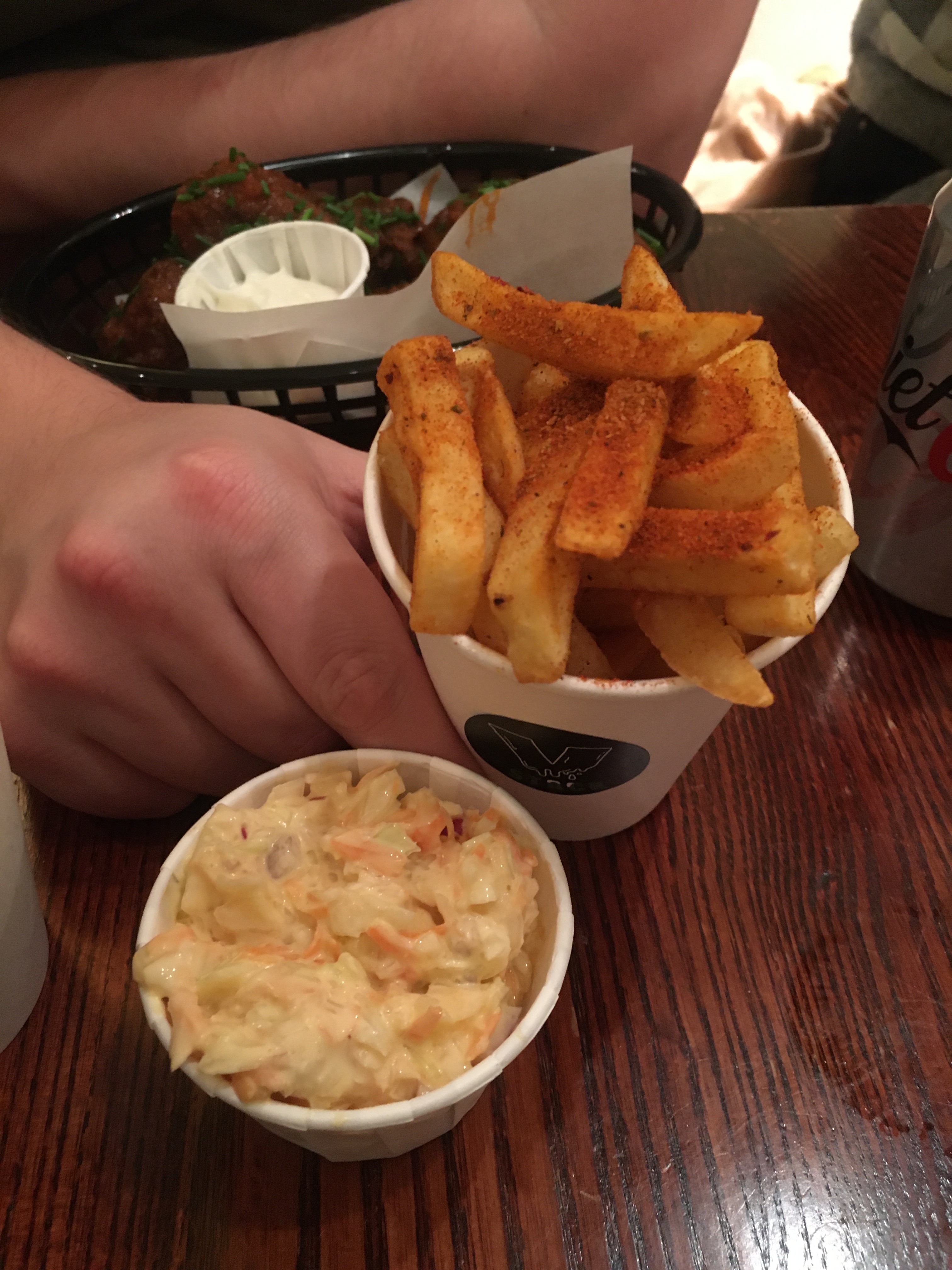 Jamie decided to order the cauliflower wings, served in a basket with a pot of vegan mayo. The portion size was very generous for the price, with a large handful of wings and a side of fries sold at only £6. The wings were smothered in a pretty spicy hot sauce, so not for the faint-hearted, but we both thought they were delicious. The texture was wonderful to bite into, and the cauliflower absorbed so much flavour. The side of fries with cajun spices had just the right amount of salt for me, and again, the seasoning was excellent.